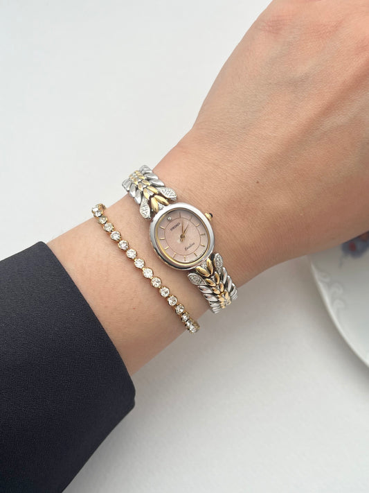 Seiko Exceline Ladies Oval Watch with Stardust Salmon Dial and Diamond Leaf Bracelet