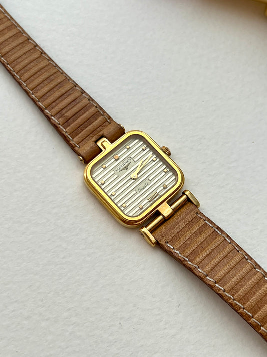 Longines Gold Cushion Womens Watch With Textured Bezel