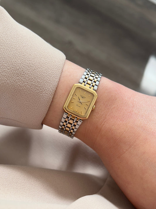 Longines Gold Toned Rectangular Womans Watch with Intricate Details