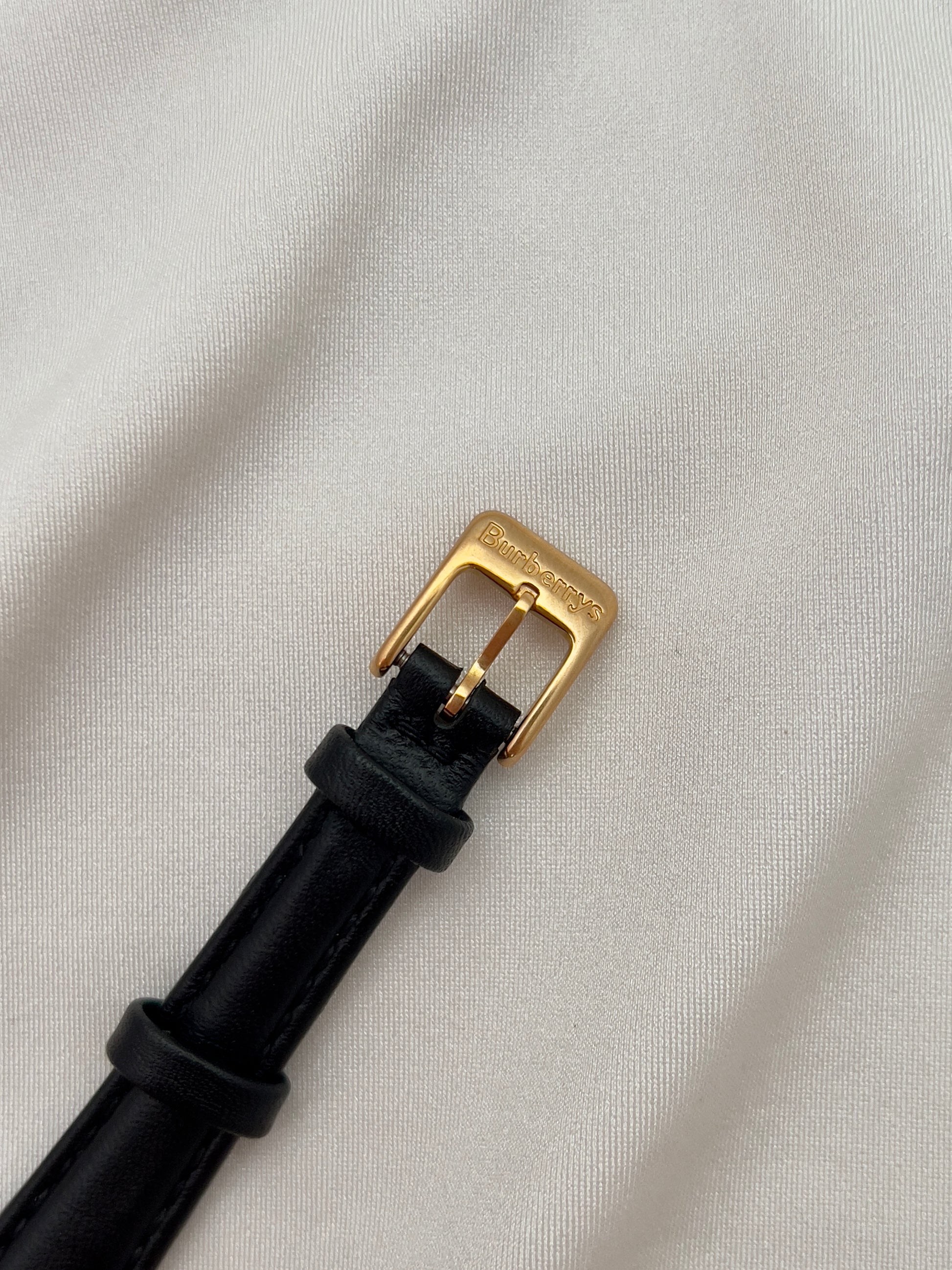 This Burberrys ladies’ watch exudes refined opulence, showcasing a timeless tank case in polished gold-tone with elegant curved lugs. Its slim profile frames a delicate pink-white dial, where bold Arabic numerals and the iconic equestrian knight emblem stand as hallmarks of the brand’s heritage.