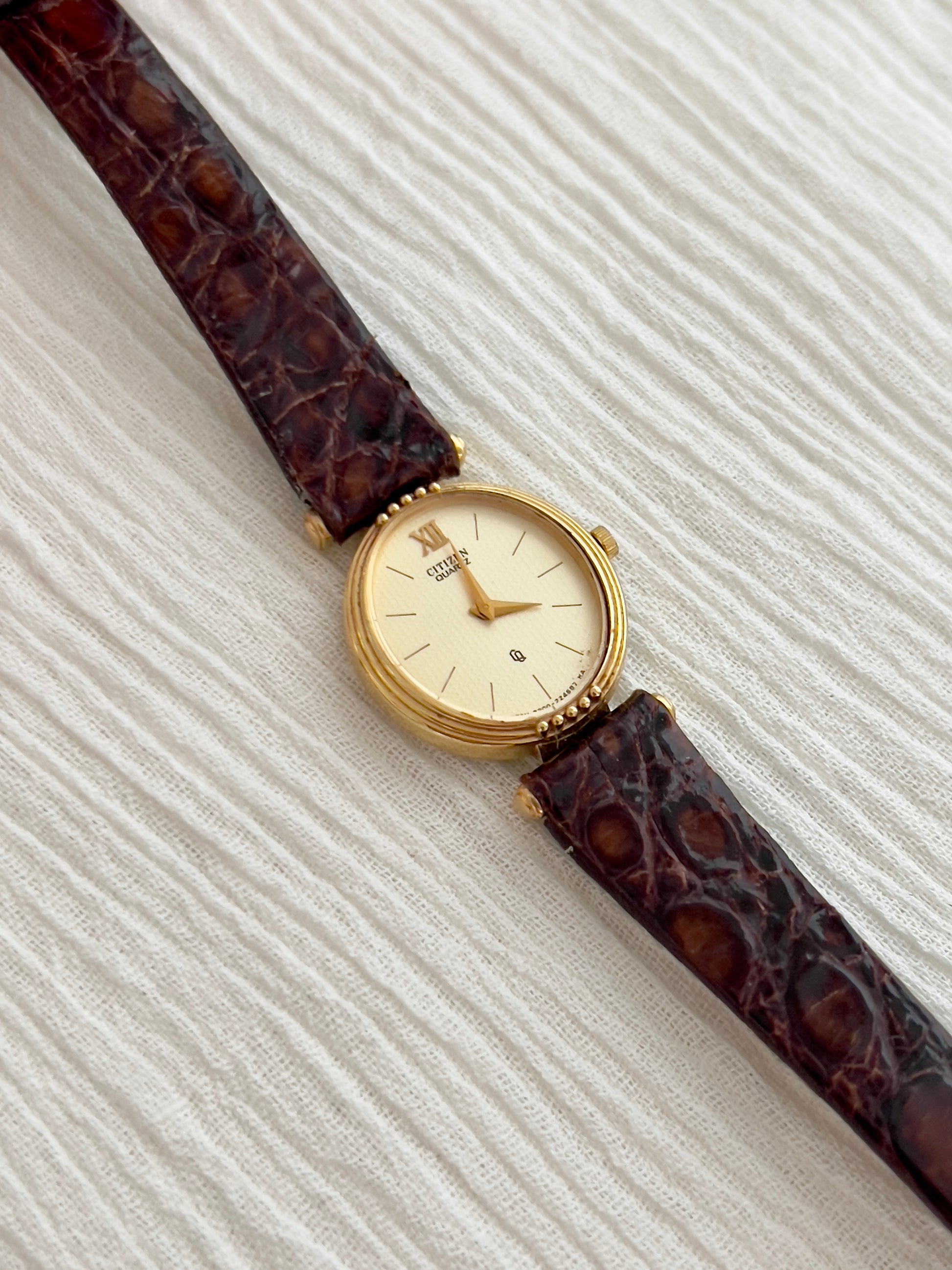 This Citizen captures the poetry of understated luxury. The round gold case is framed by a fine beaded bezel, its subtle texture adding quiet depth to the watch’s warm gleam. Beneath the crystal lies an ivory guilloche dial, softly patterned to catch the light, marked with a single Roman numeral at twelve