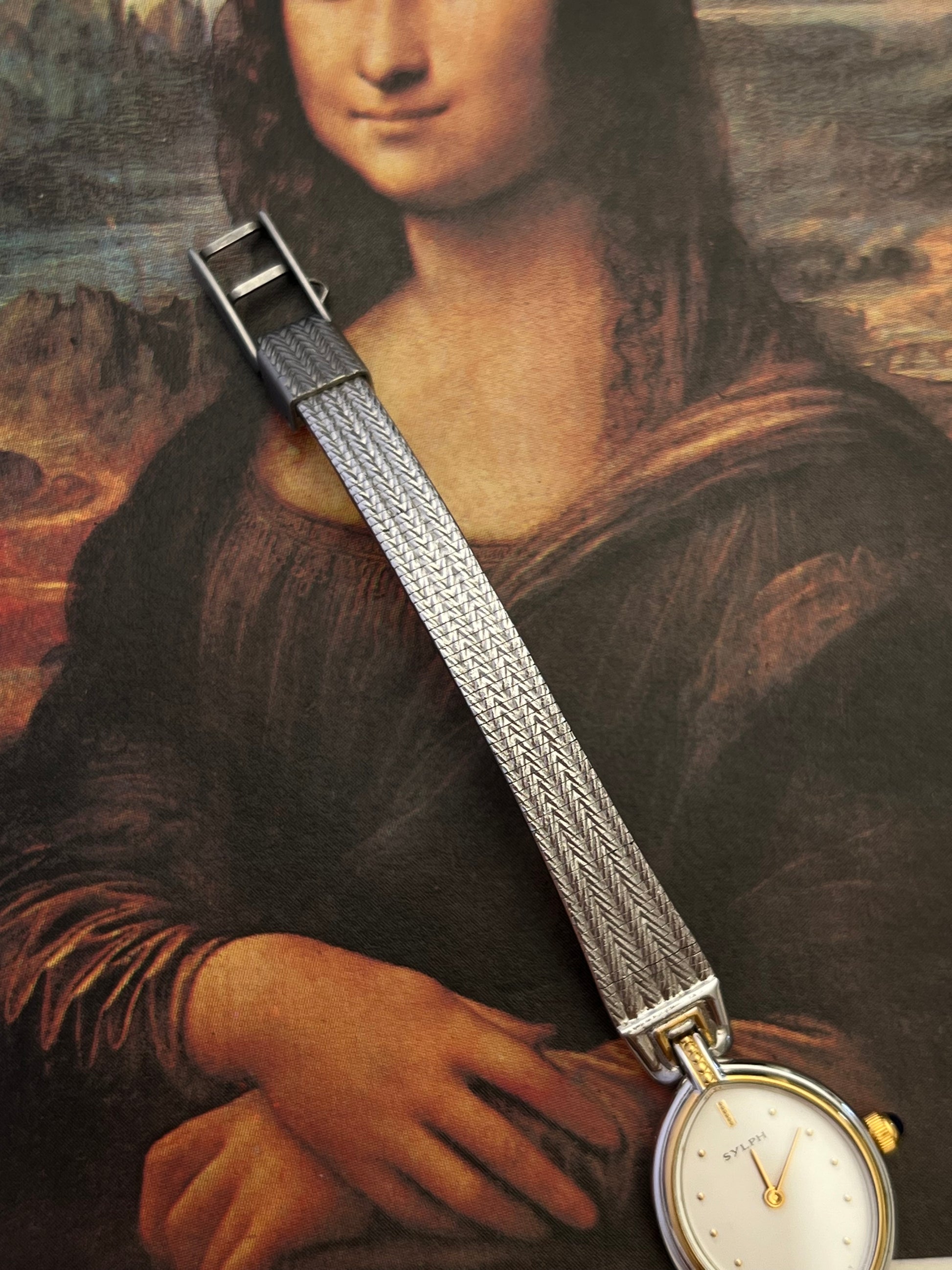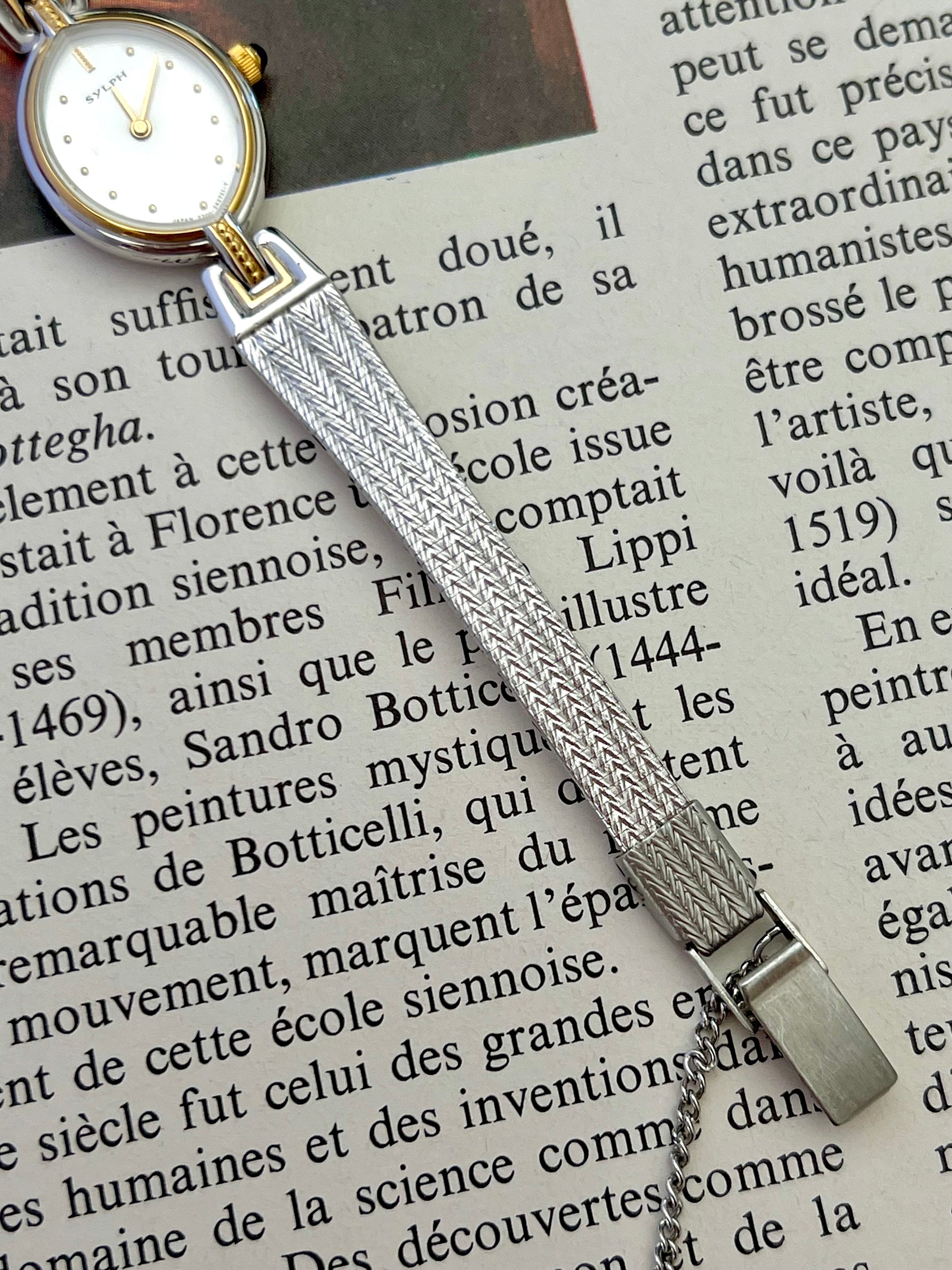 A refined oval Sylph with a crisp silver dial, tiny gold stud markers, and a blue cabochon crown. Finished on a two-tone, textured bracelet that wears like jewellery.