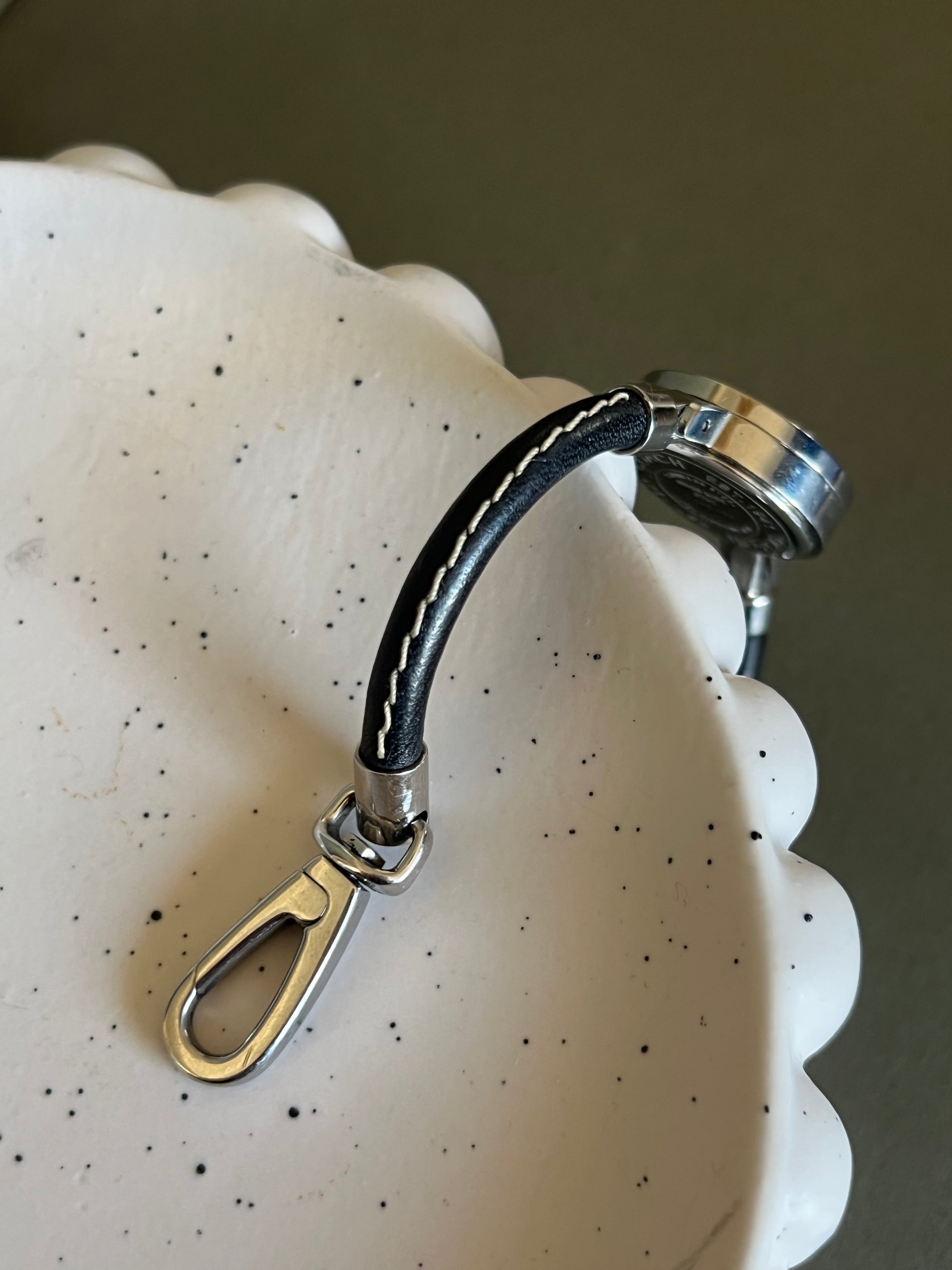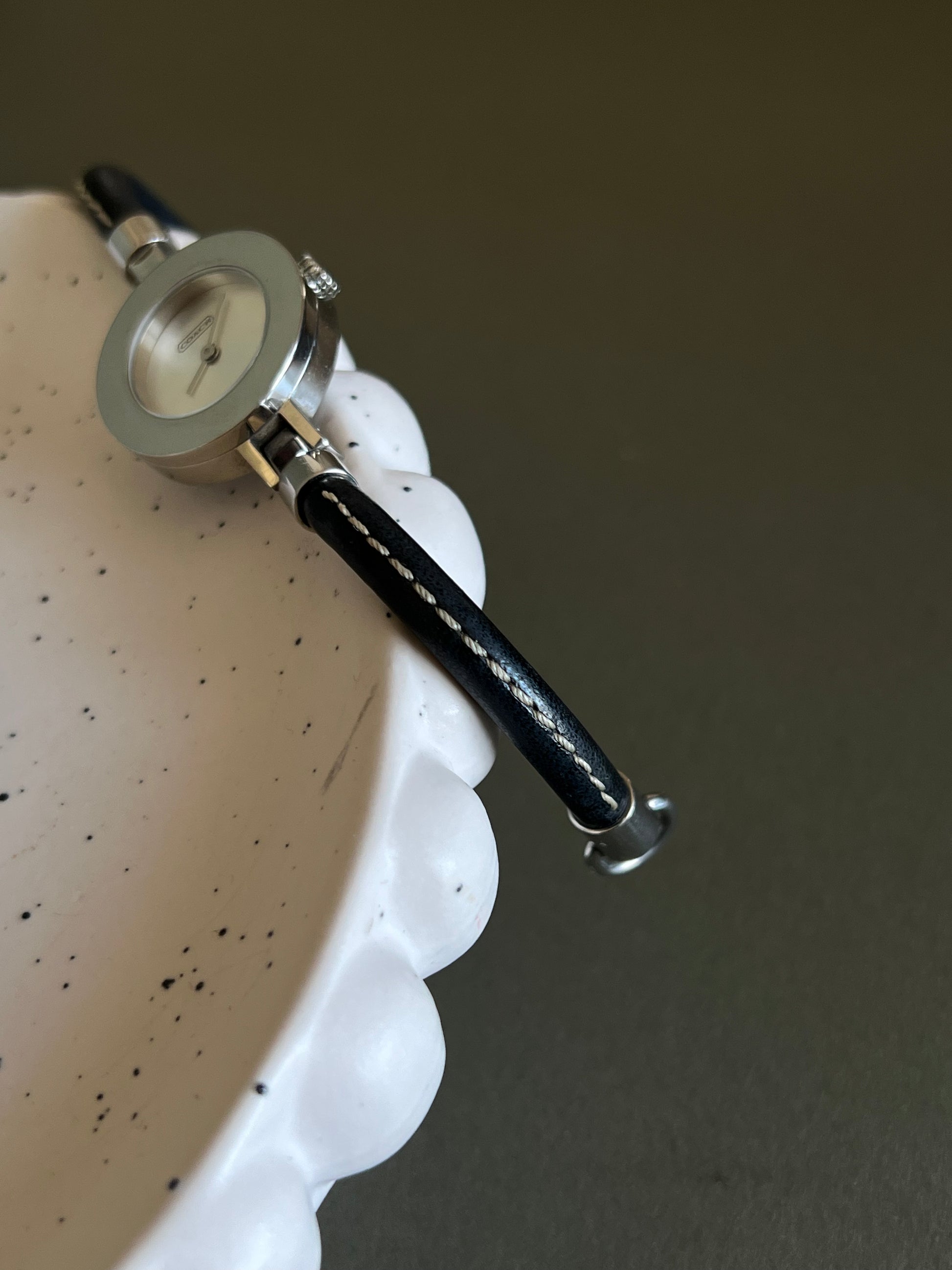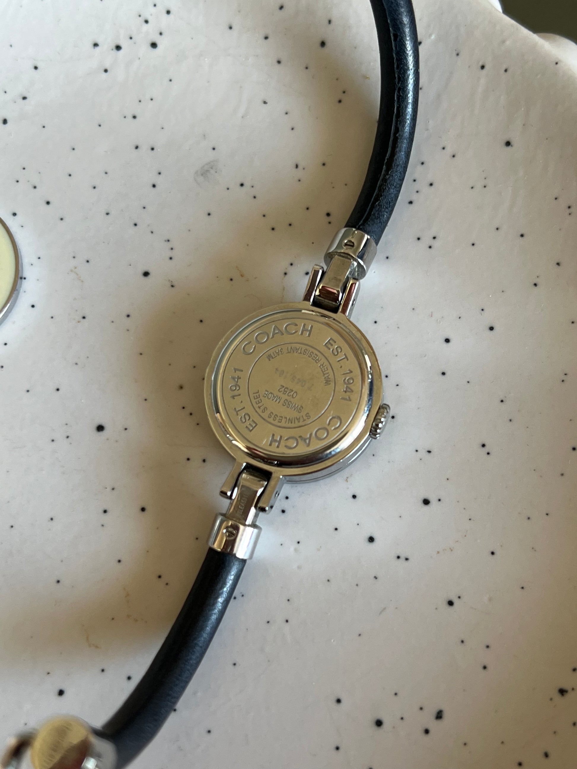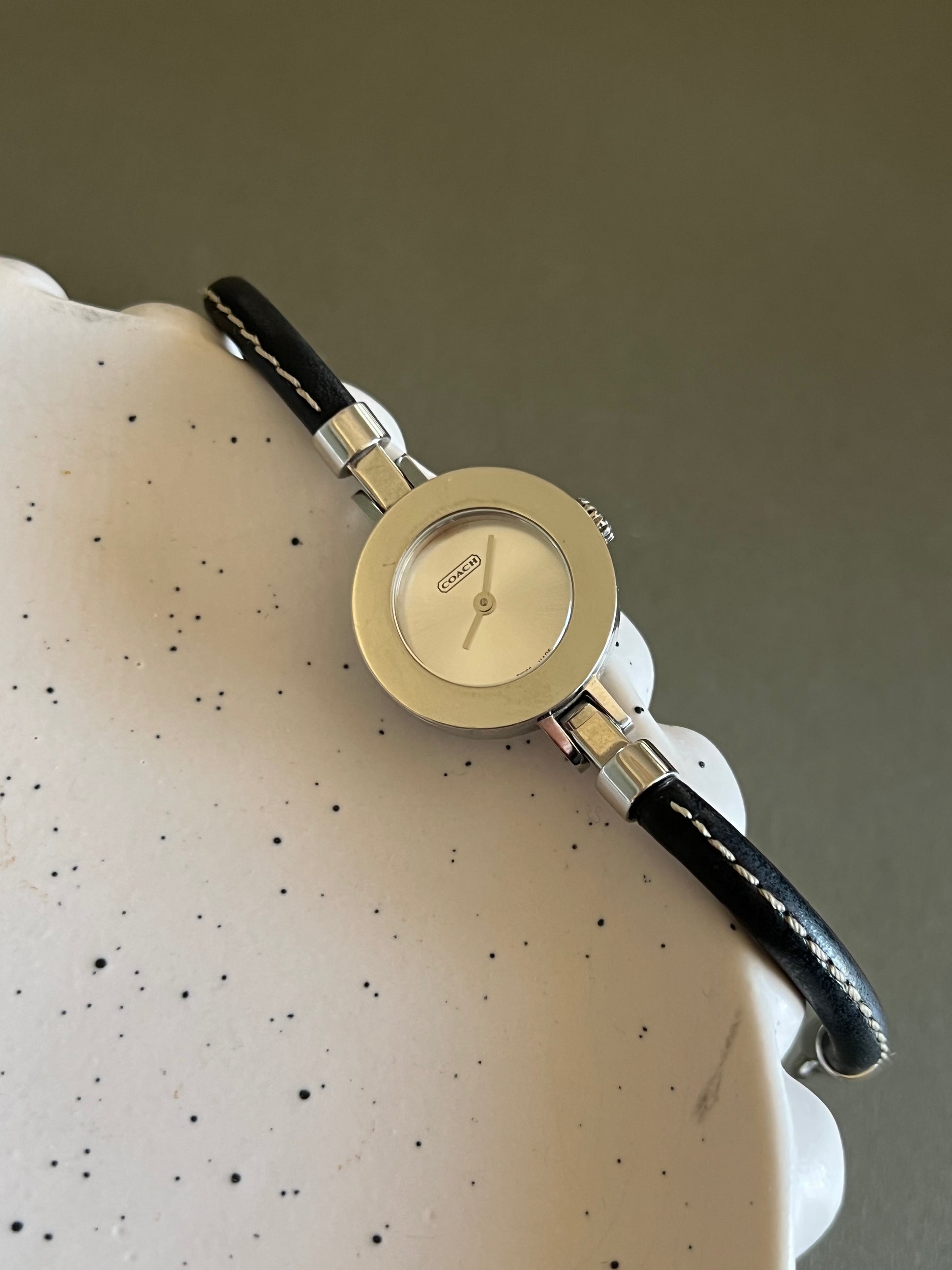 A chic and versatile design from Coach New York, this ladies’ watch brings playful styling into a refined jewellery-like form. The petite round case is paired with a slim black leather strap, detailed with contrast white stitching that enhances its modern yet timeless appeal. The minimalist silver dial, signed Coach, provides a clean backdrop that allows the interchangeable bezel system to take centre stage.