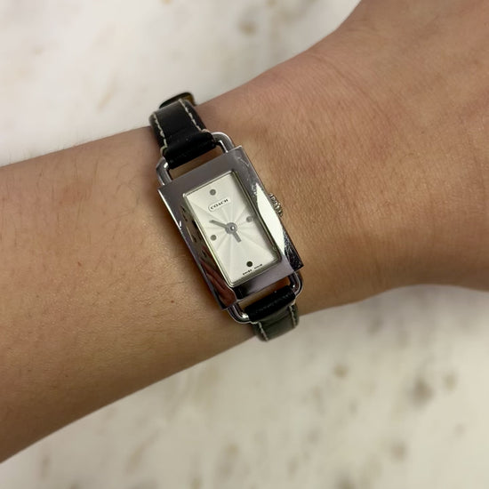 Sleek and sophisticated, this Coach ladies’ watch captures minimalist elegance in a slim rectangular silhouette. The polished silver-tone case frames a radiant sunray dial with delicate dot hour markers, while the iconic Coach name sits with understated poise. A supple black leather strap with contrast stitching adds a refined touch, making it perfect for both everyday wear and special occasions.