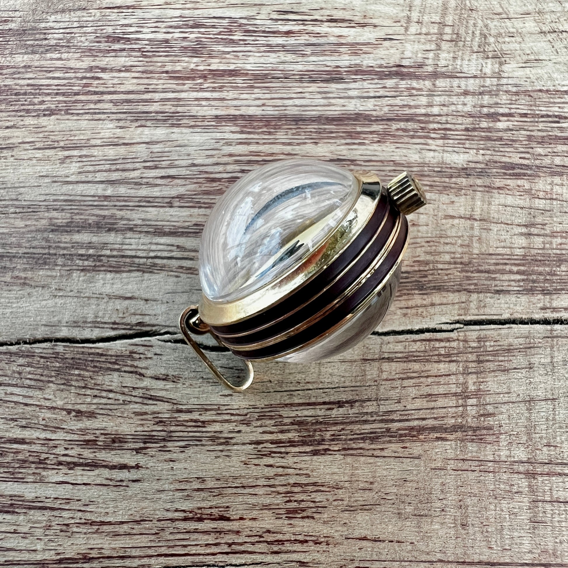 A rare creation from the golden years of Gucci design, this vintage dome pendant watch feels more like a sculpture than a timepiece. Its deep convex crystal magnifies the interlocking G emblem beneath, catching the light like liquid glass and turning every glance into theatre. The other side is a time piece making this jewellery piece both stylish and functional.