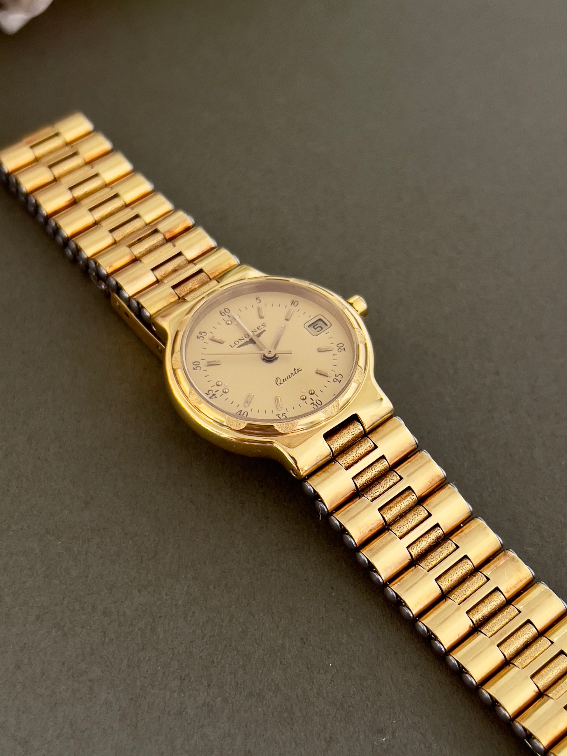 This ladies Longines Conquest, is designed to sit on the wrist like jewellery. The gold tone case flows into a scalloped bezel, a signature detail that adds softness and depth, catching light in a way that feels more decorative than purely functional. Combined with the bracelet’s alternating polish and satin, it creates a play of textures that elevates the watch beyond a simple timekeeper.