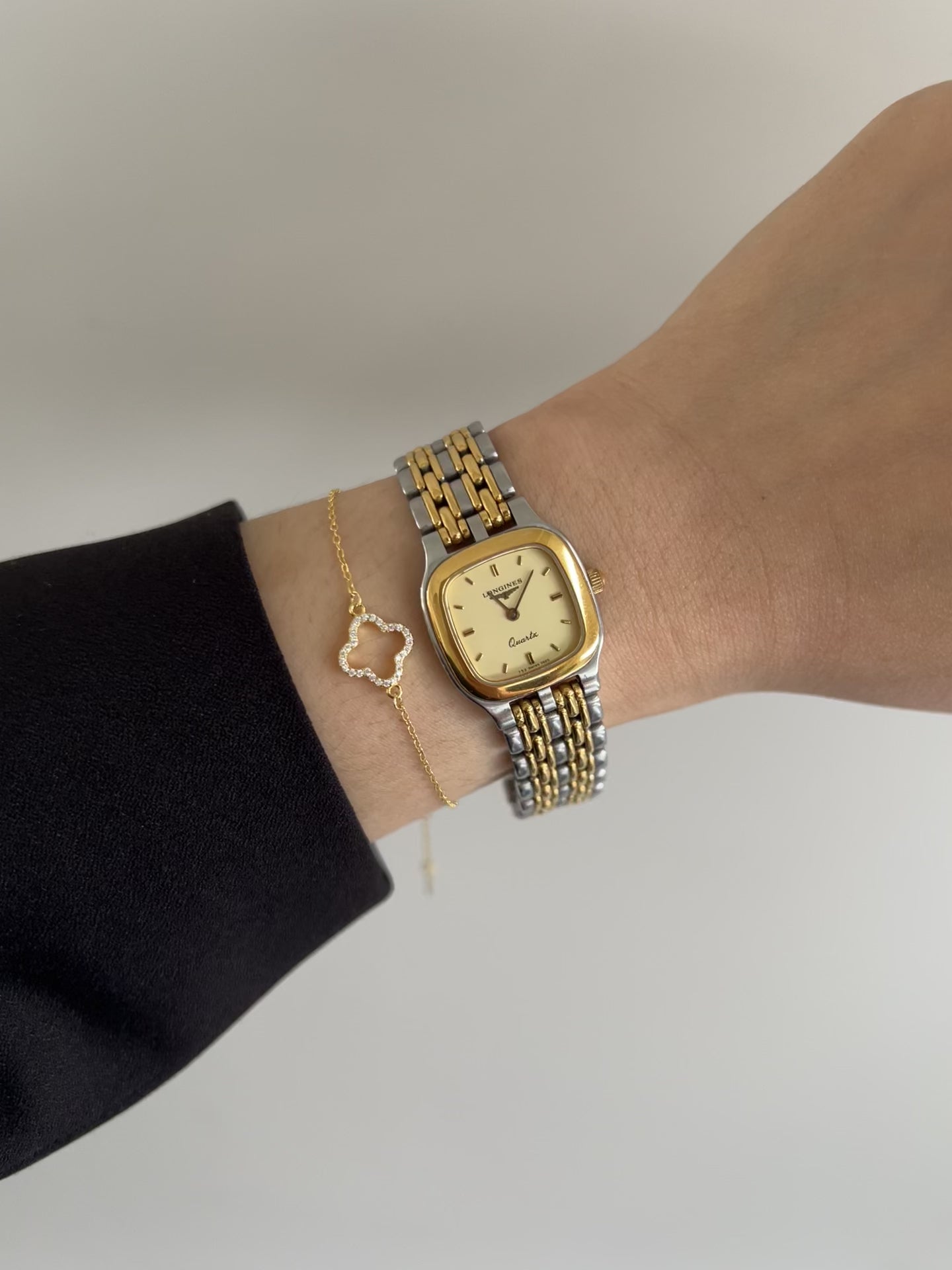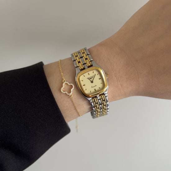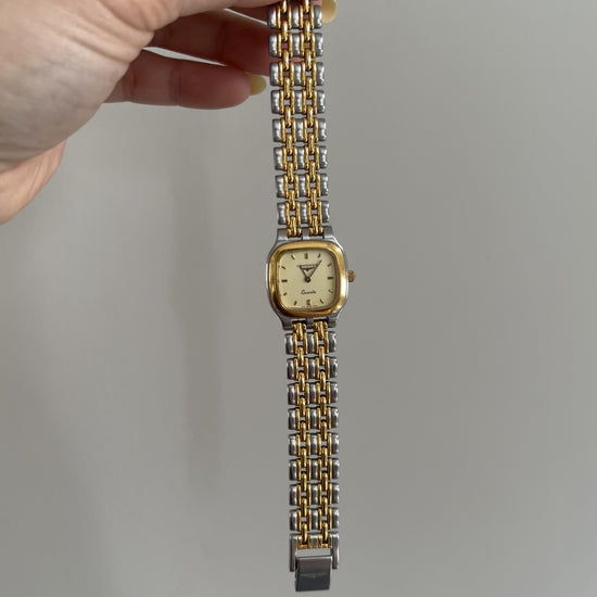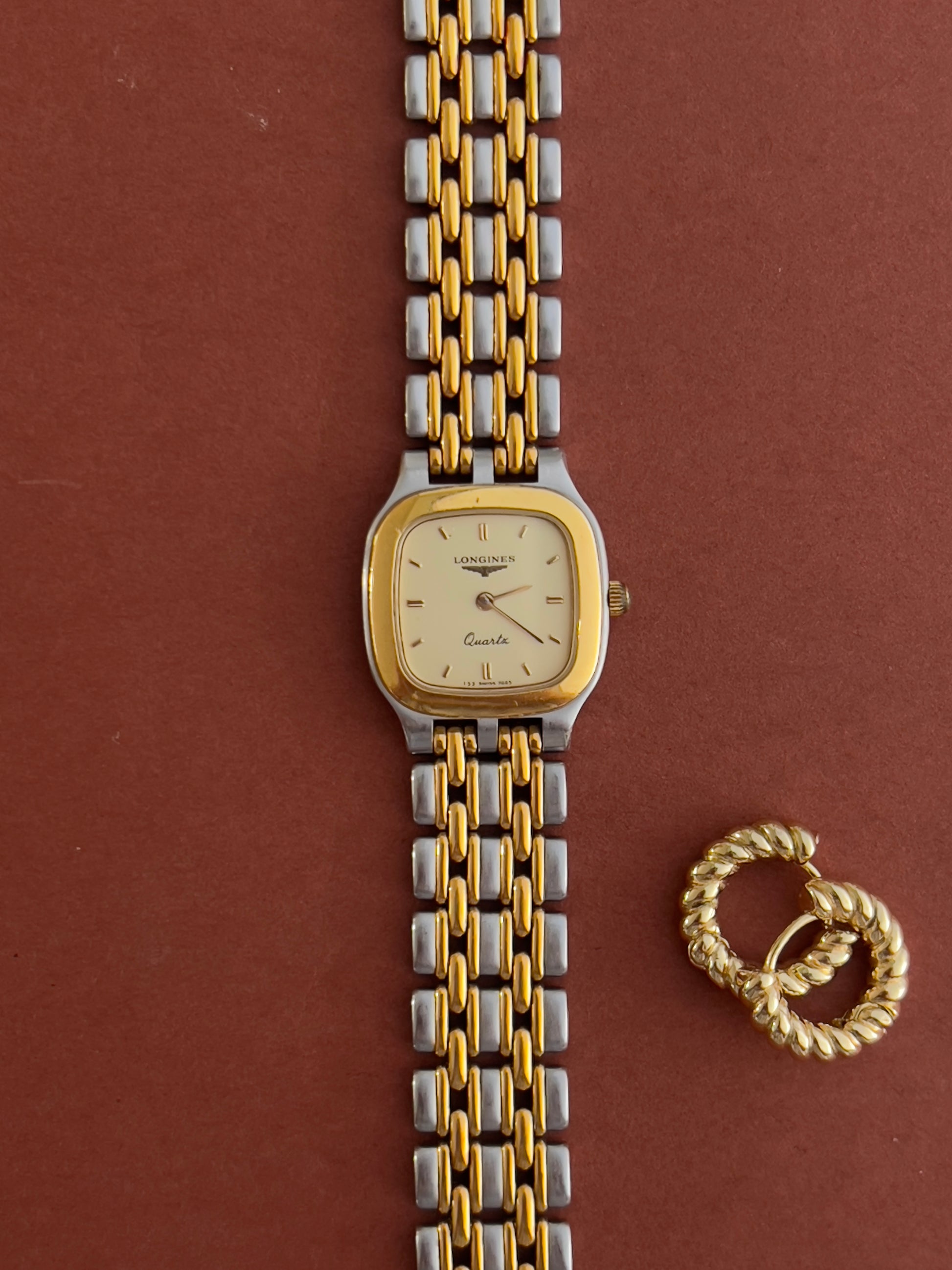 Elegant and softly radiant, this Longines ladies watch embodies Swiss precision and feminine grace. The champagne dial glows gently within a gold-tone cushion case, framed by a two-tone bracelet that shimmers in silver and gold. Every detail speaks of quiet sophistication — from the slender hour markers to the fluid links that rest like fine jewellery against the skin.