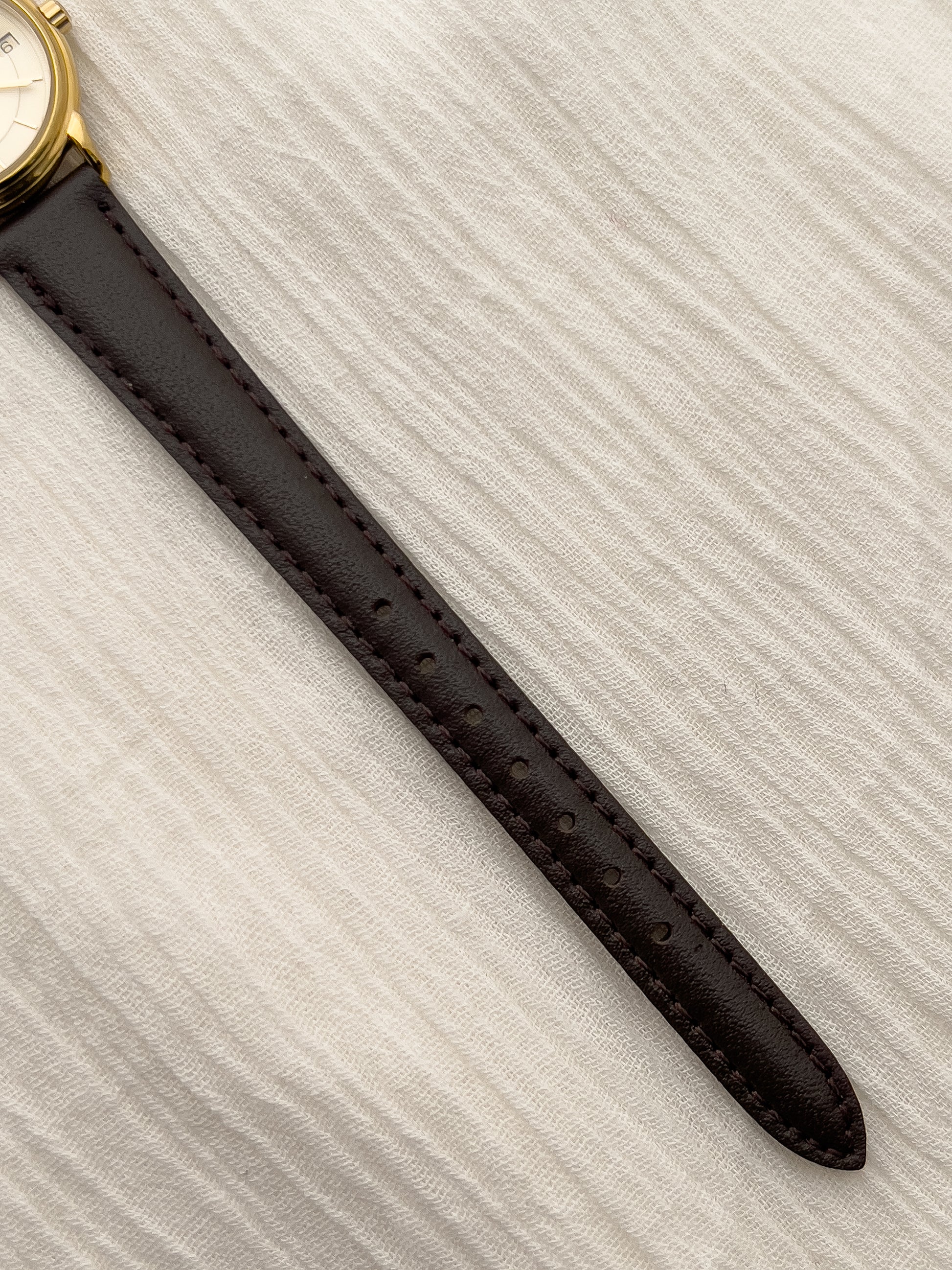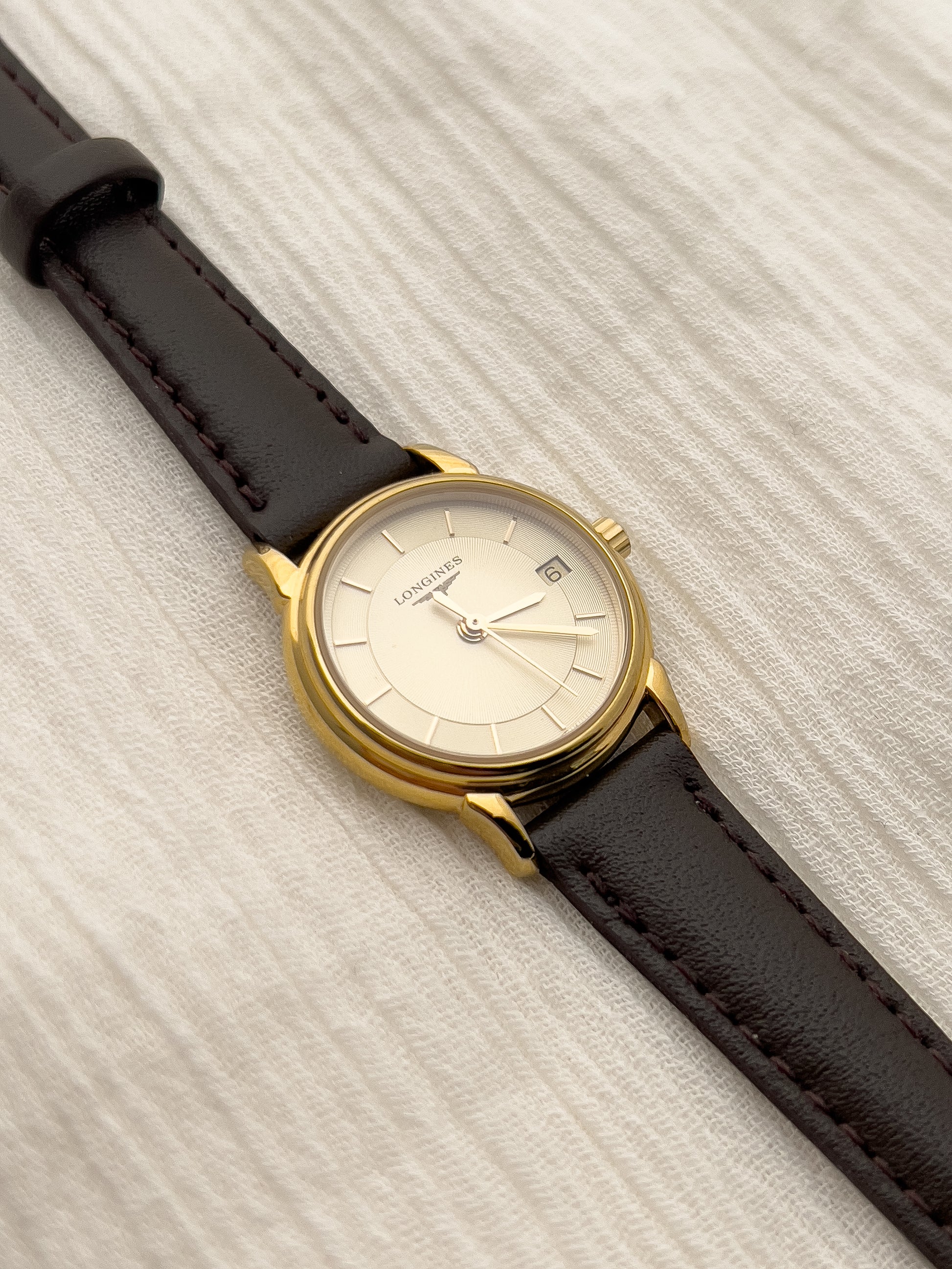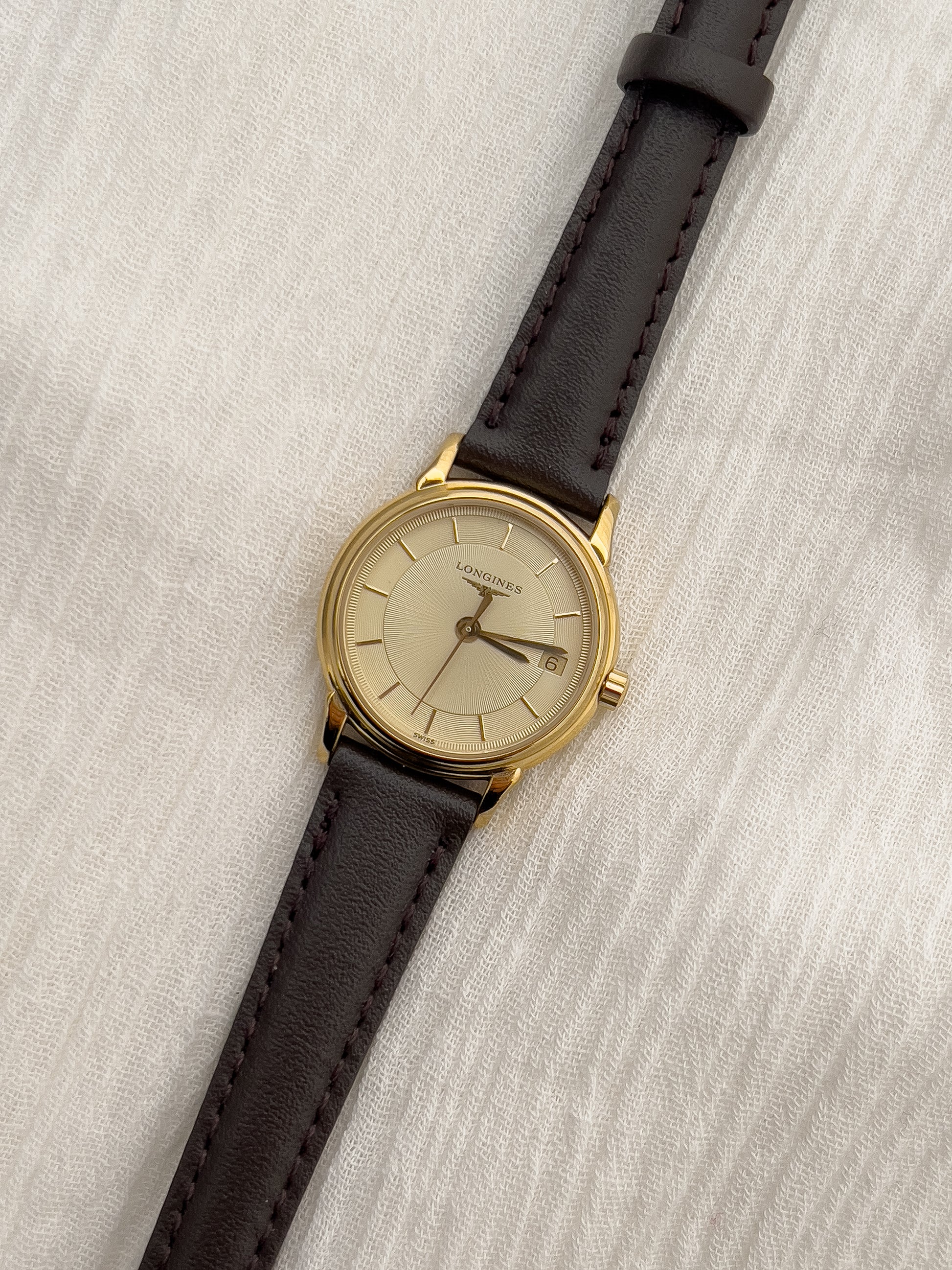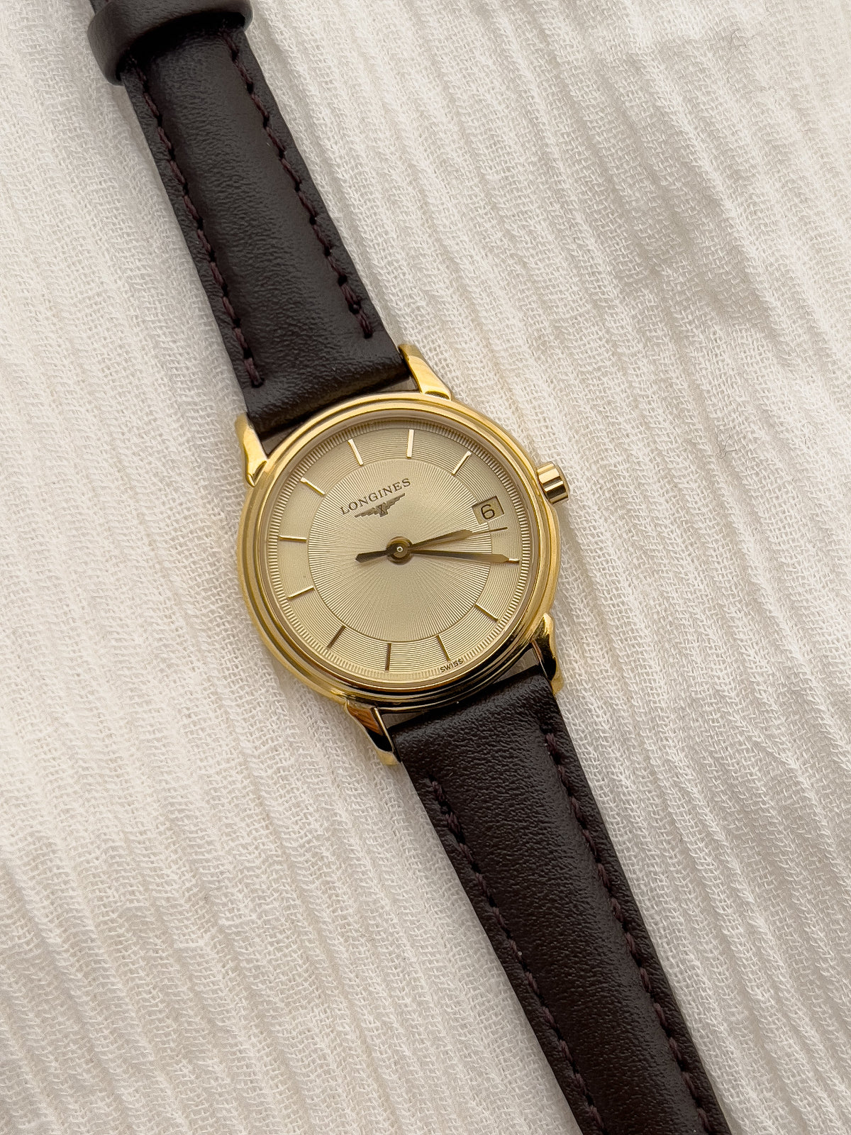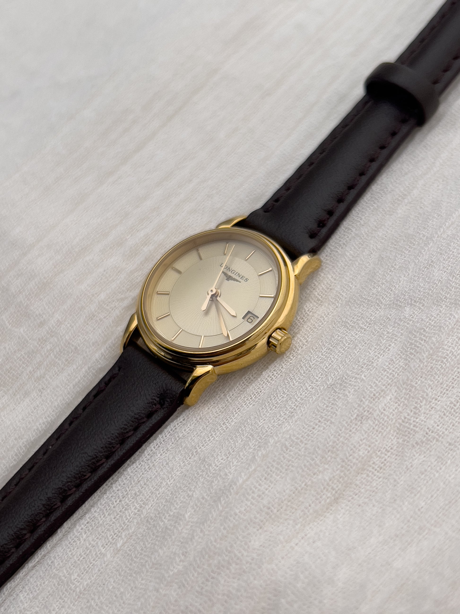 Hailing from the Longines iconic La Grande Classique collection, this ladies’ watch is a study in pure elegance. The slim gold-tone case frames a champagne dial with a sunburst pattern centre, and concentric circle outside rings adding depth to an otherwise minimalist layout. Refined baton indices, slender hands, and a discreet date window at three o’clock complete the balanced composition, emphasising Longines’ devotion to timeless clarity.