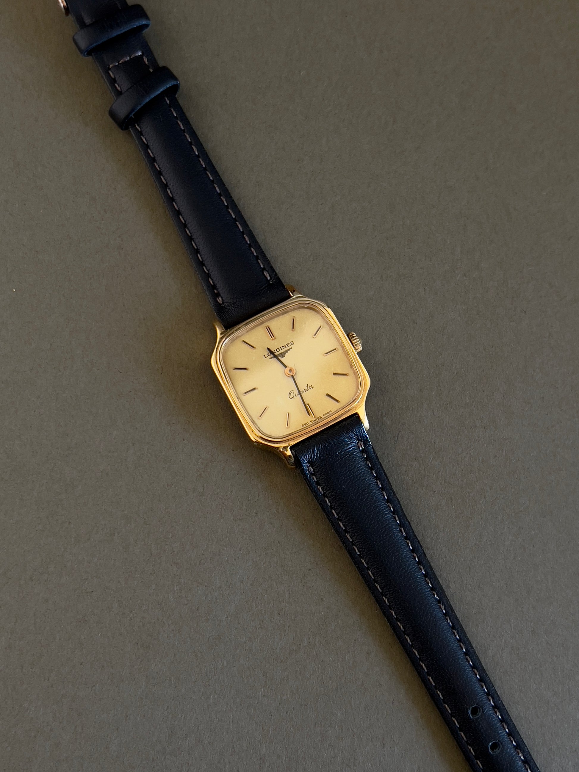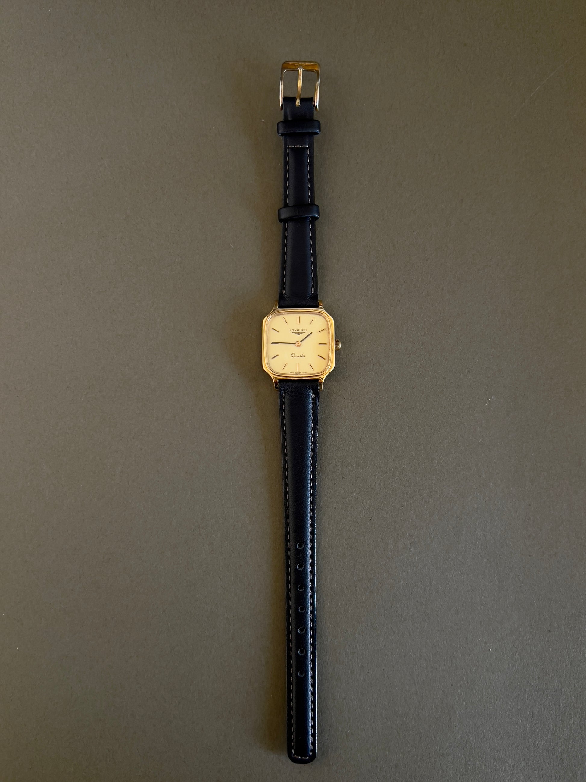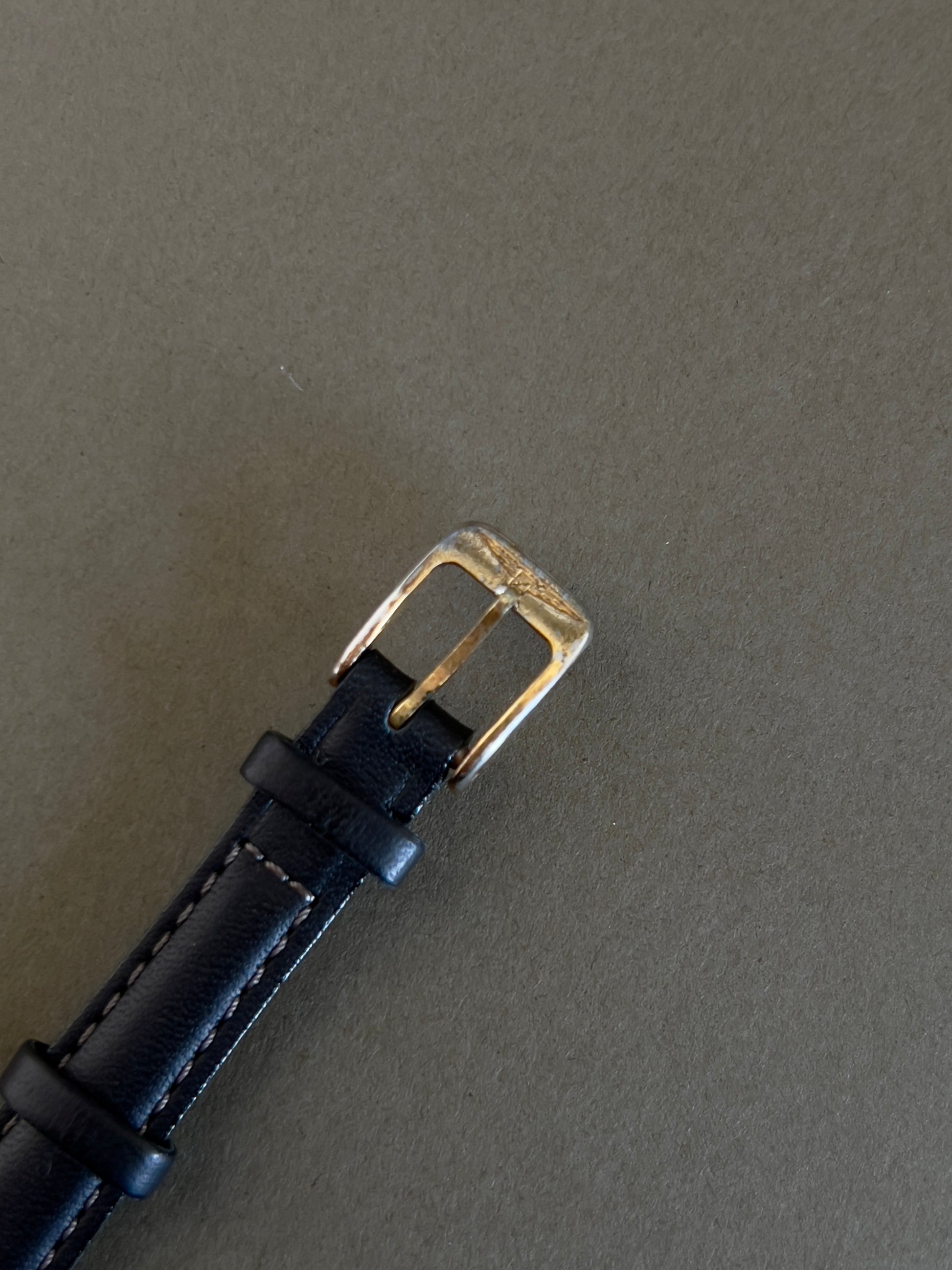 - Strap/bracelet: New aftermarket leather strap; gold plate fade on the original Longines buckle