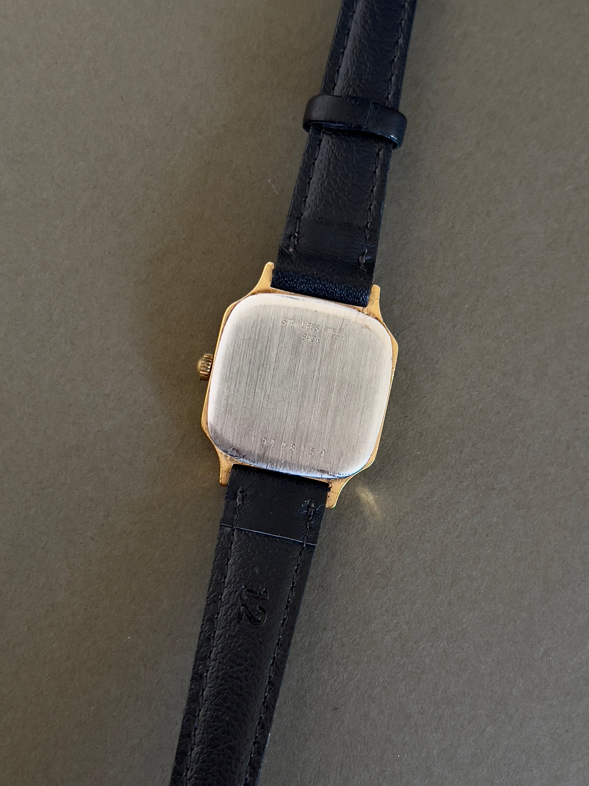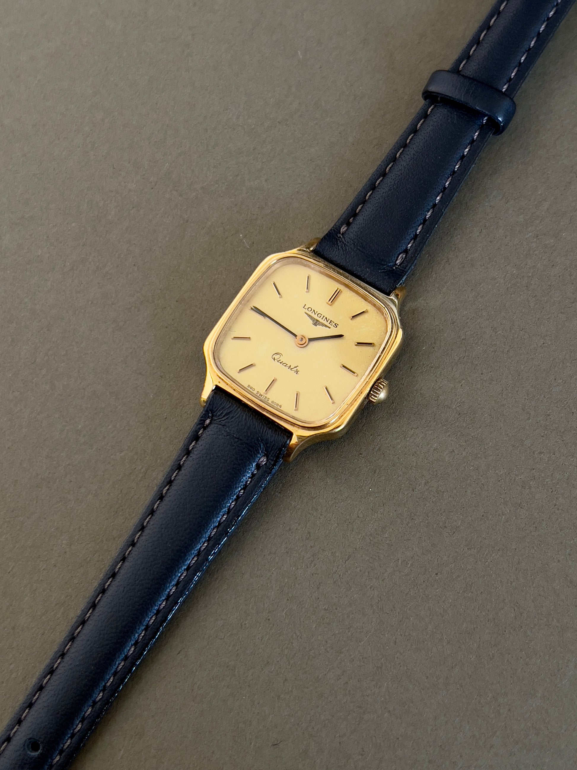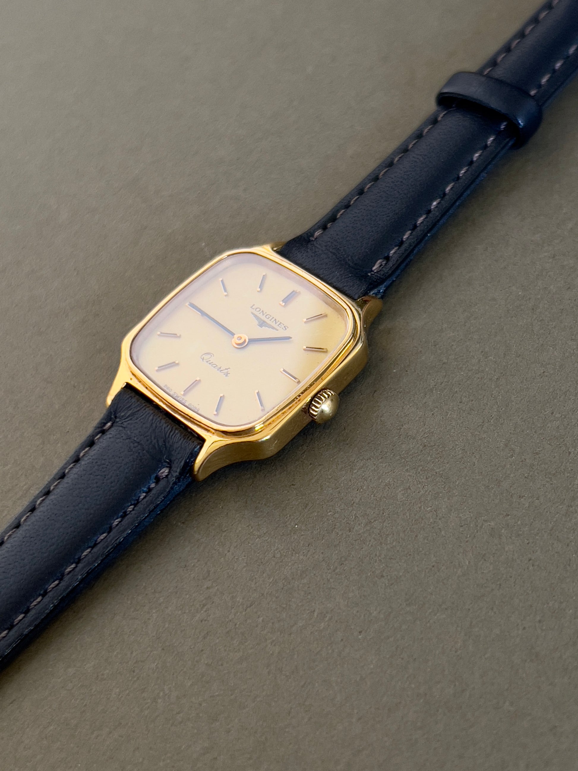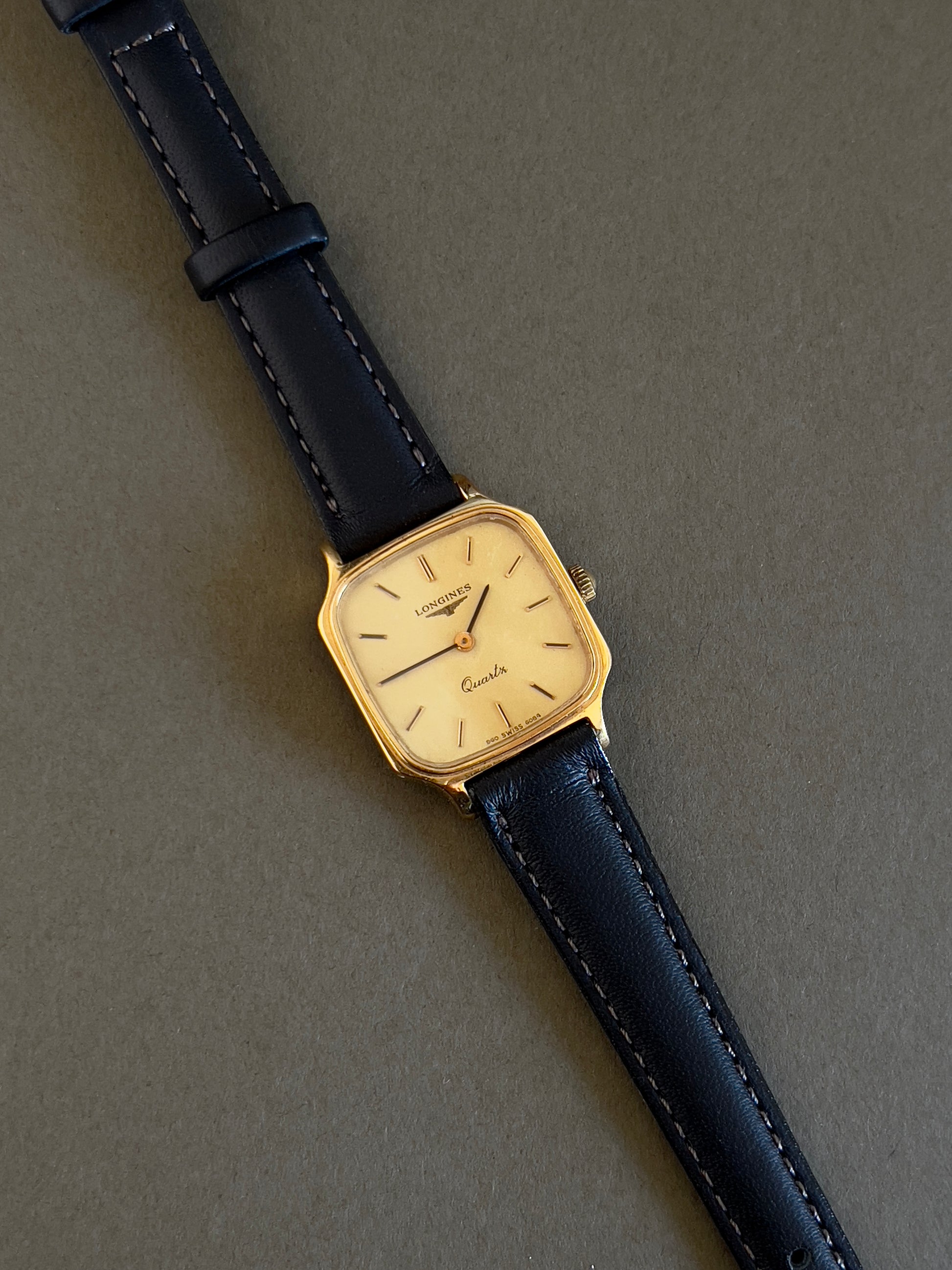 - Strap/bracelet: New aftermarket leather strap; gold plate fade on the original Longines buckle