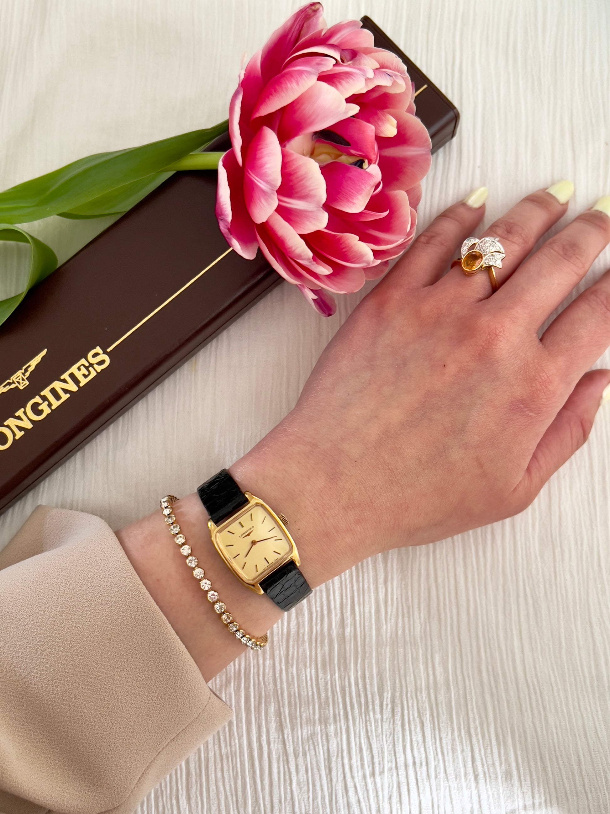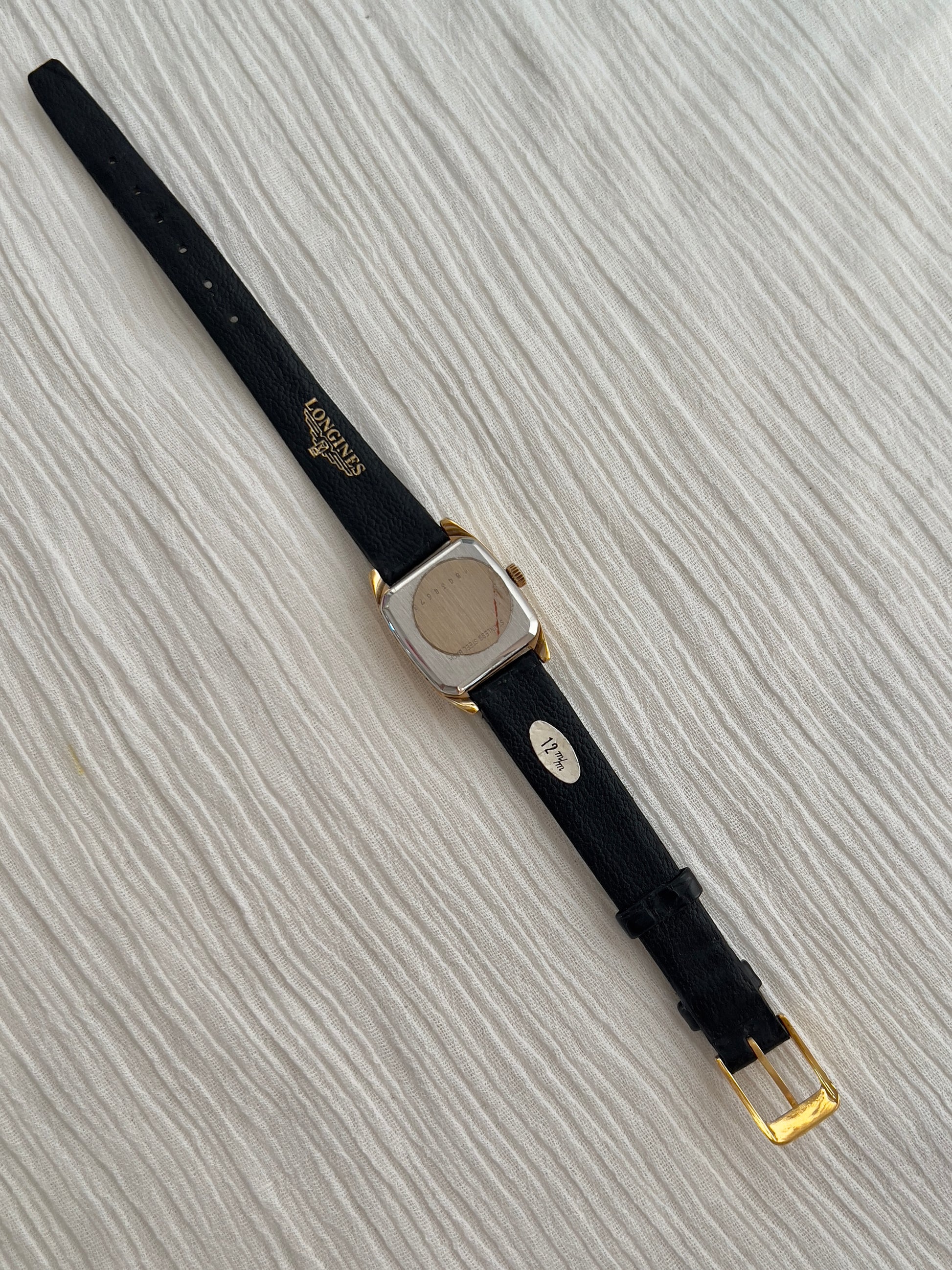 Longines Gold Tonneau Ladies Watch with Champagne Dial and Black Leather Strap