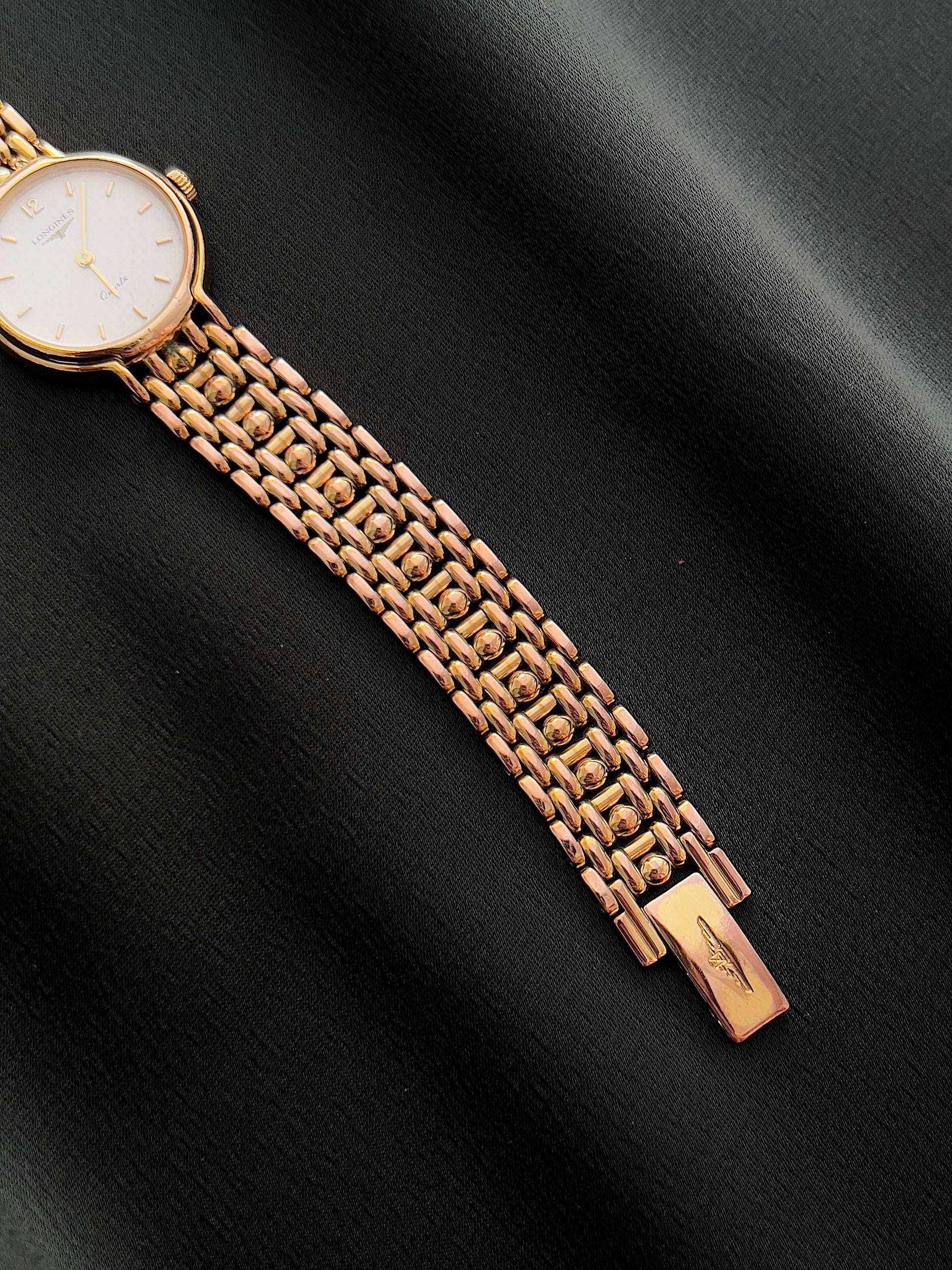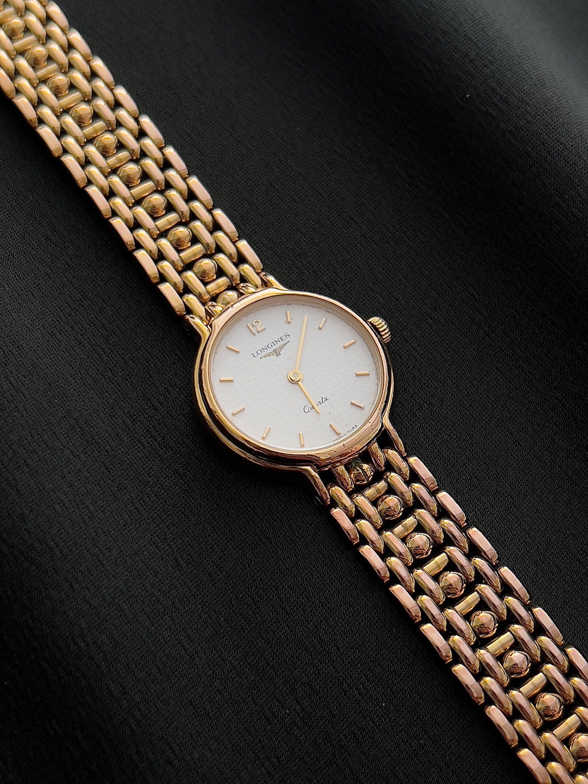 The petite round case is wrapped in rich gold tone, framing a champagne cream dial with delicate raised dot texture. Slender gold hour markers and an applied 12 catch the light, paired with fine baton hands and the famed winged Longines emblem for that unmistakable Swiss pedigree.