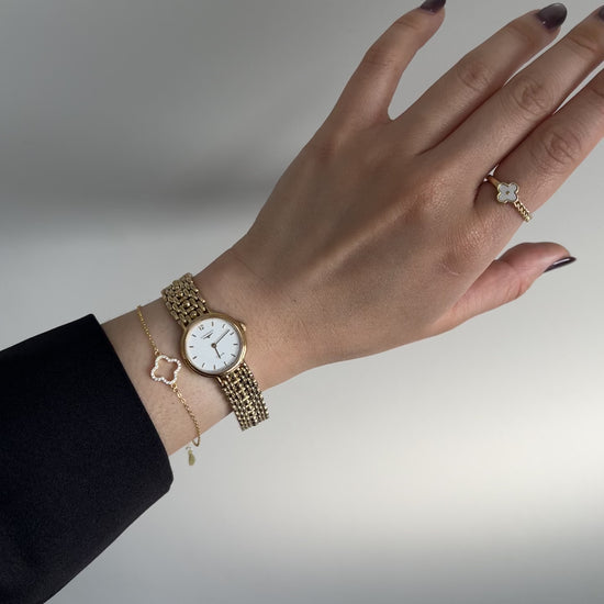 The bracelet is the star here a beautifully articulated, multi row design of pillowed gold links that drapes like liquid metal and gives the watch a jewellery first presence. It closes neatly around the wrist, sitting low and comfortable, perfect beside a tennis bracelet or worn on its own as a signature piece.