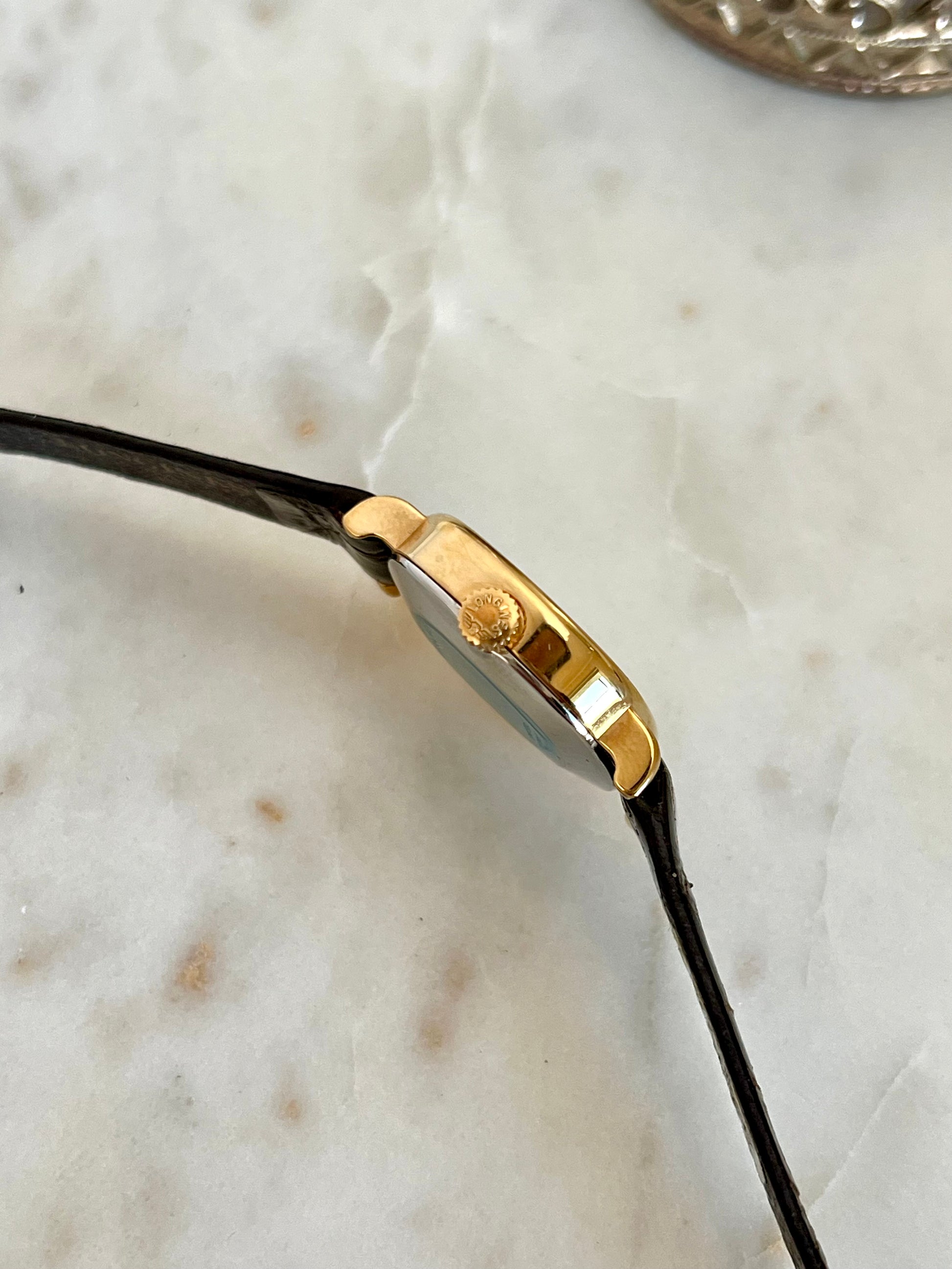 Designed in a softly rounded cushion case, its warm gold tone finish frames a champagne dial that feels calm, balanced, and unmistakably Swiss in character.