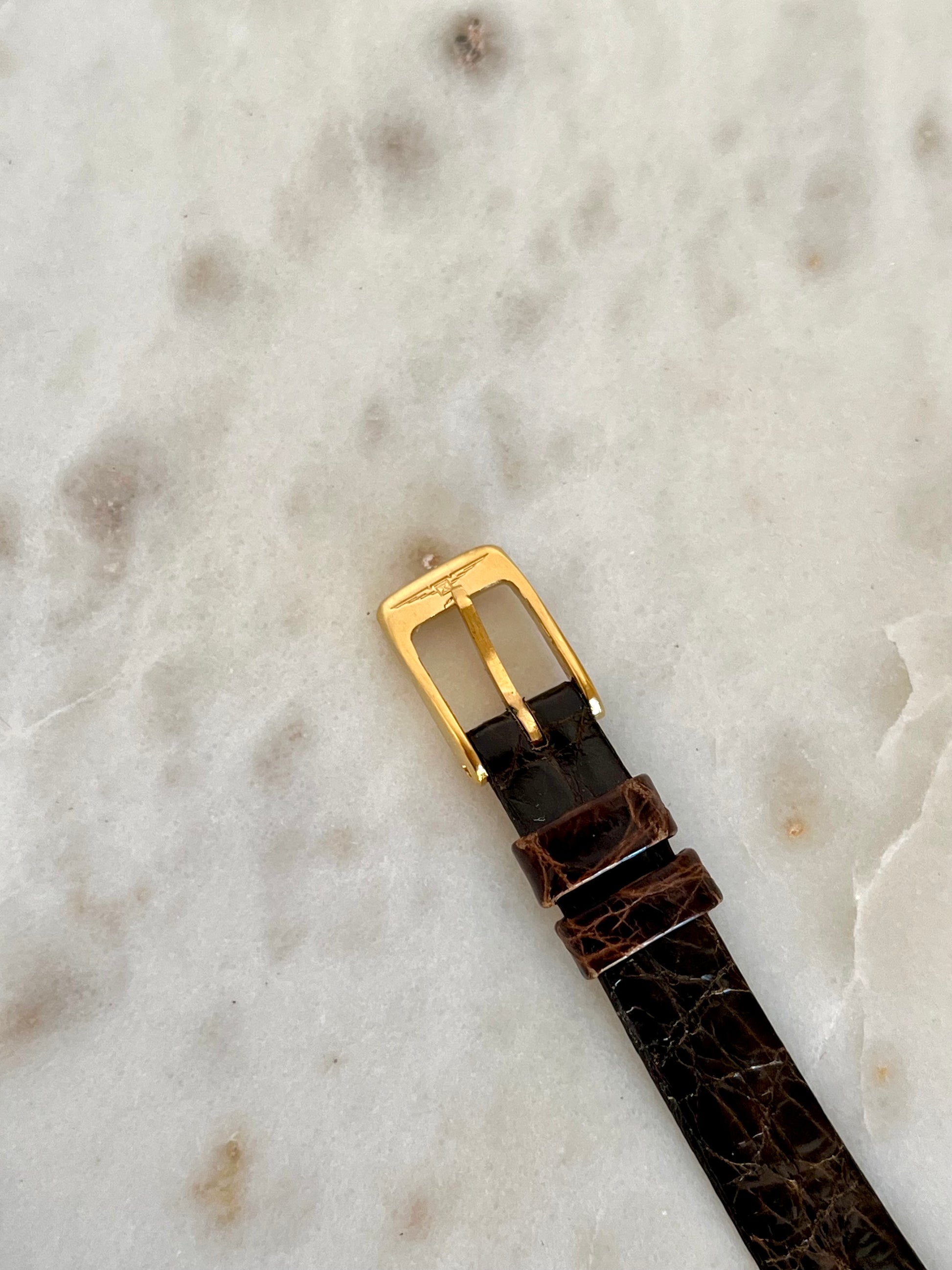Applied baton hour markers sit lightly against the dial, paired with slim black hands that add just enough contrast without interrupting the overall harmony. There is no date, no complication, no excess, only proportion and intention. Finished on a dark brown leather strap, this piece wears beautifully on the wrist. Petite in scale but confident in presence, it is the kind of watch that feels considered rather than styled, perfect with tailoring, silk, knitwear, or everyday denim.