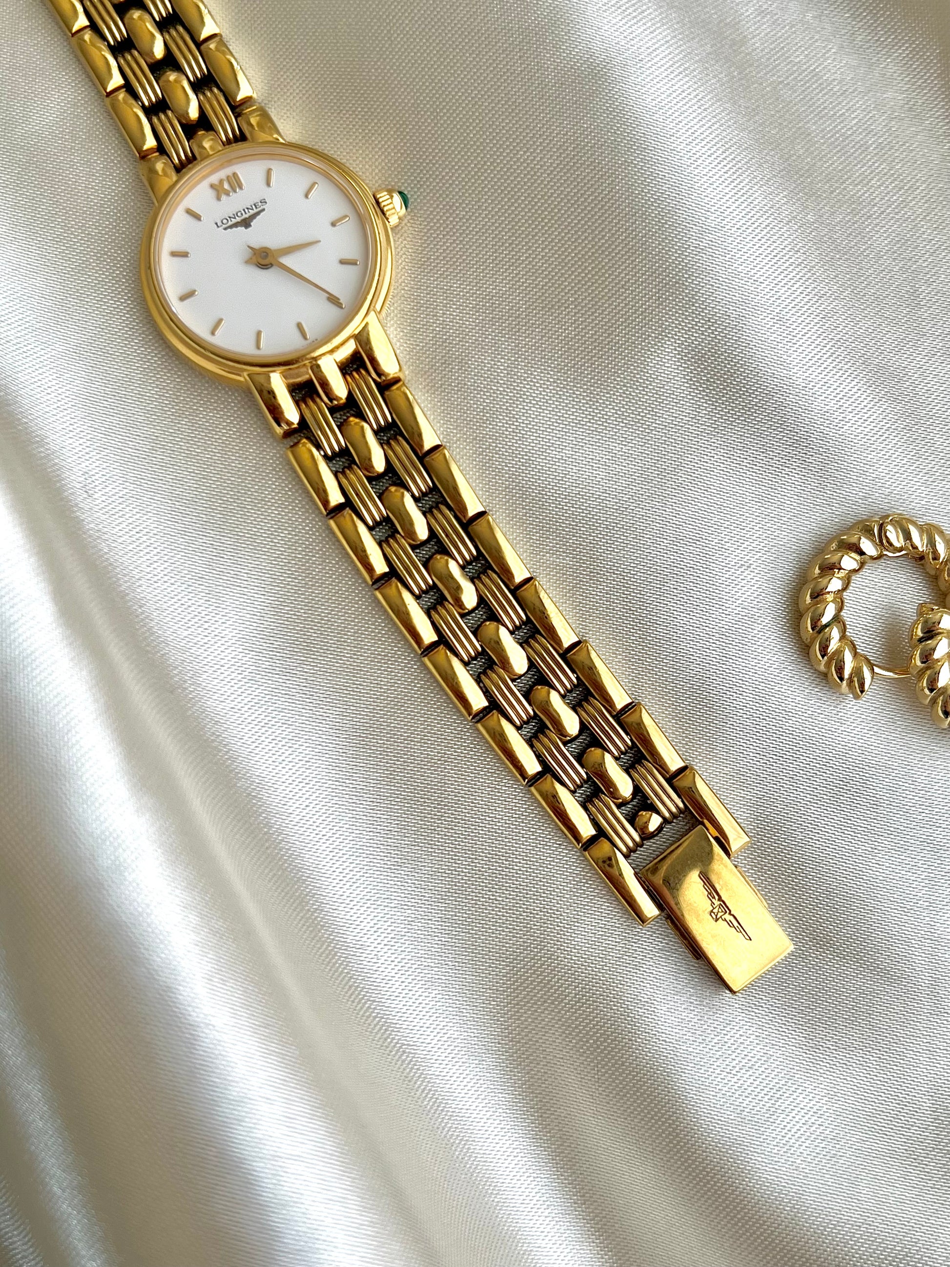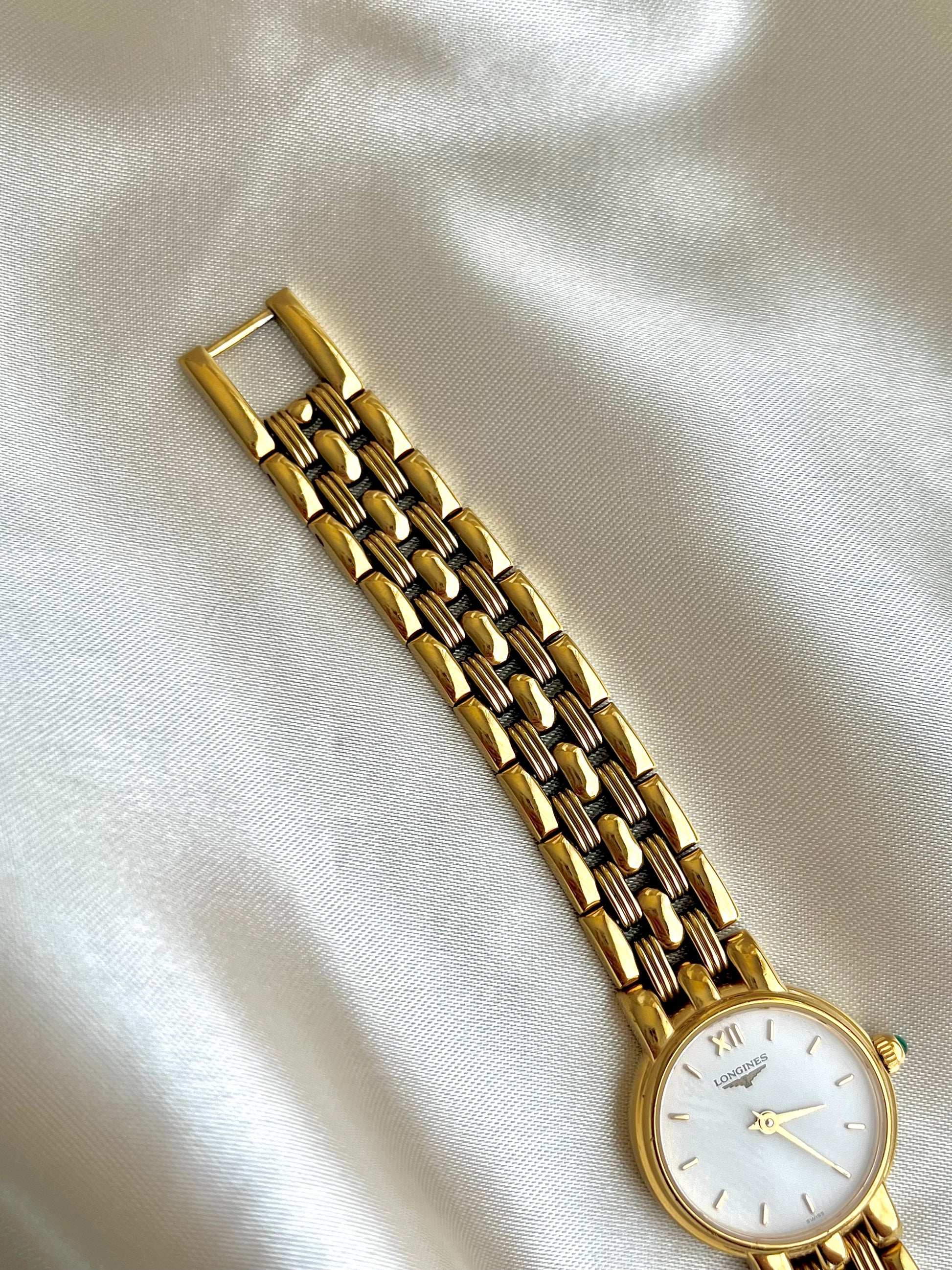A small gold relic made for the wrist, delicate, deliberate, and quietly luminous. This Longines keeps the dial pure and minimal, a white field with slender gold markers and a single Roman twelve, then lets the metalwork do the speaking through a bracelet that feels woven rather than assembled. It is jewellery with time hidden inside, refined and composed from every angle.