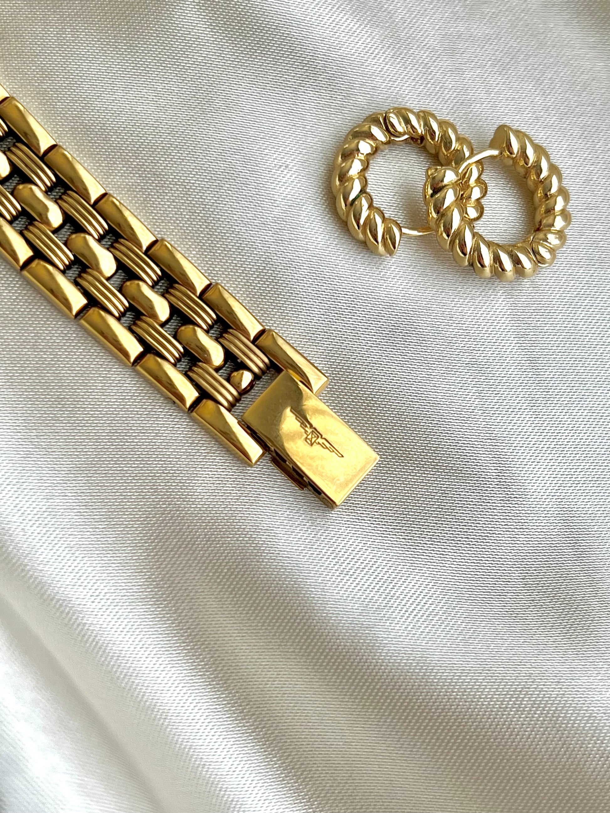 - Bracelet & clasp: Integrated bracelet in gold with parallel textured accent that breaks up the masculinity of the design. Signed clasp