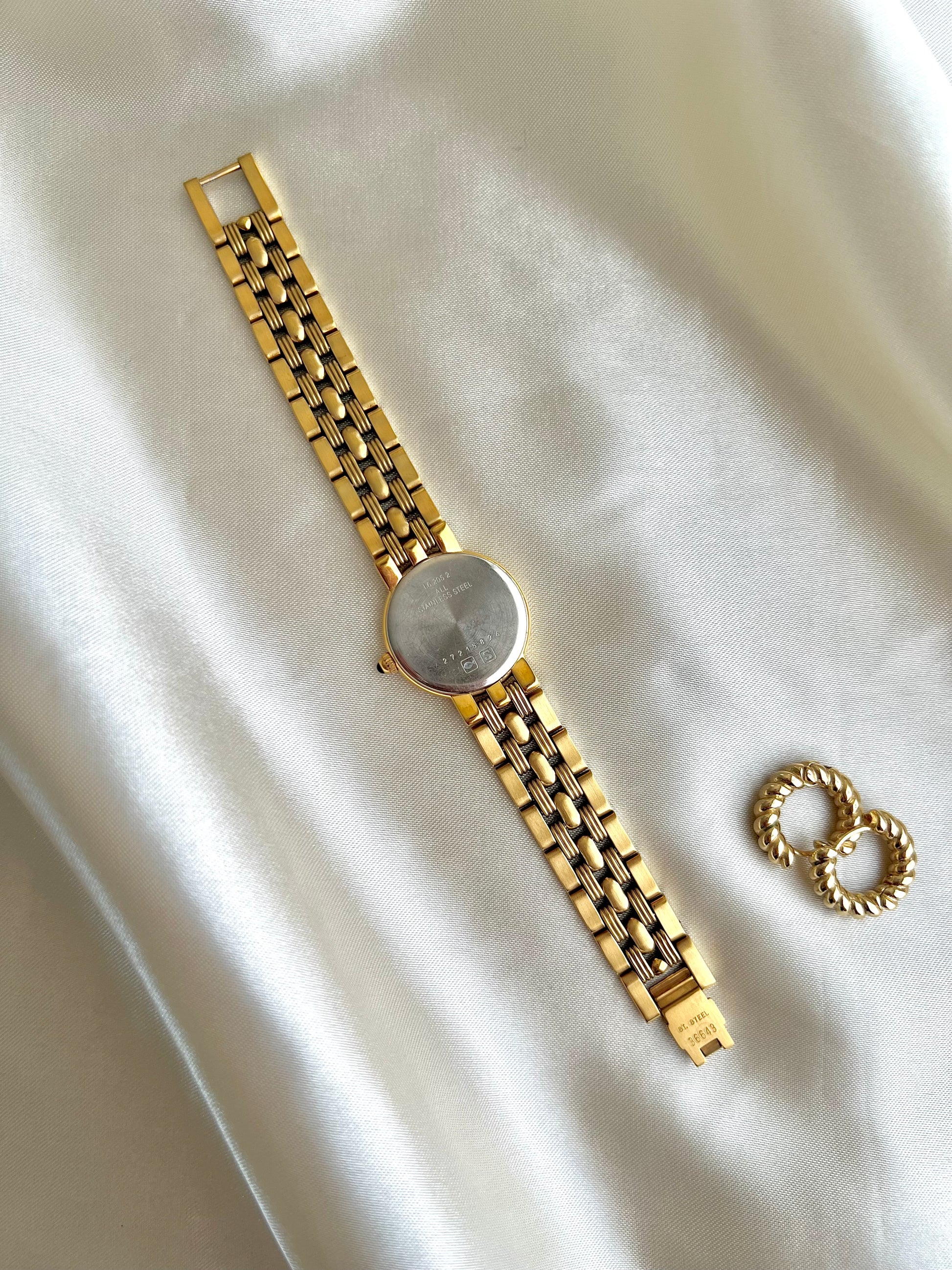 - Case: Gold tone soft round case with a raised bezel, integrating the bracelet