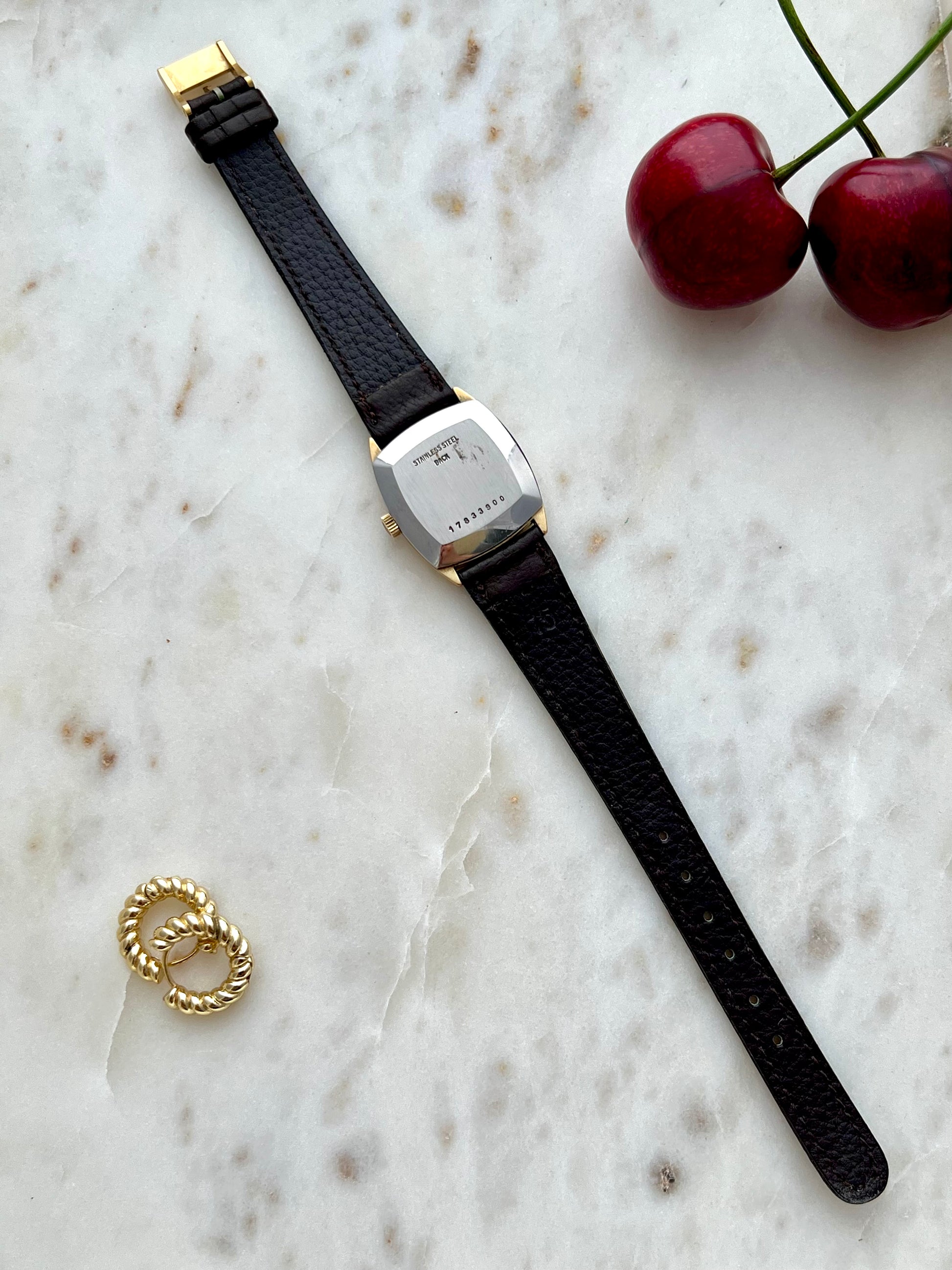 Finished on black leather, it wears like a tailored accessory rather than a gadget. If you love vintage that reads modern, minimal, and elevated, this is a perfect daily signature, equally at home with a blazer sleeve, evening knit, or silk.