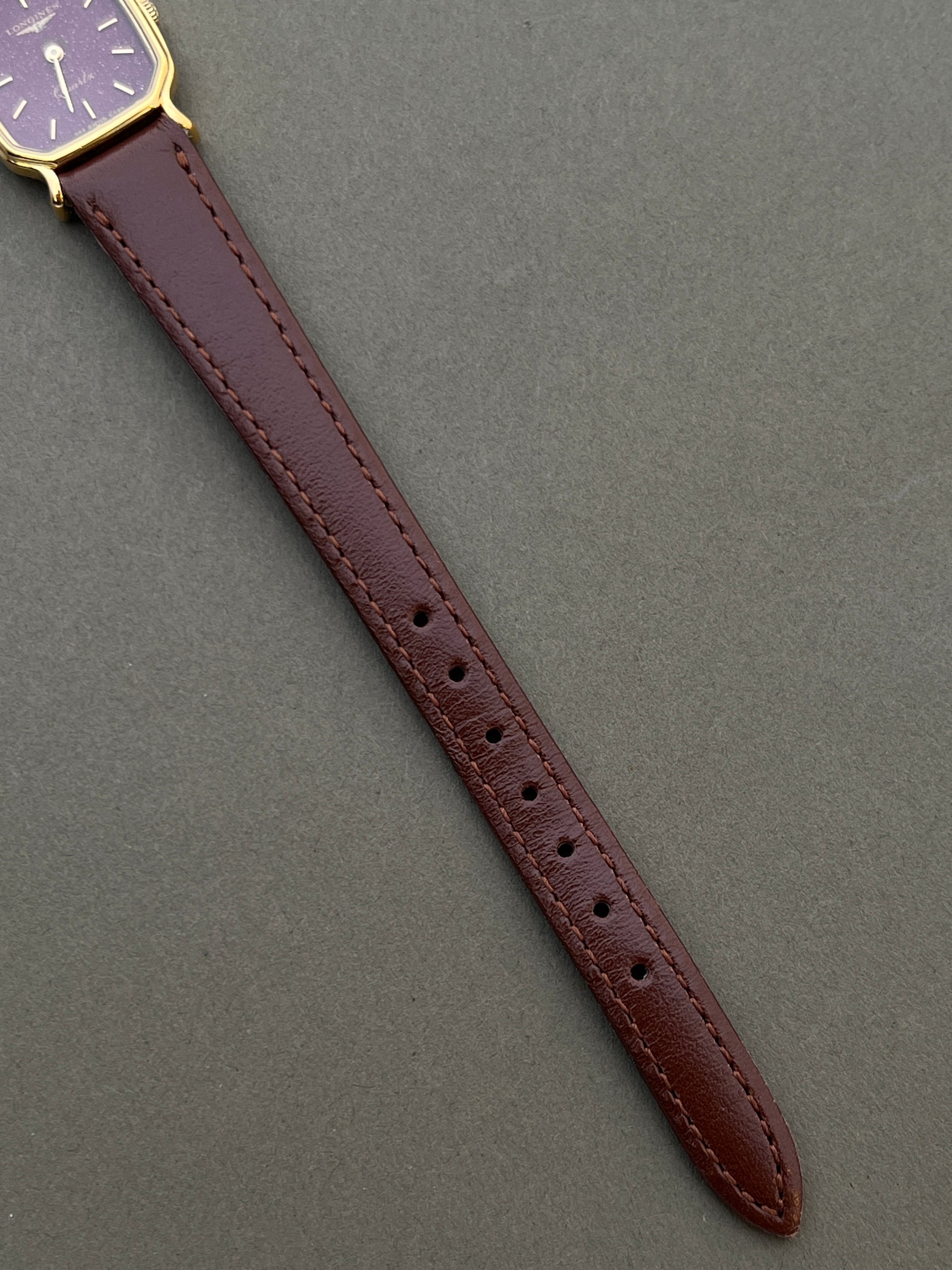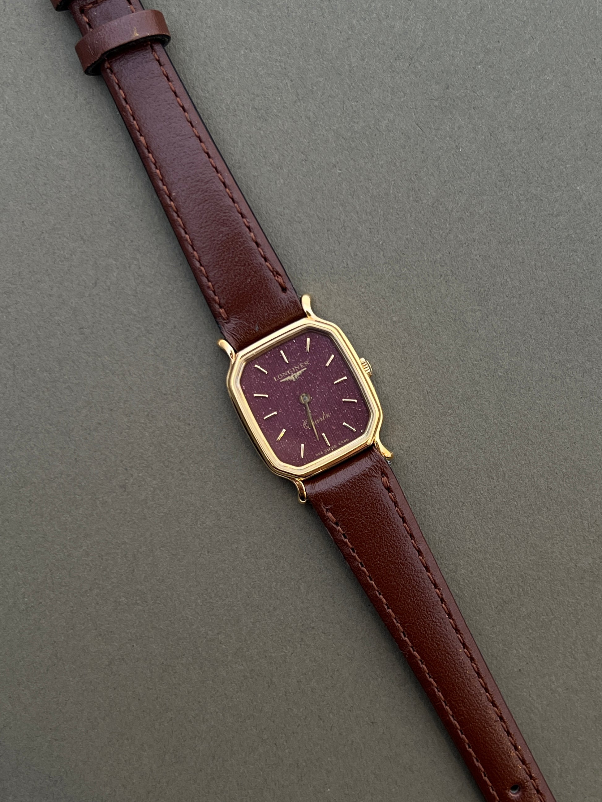 This Longines brings a rare harmony of colour and form. Its gold case is shaped as a softened square, with rounded edges and graceful lugs that give it a feminine poise. At the centre lies a burgundy dial alive with vertical texture, a fabric-like pattern that plays with light and deepens the richness of its tone. Slim gold batons and fine hands heighten the sense of elegance, keeping the design restrained yet refined.