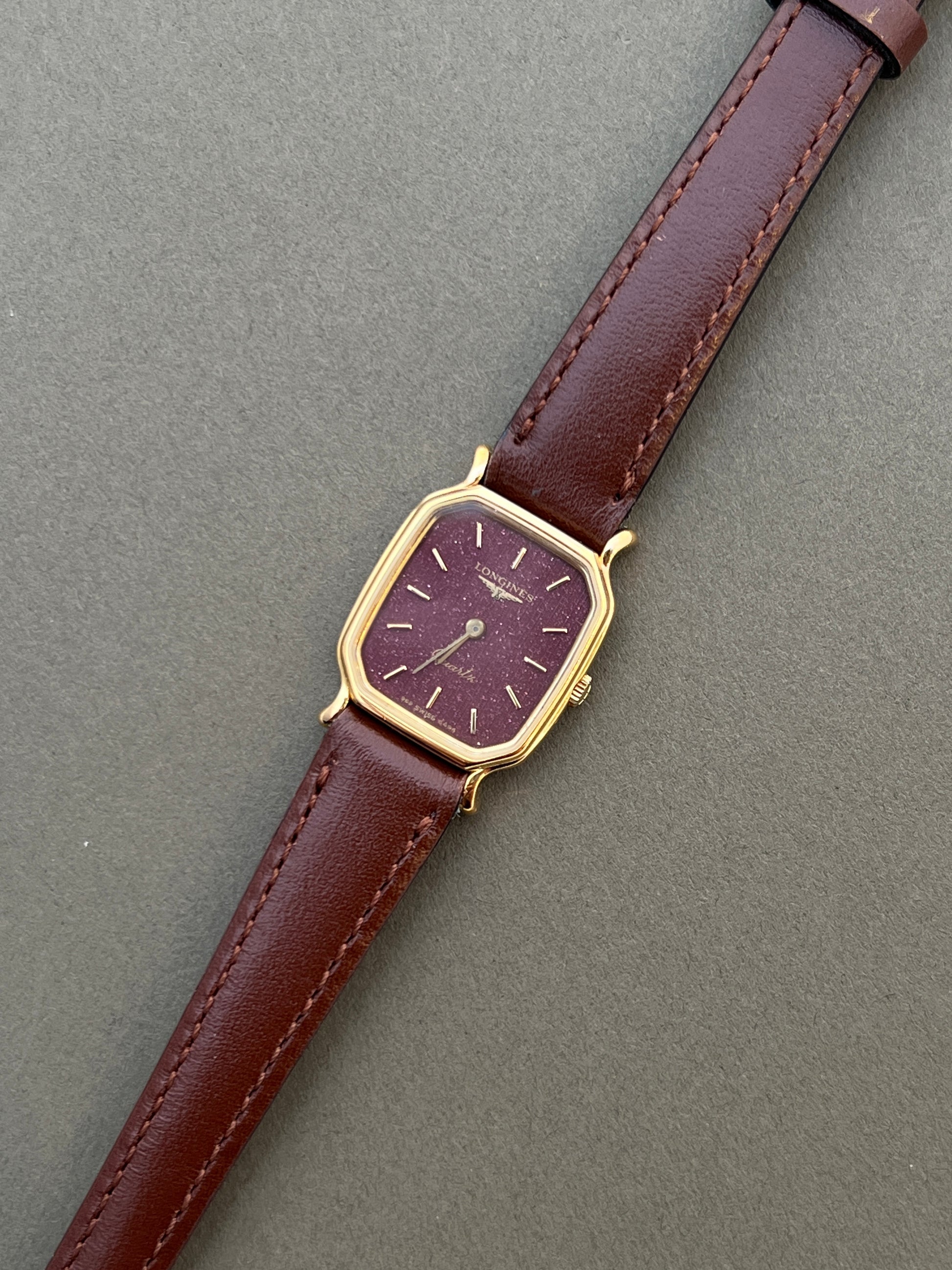 Longines Ladies Gold Cushion Watch with Stardust Wine Dial