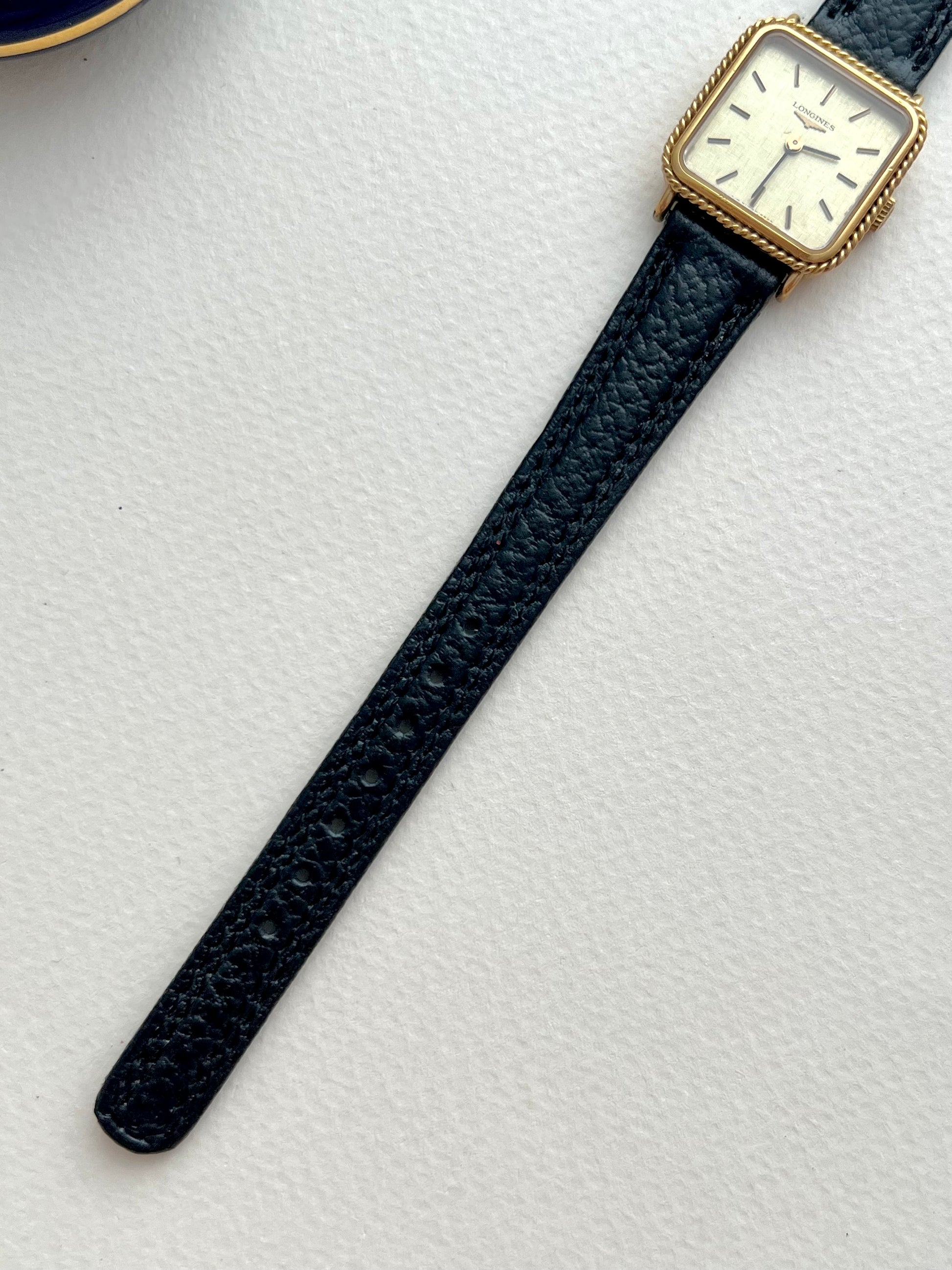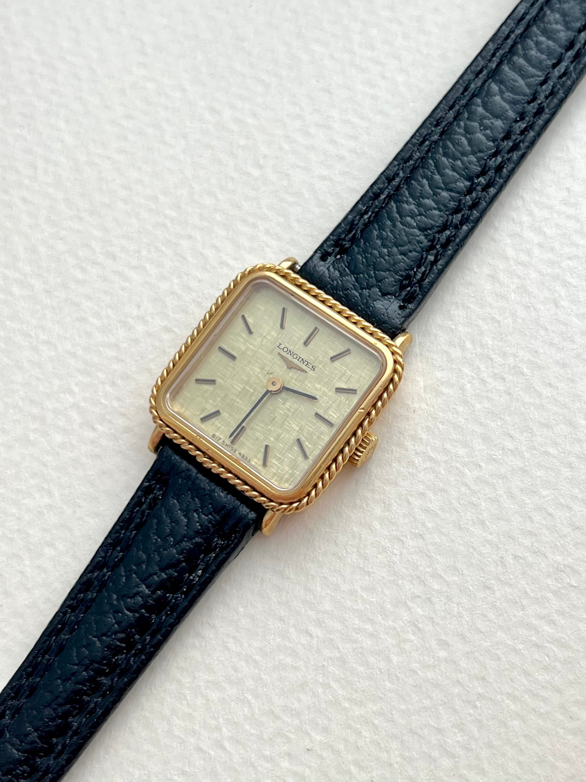 A tiny framed artwork in gold and ink. This Longines pairs a softly rectangular case with a twisted rope bezel, like braided metalwork around a canvas, then lays down a linen textured dial in warm ivory, finished with fine black markers and hands. The result is graphic, poised, and unusually tasteful, a piece that feels designed, not merely made.