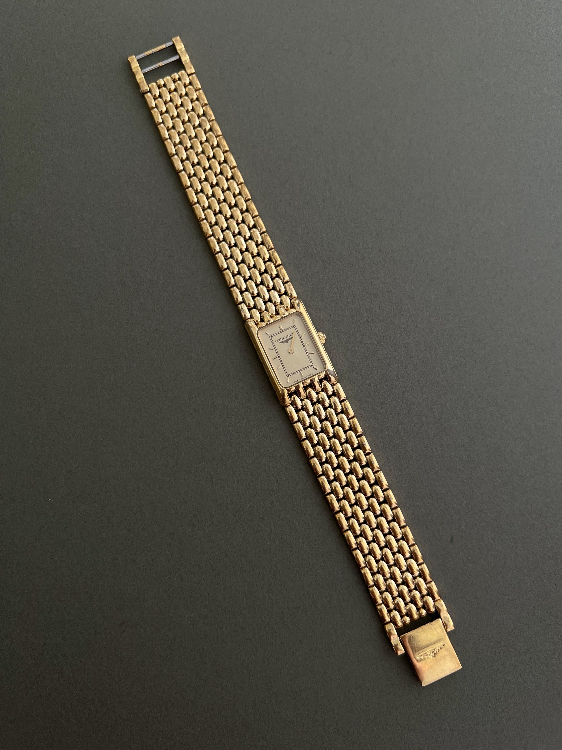 What makes this piece truly exceptional is the bracelet. It is a river of sculpted gold links that move like liquid light across the wrist, each link curved and polished to echo the quiet luxury Longines mastered in the late twentieth century. On the wrist it reads more like jewellery than a timepiece, the kind of golden presence that feels soft, warm and intimately personal.