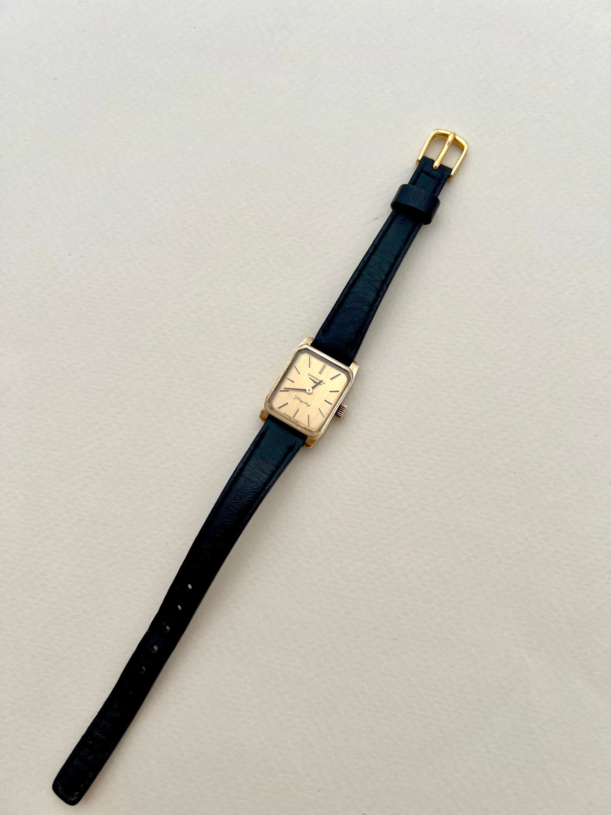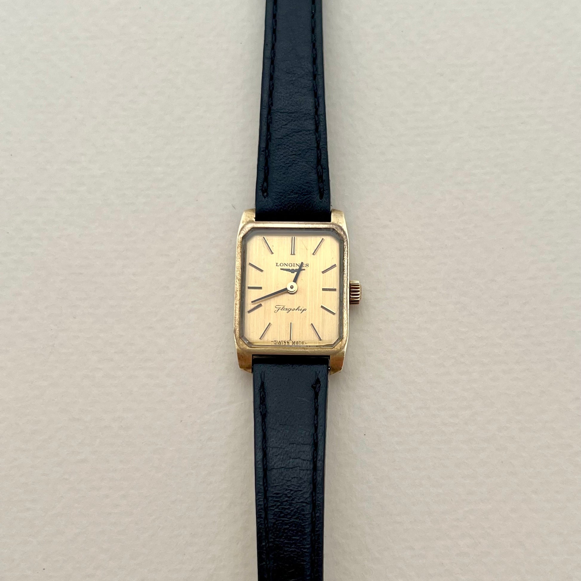 A Longines Flagship that keeps its elegance quiet and razor precise. Warm champagne dial, slim applied markers, and the distinctive Flagship script feel like a signature on fine stationery, restrained, confident, and made to be noticed only by those who look twice. The rectangular case is softly sculpted, more architectural than square, and the proportions make it wear refined and tidy, never bulky.