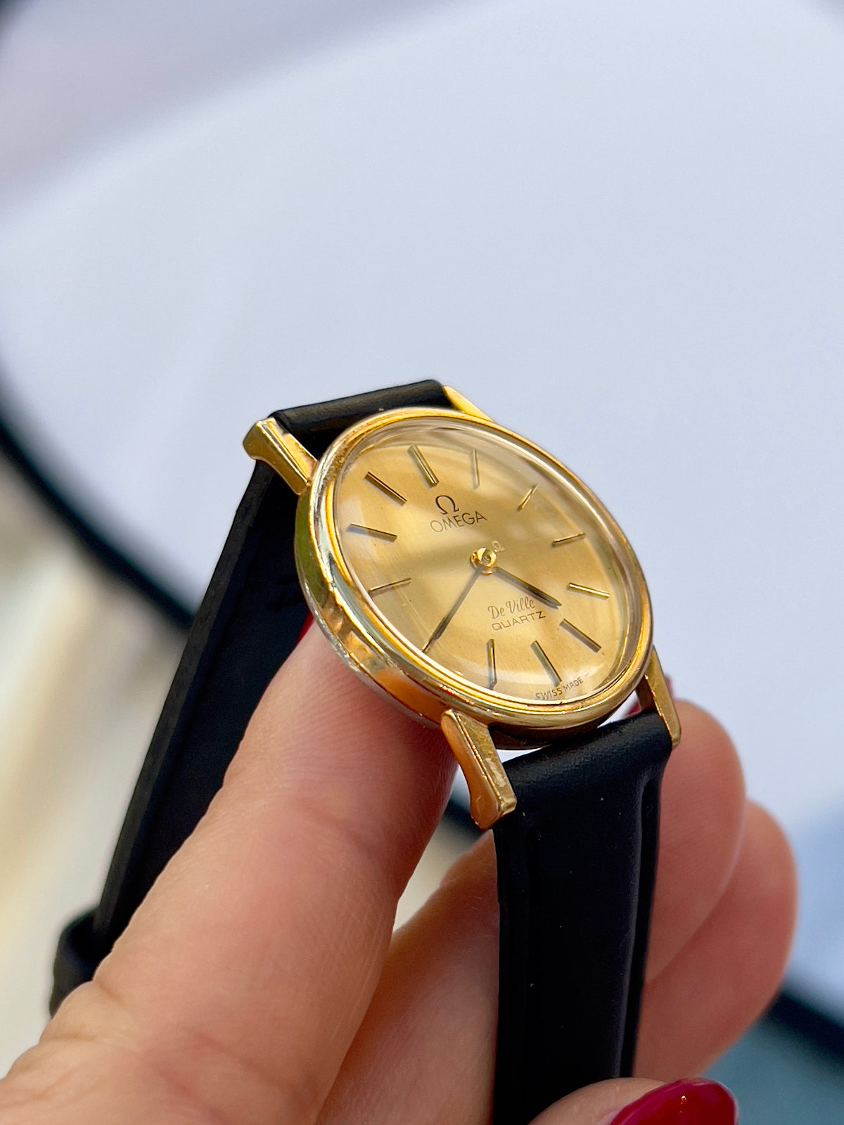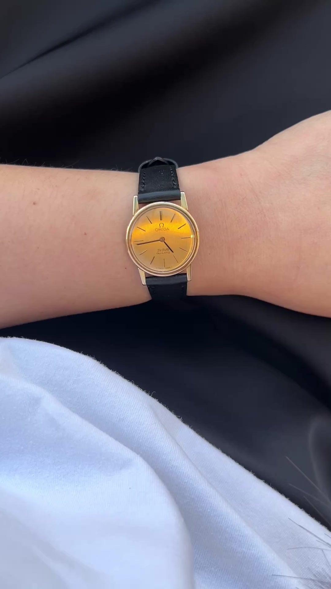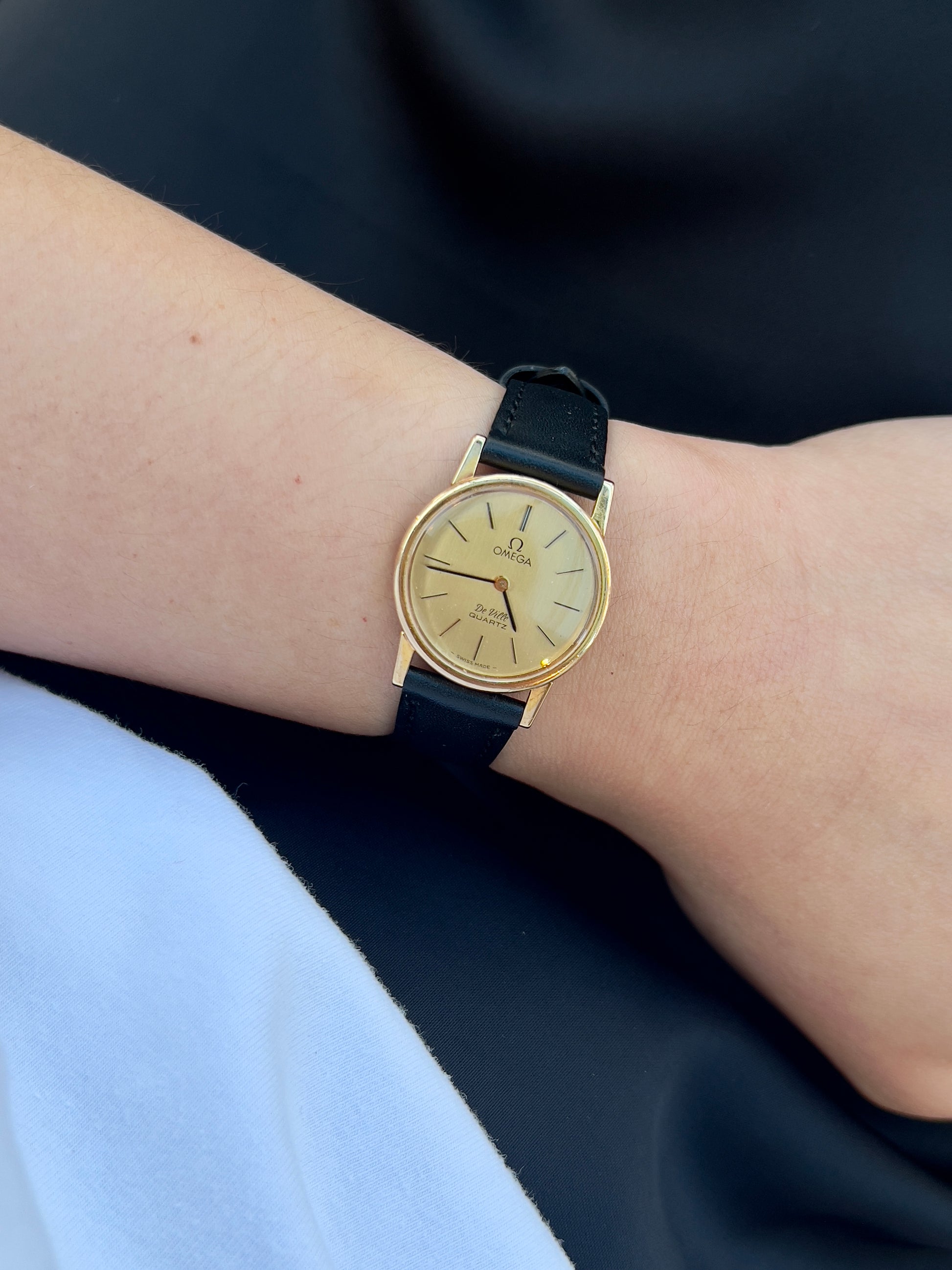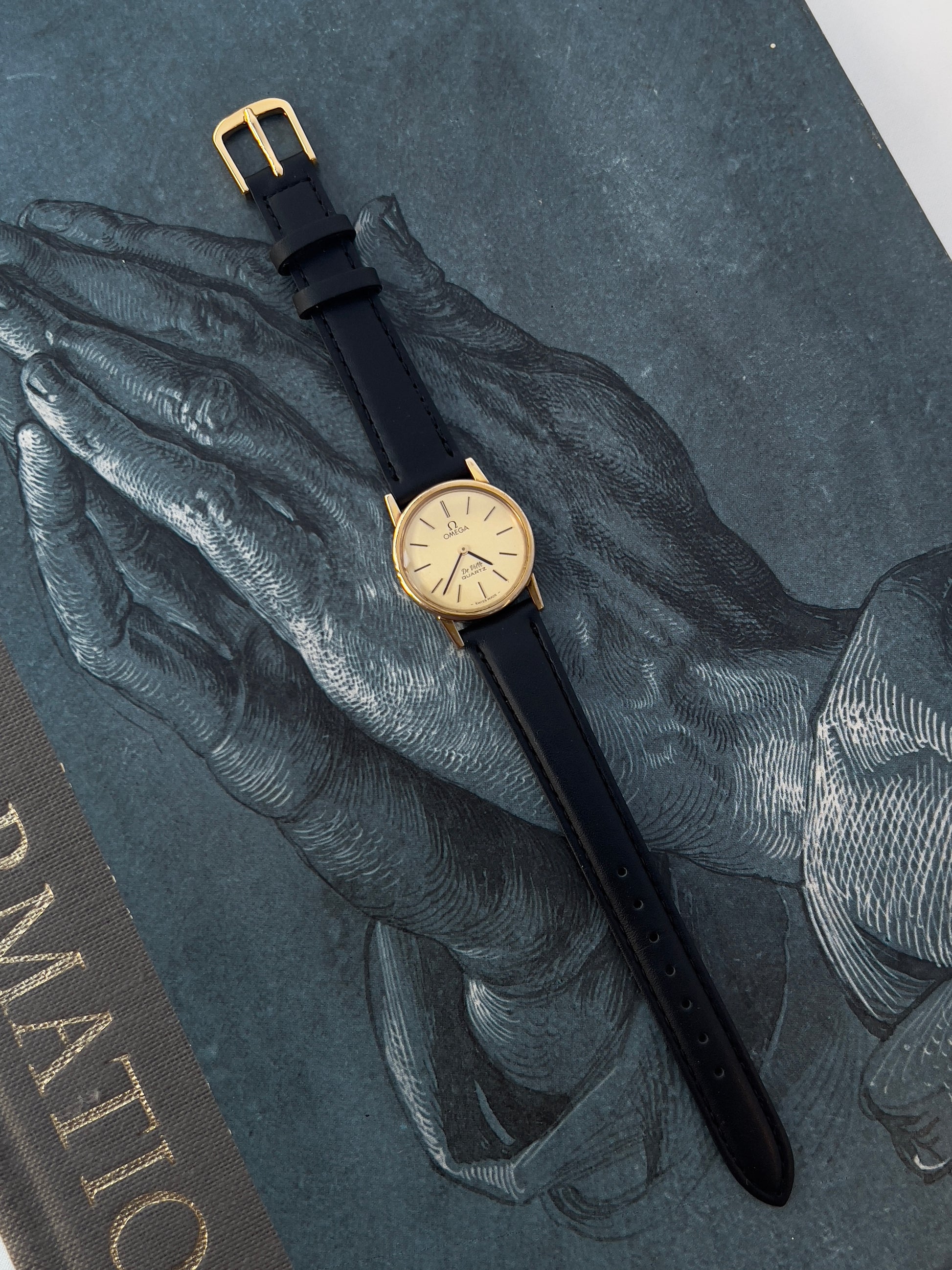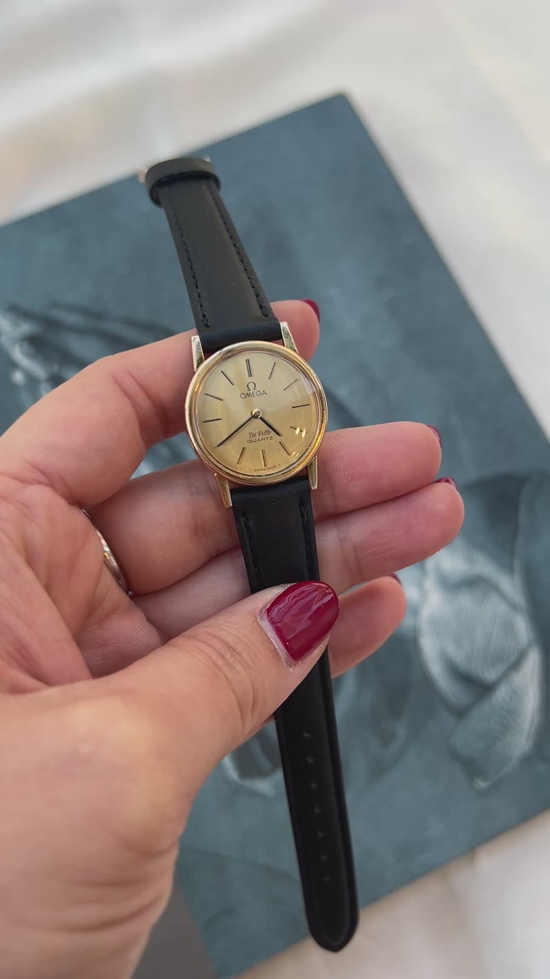 Clean design with a beautiful champagne dial, this Omega time piece is everything a "classic" watch looks like. Vintage in nature, reliable in use, the perfect blend of style and functionalism. This watch also has the Omega push crown system which gives it an even cleaner look.