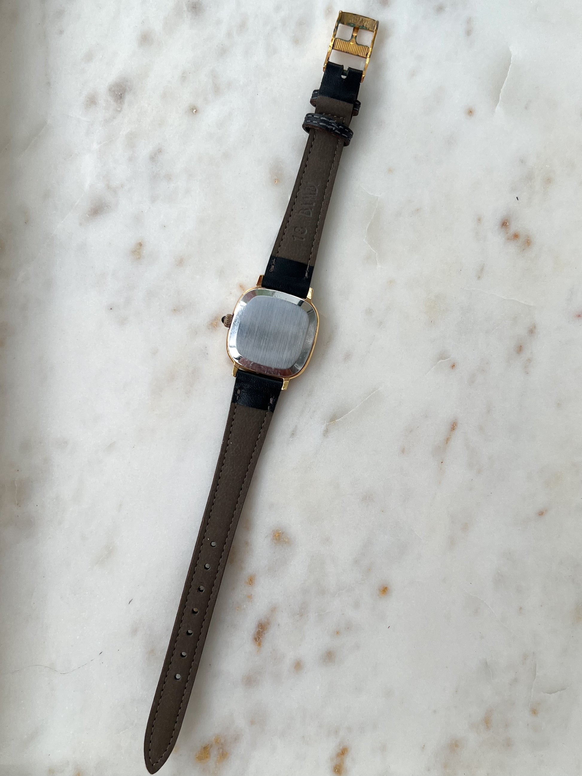 - Case: Gold-tone double cushion square case