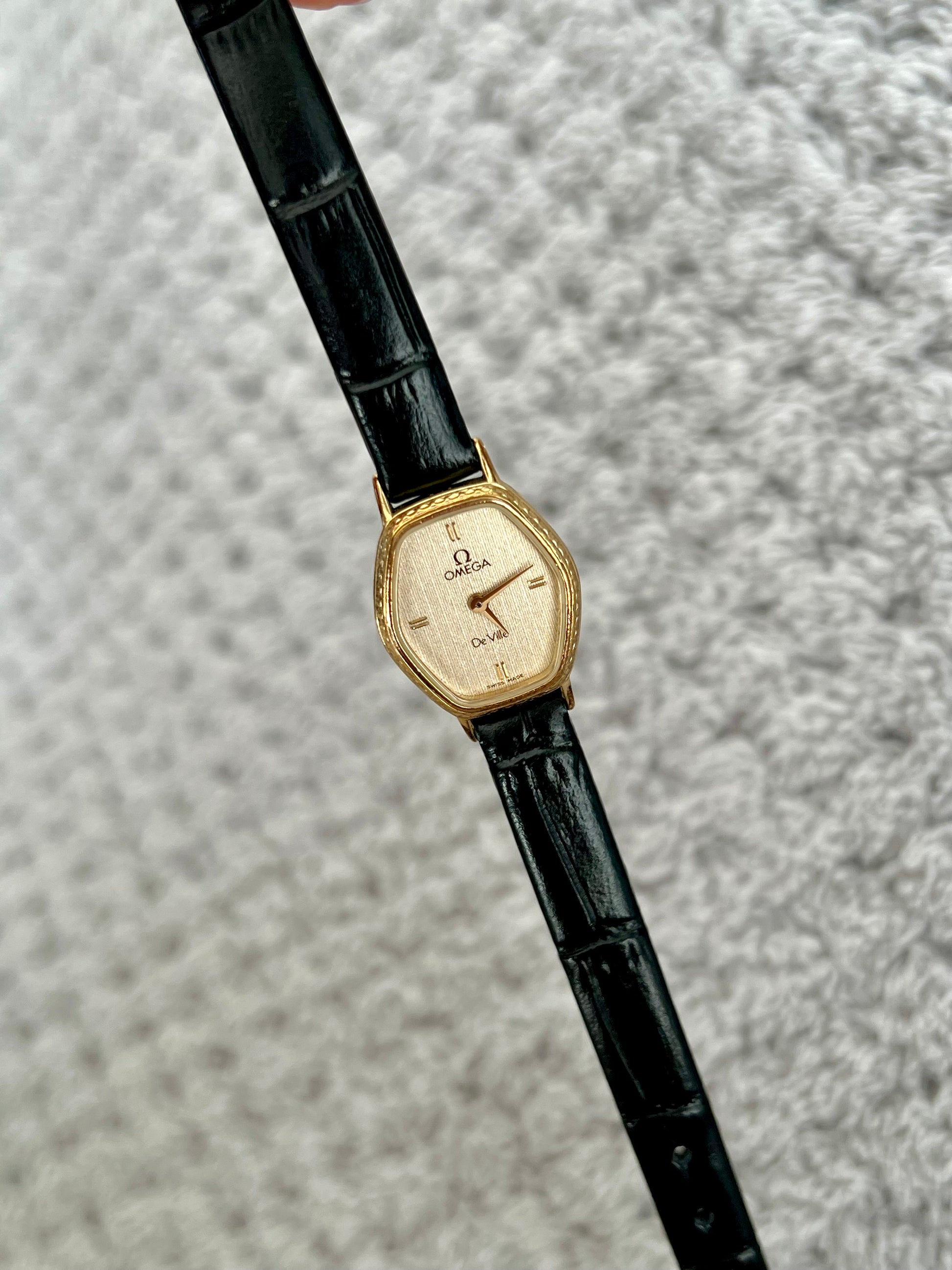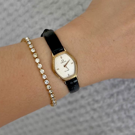 This Omega De Ville is a graceful timepiece that feels more like a jewel than a watch. Its rare tonneau-shaped case is plated in warm gold and finished with a delicate engraved edge, giving it a touch of old-world refinement.