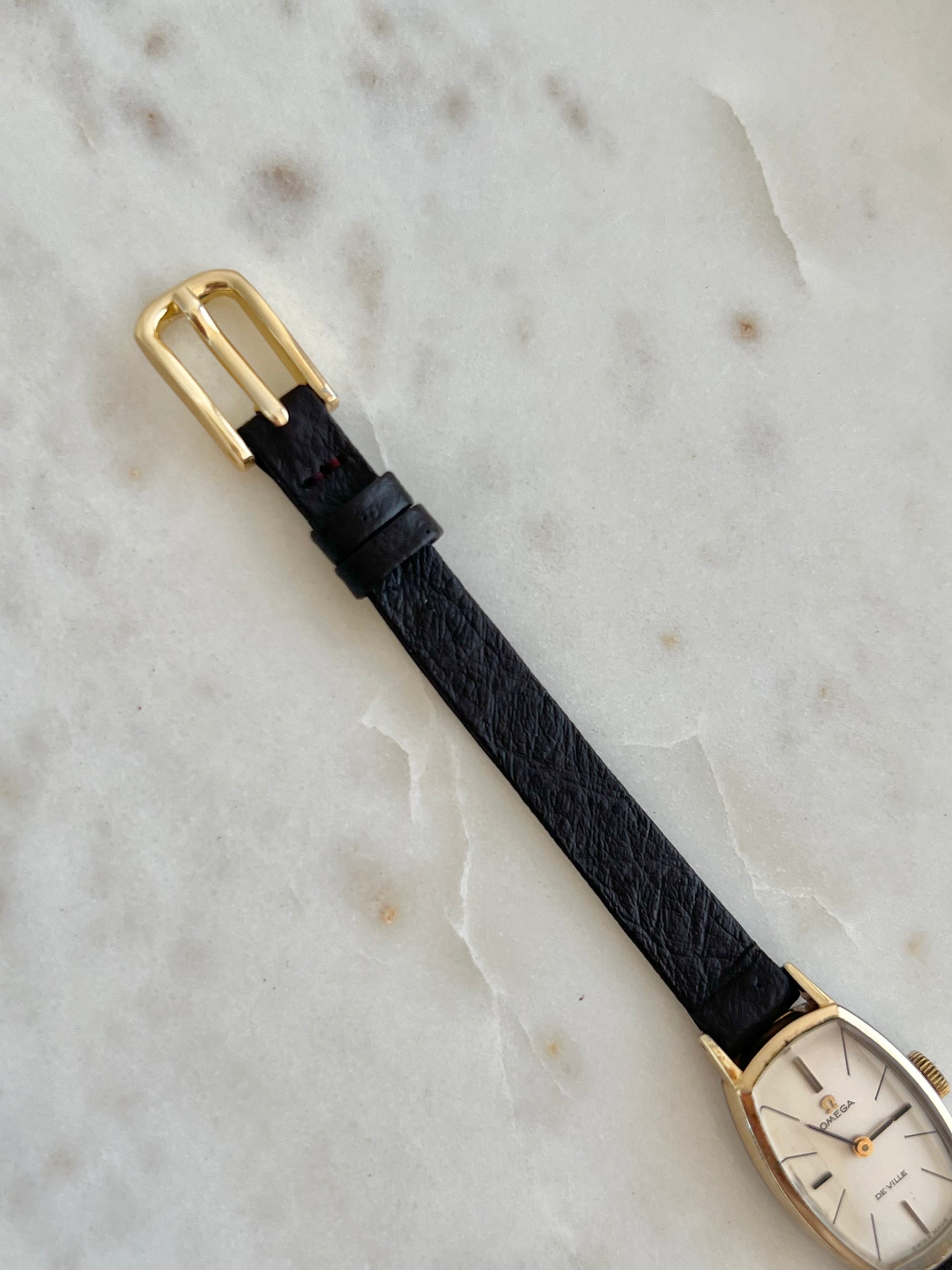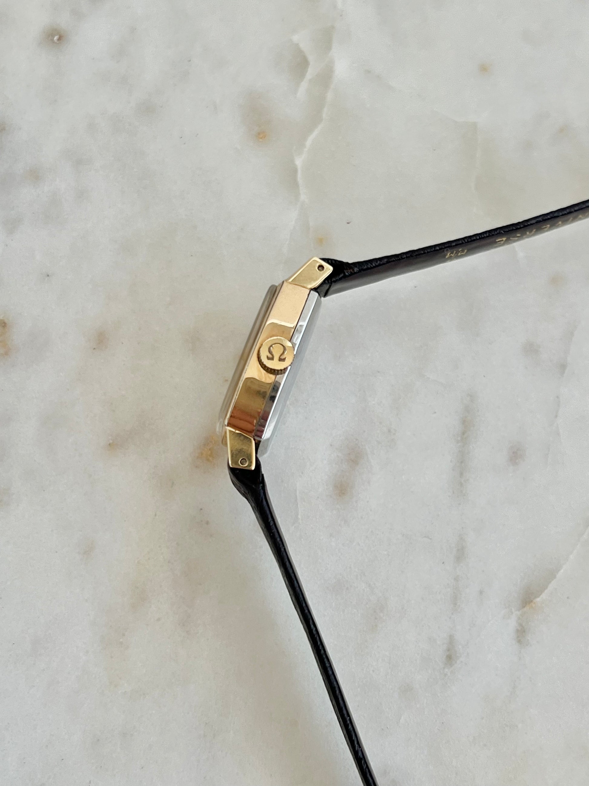 A slender Mechanical Omega De Ville defined by its elongated tonneau case and restrained dial layout. The dial is a soft ivory tone with a smooth finish, set with fine applied baton markers and slim dark hands that create gentle contrast. The polished gold tone case narrows at the centre and extends into delicate lugs, emphasising length while keeping the proportions light.