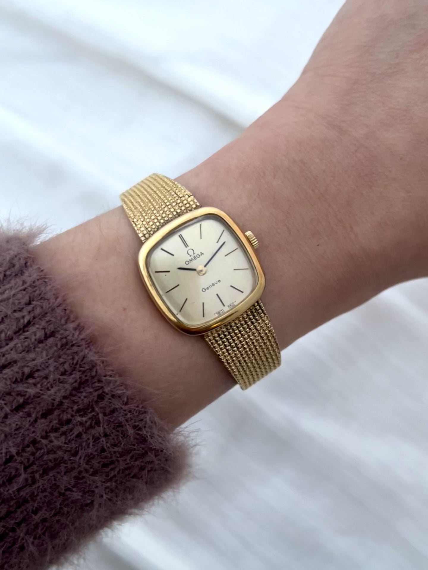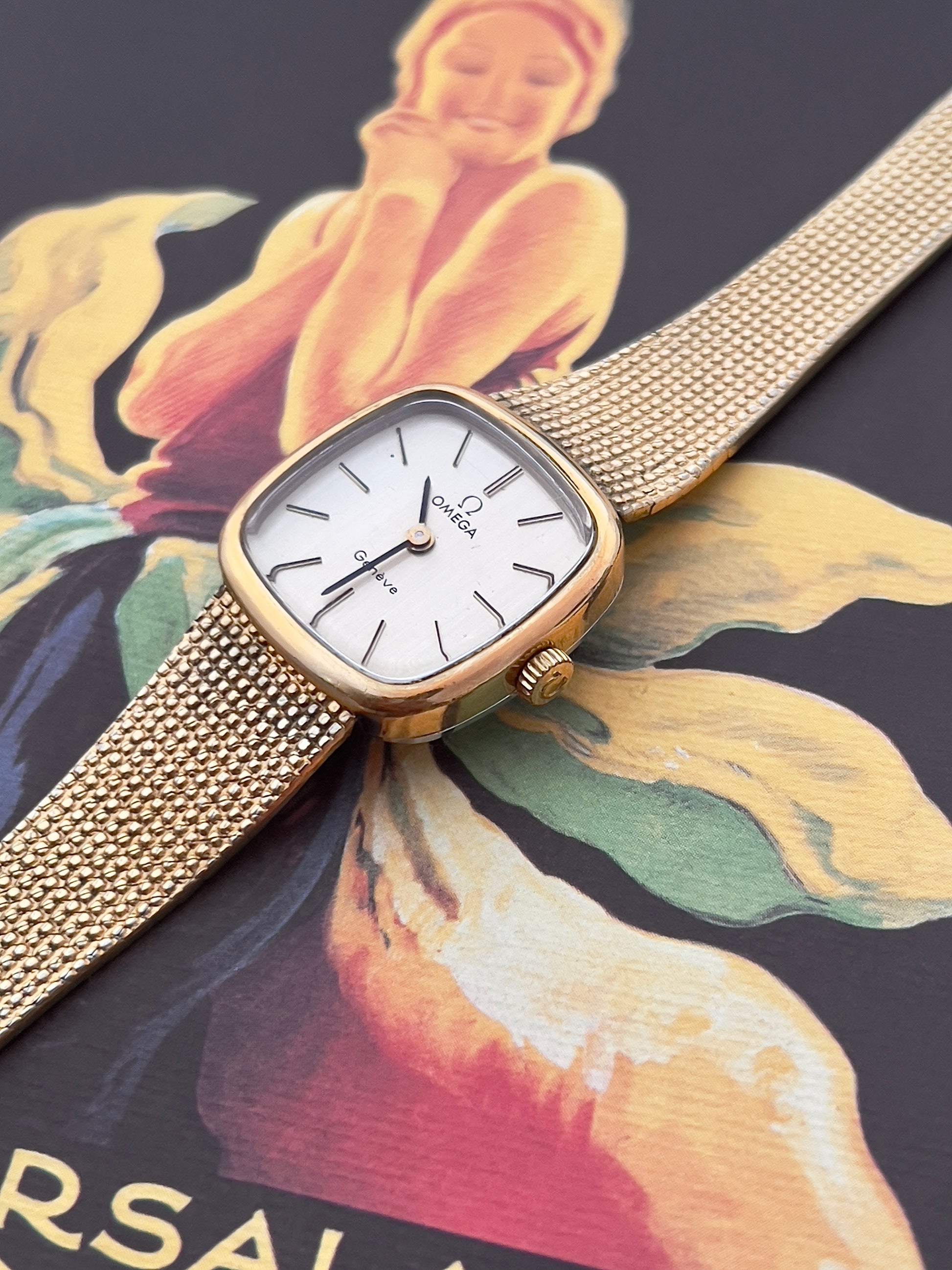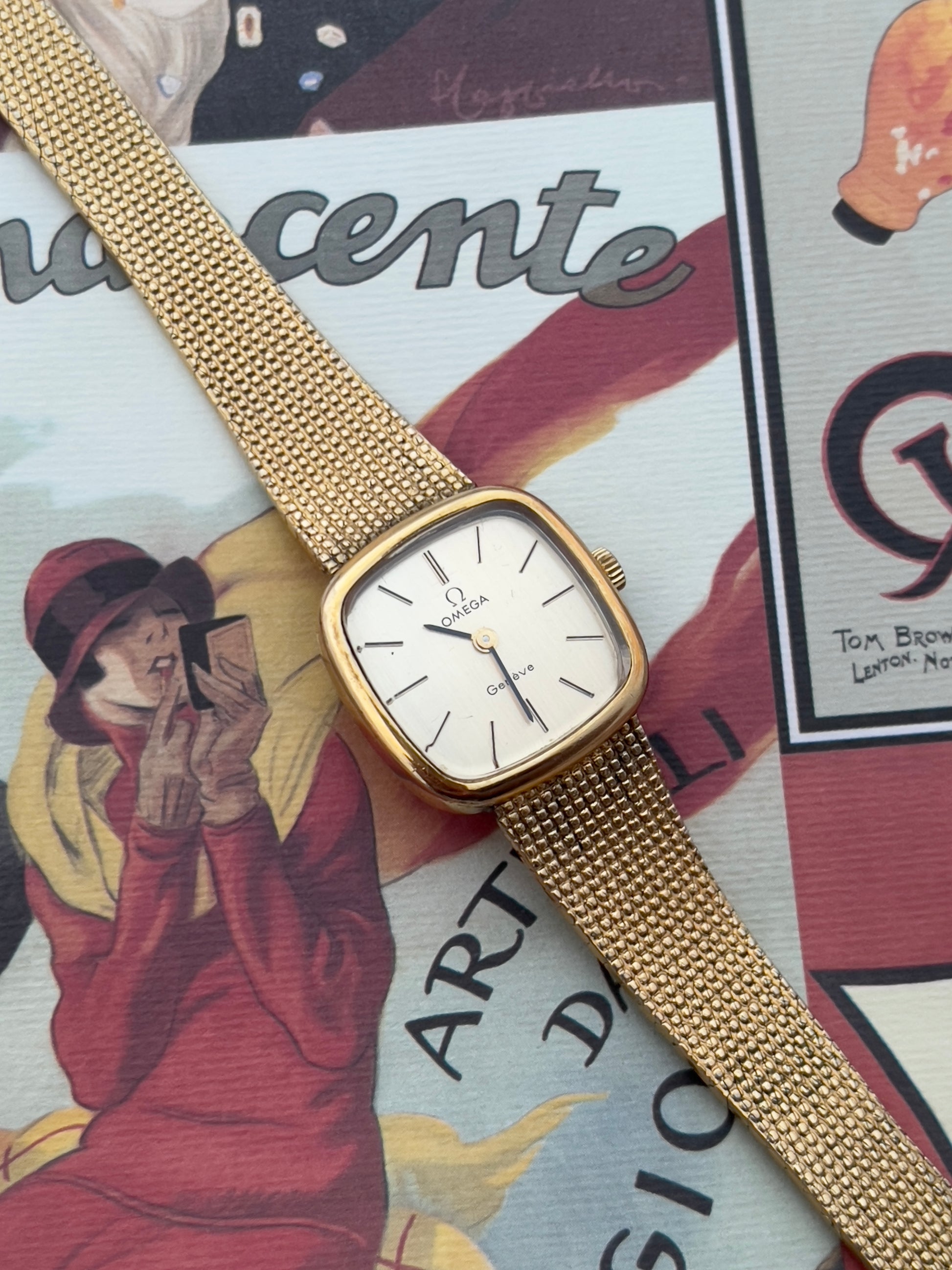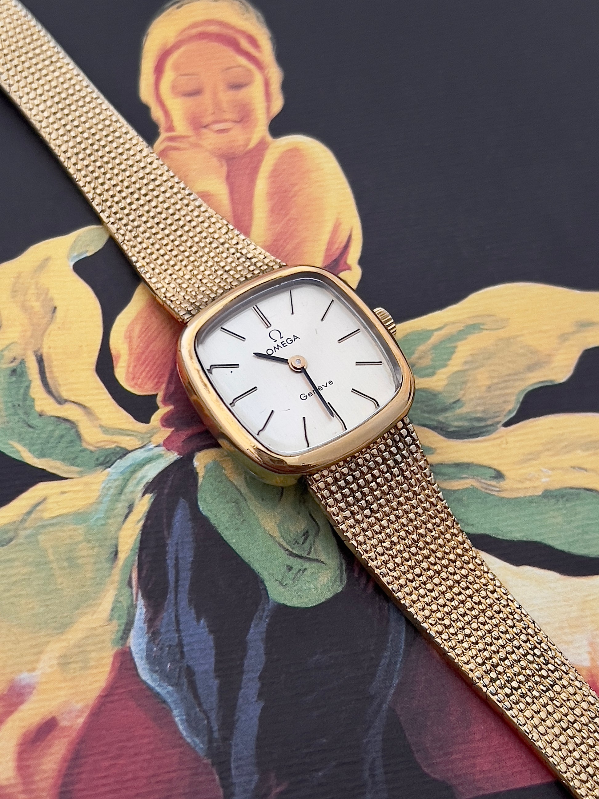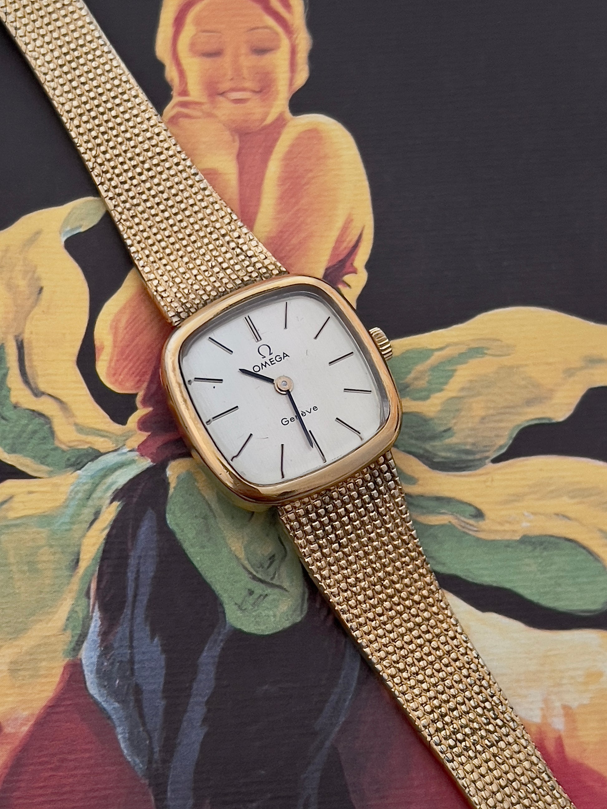 This vintage Omega Geneve embodies understated luxury, crafted for women who appreciate both fine jewellery and horological heritage. The softly rounded square case, finished in radiant gold-tone, frames a clean silver dial with minimalist baton hour markers and the Omega emblem at twelve. Elegant in its restraint, it captures the refined character of the Geneve line, a collection celebrated for its balance of Swiss precision and contemporary style.