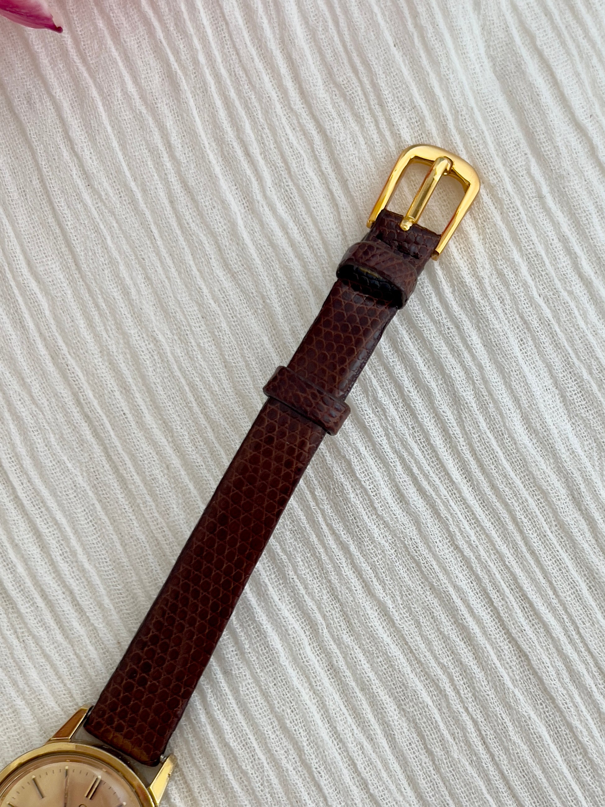 The tapered lugs flow into a brown leather strap with a refined reptile grain, its texture grounding the watch in understated luxury. Petite in size, the watch sits lightly on the wrist, carrying the presence of a jewel while retaining the clean clarity of Swiss design.