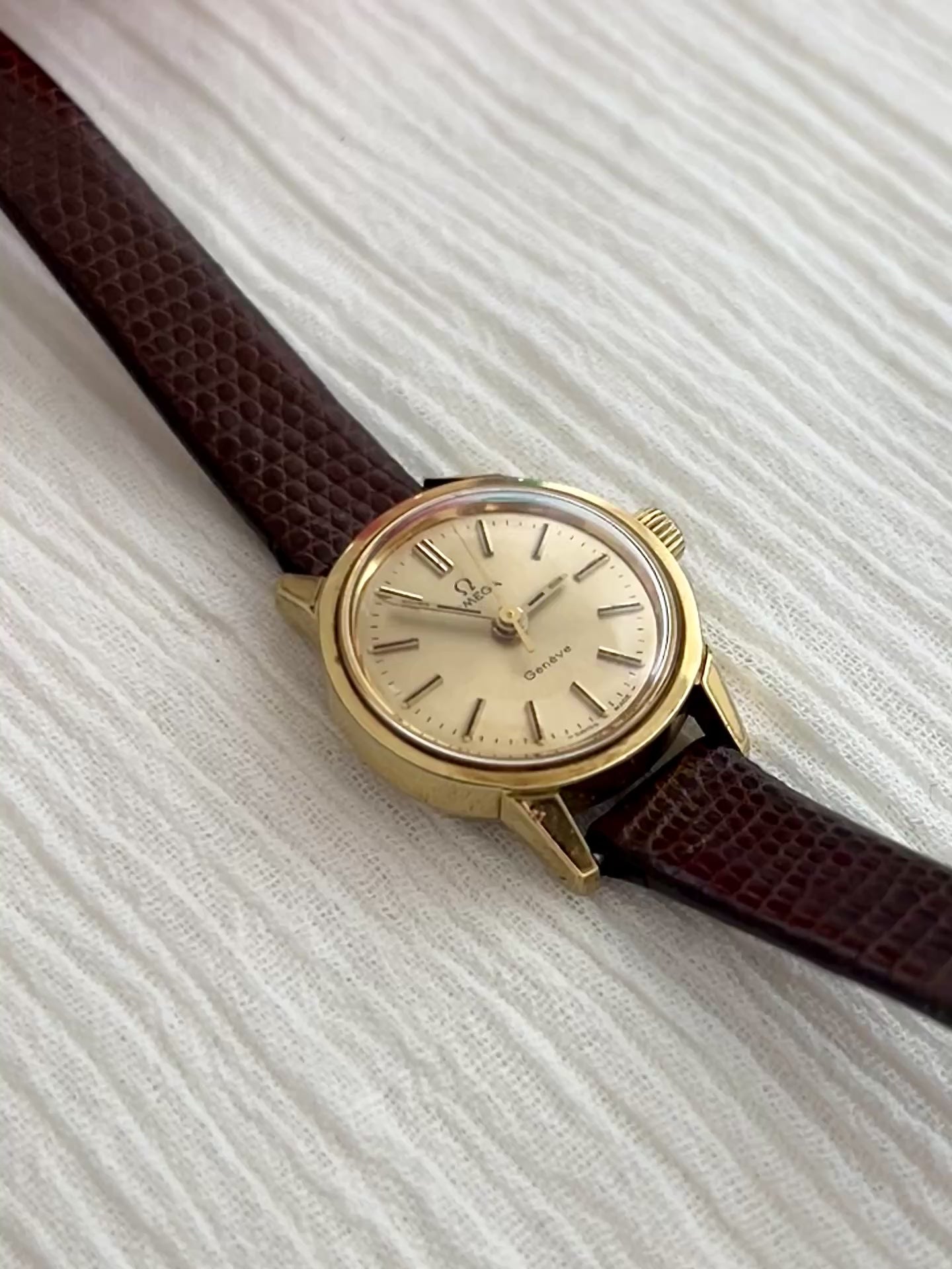 Sunburst champagne with linear markers, polished gold against textured leather, modernist clarity softened by delicate scale. This is a ladies’ Omega that moves easily between day and evening, timeless in its simplicity.
