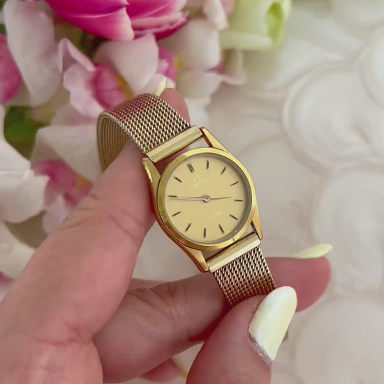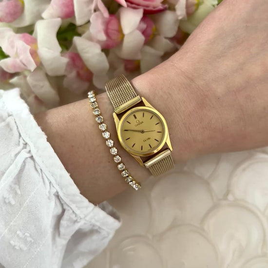 This Omega De Ville whispers refinement with its golden satin dial and mesh bracelet that hugs the wrist like liquid gold. Against that warm canvas, the silver Omega emblem and name rise with quiet contrast, lending a silvery gleam amid the gold hue. The slim polished case frames the dial like a precious mirror, while the mesh band subsumes geometry and texture into seamless radiance. The overall effect: a watch that feels more like a finely wrought wrist jewel than a timekeeping tool: understated, luminous, and uniquely composed.