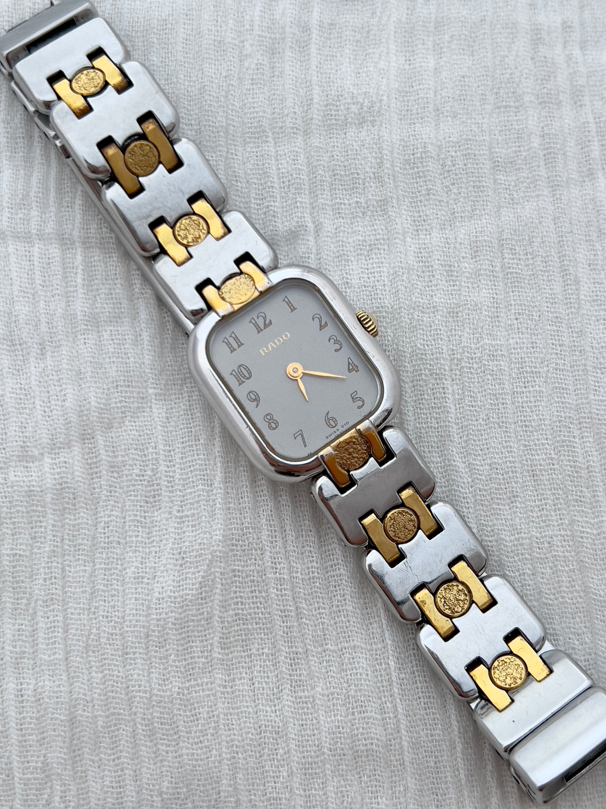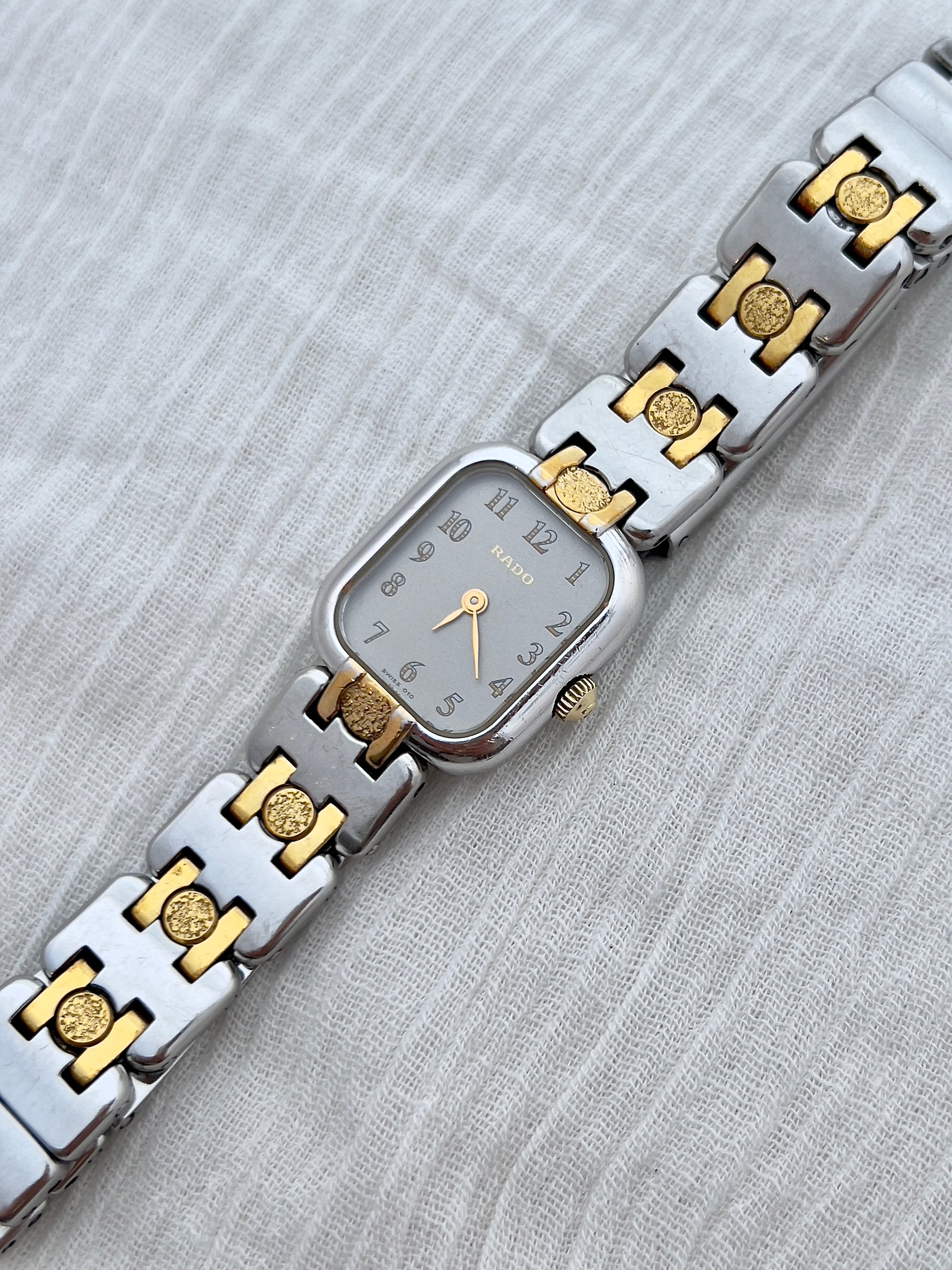 Distinctive and refined, this Rado ladies watch captures the sculptural beauty of modernist design. Its silver dial glows softly beneath curved crystal, adorned with golden numerals and hands that bring gentle warmth to the steel case. The two tone bracelet, with its polished silver panels and gold circular motifs, feels more like jewellery than machinery, wrapping the wrist in quiet opulence.