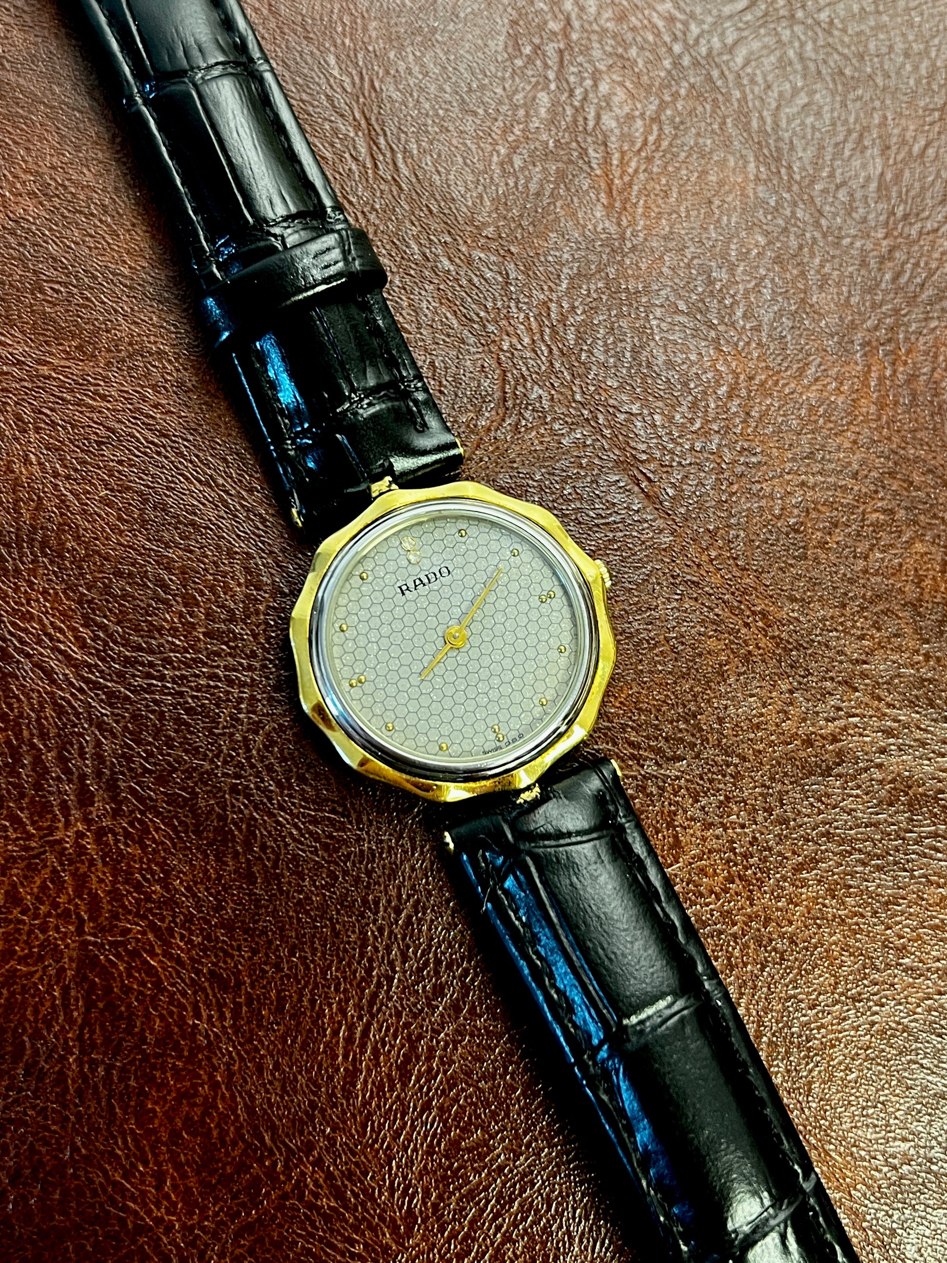This vintage Rado ladies quartz watch blooms with elegance, its gold-tone bezel shaped like the delicate petals of a flower. The softly scalloped case design evokes a blossoming form, giving the watch a jewellery-like grace that sets it apart from conventional round silhouettes. At its heart lies a rare honeycomb-pattern dial, detailed with subtle gold indices and slim baton hands for a minimalist yet luxurious touch.