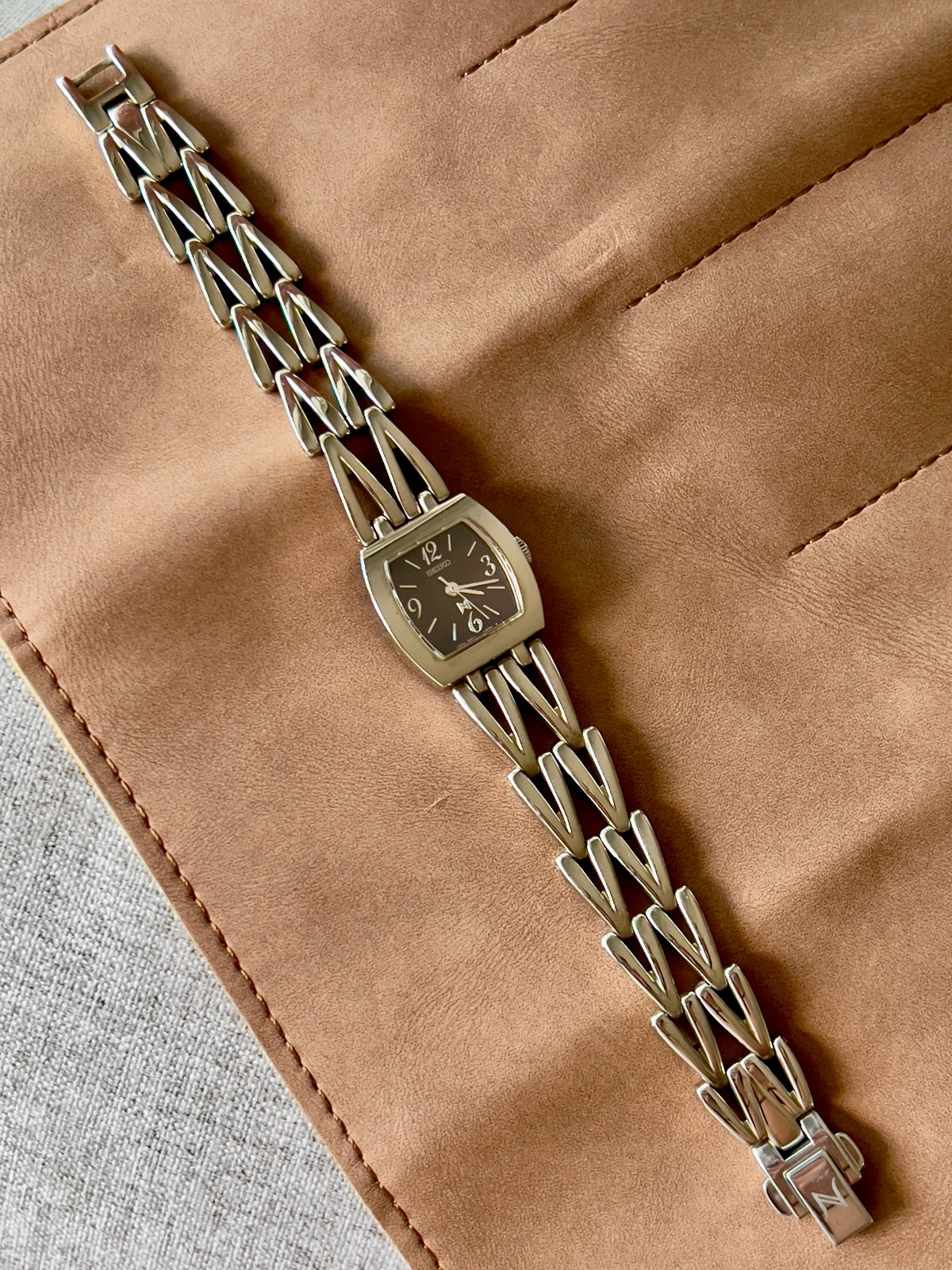 This elegant Seiko women’s watch features a stylish, rectangular dial with bold numerals and a deep brown sunburst finish, offering a sophisticated yet timeless appeal. The watch is complemented by a unique, fluid metal bracelet with elongated links that provide a sleek and contemporary look. Ideal for formal or everyday wear, this piece combines Seiko’s renowned precision with a refined design, making it a standout addition to any collection.