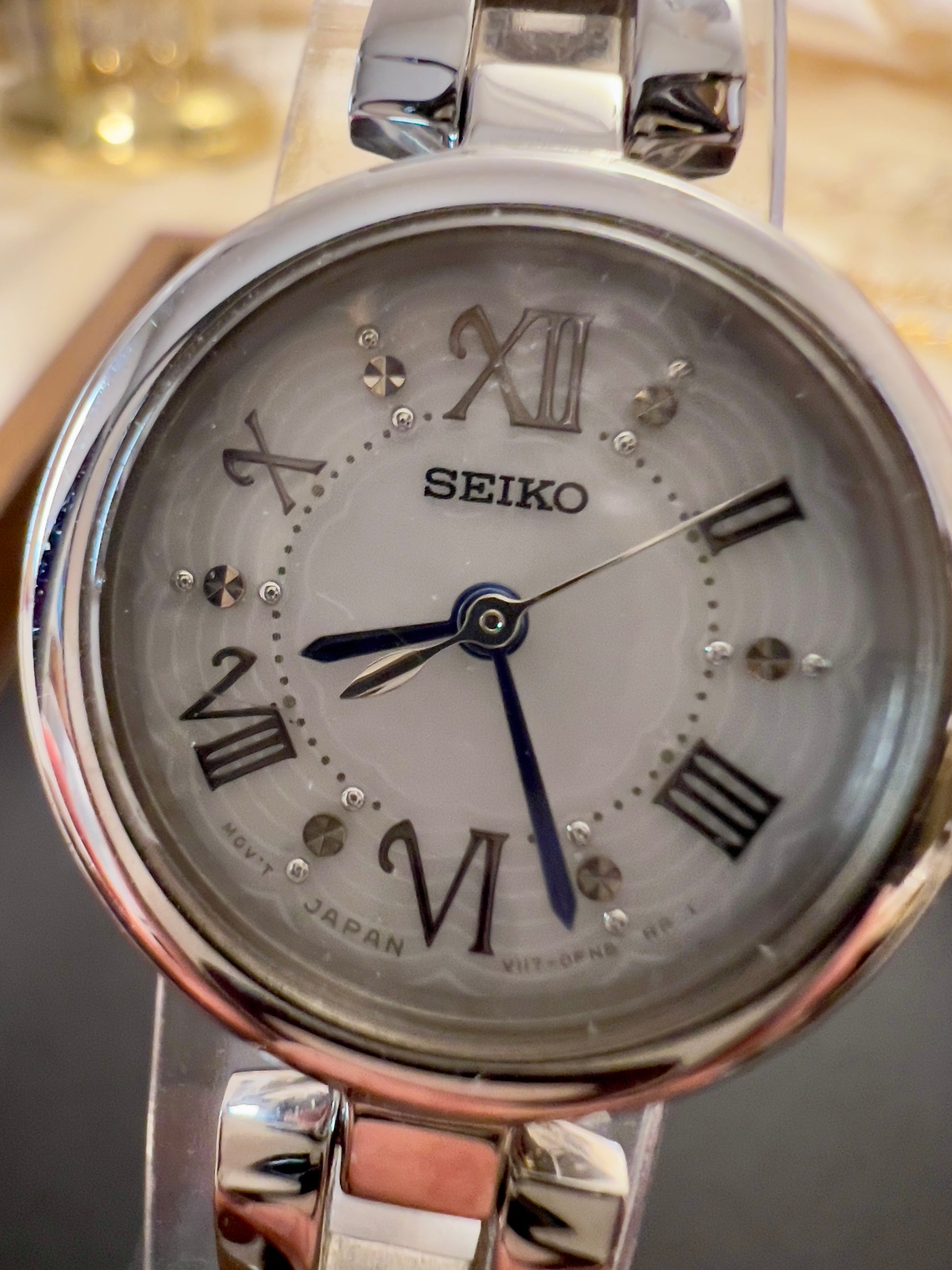 This time piece has a playful and fun vibe. Simple watch with a beautiful dial adorned by crystals and blued hands.