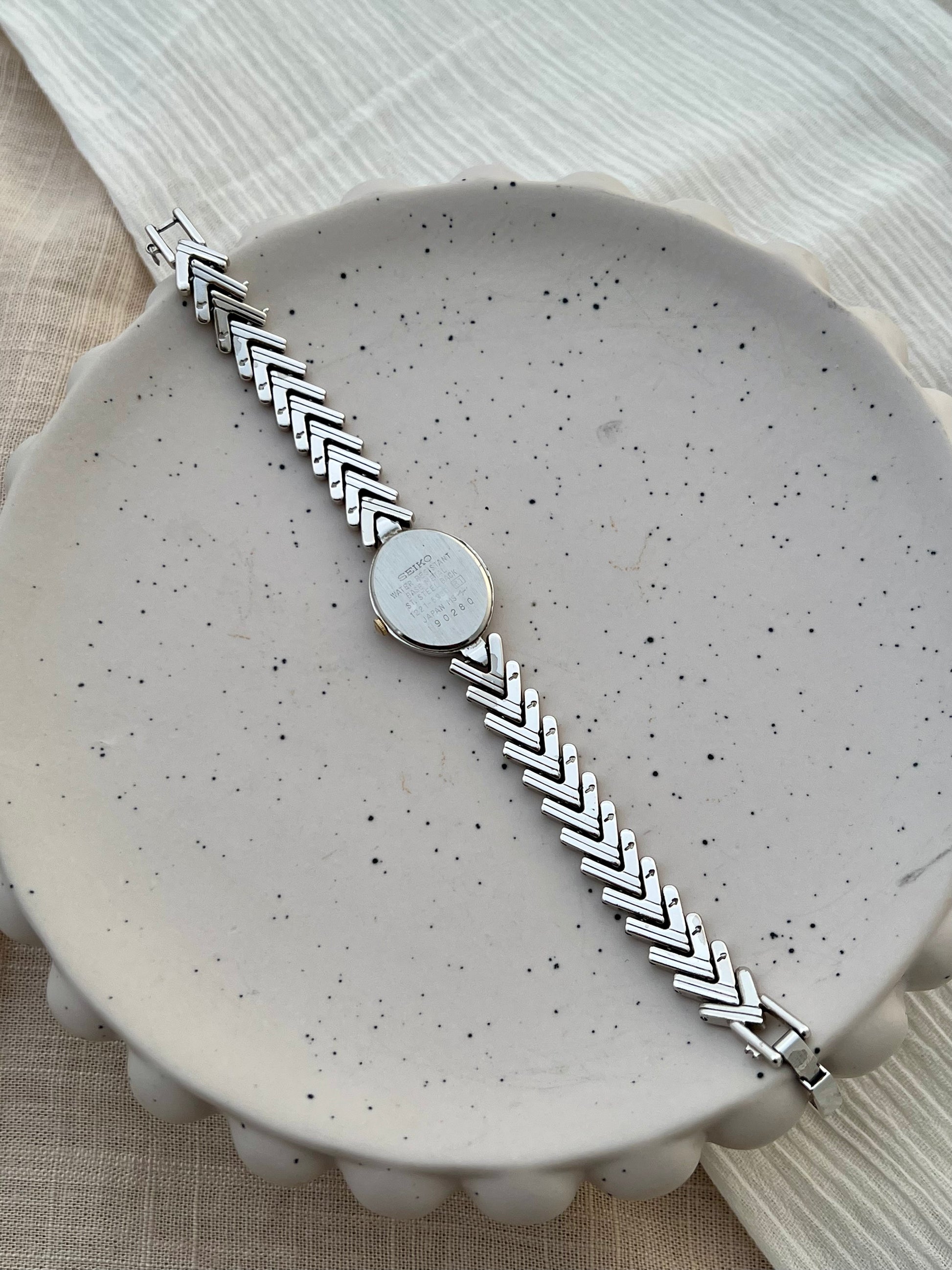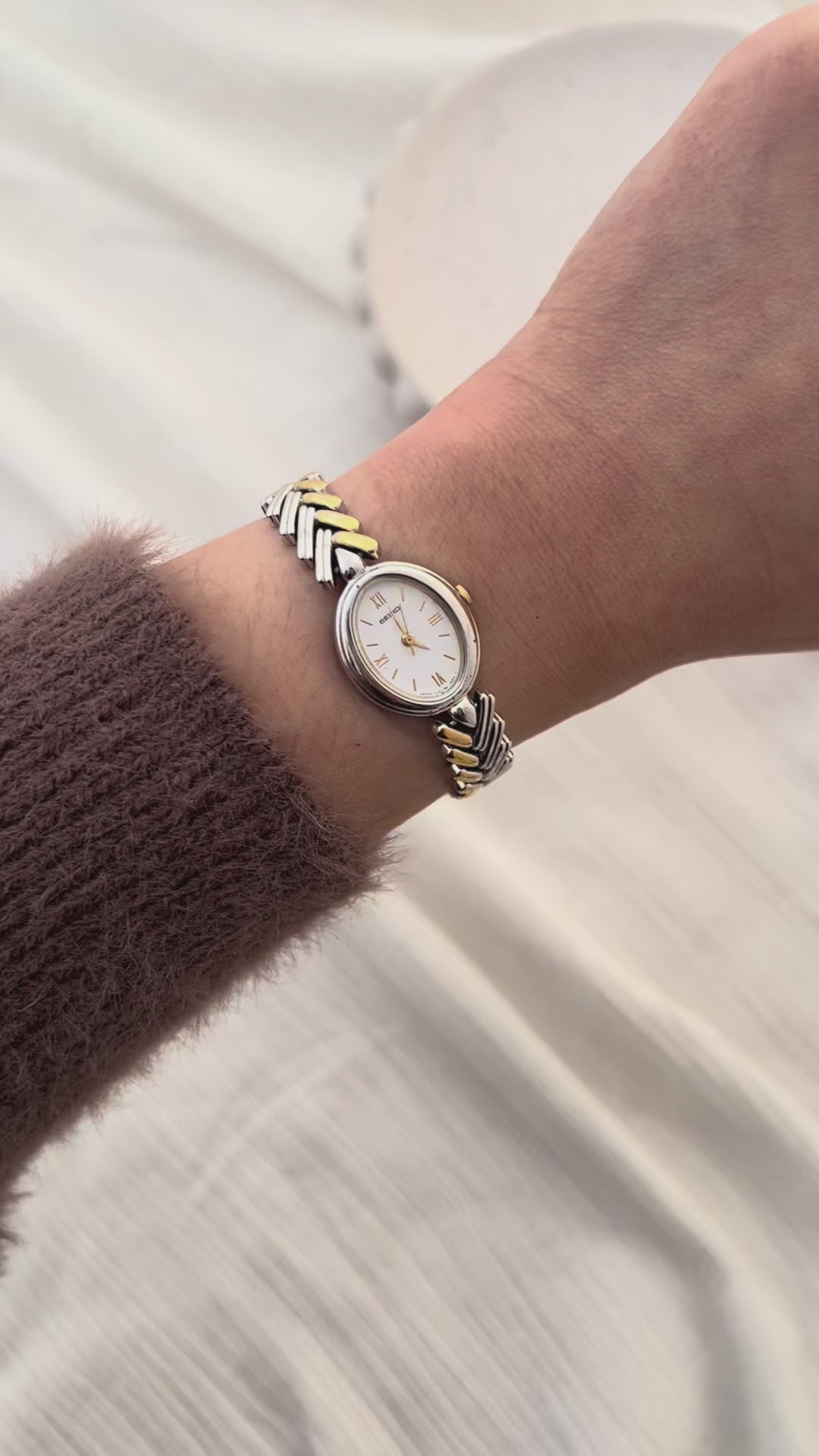 This Seiko ladies watch embodies understated sophistication with its slim oval case in polished silver tone and a radiant white dial marked by gilt Roman numerals and bar indices. The elegant bracelet features an alternating gold and silver herringbone design that captures light with every movement, creating a refined jewellery like effect. A timepiece that balances classic Seiko precision with graceful styling, it is perfect for women who appreciate subtle luxury in their daily wear and collection pieces.