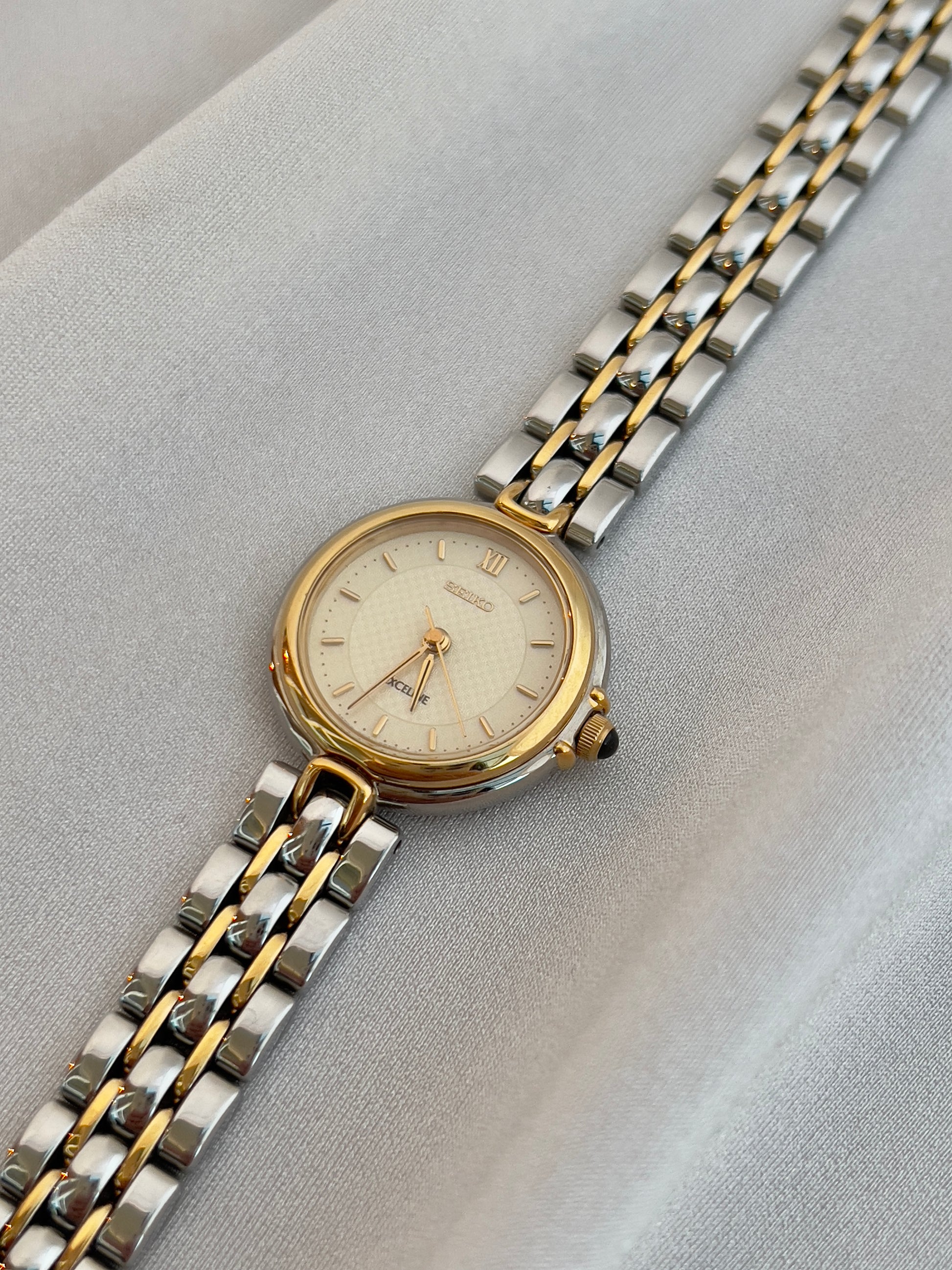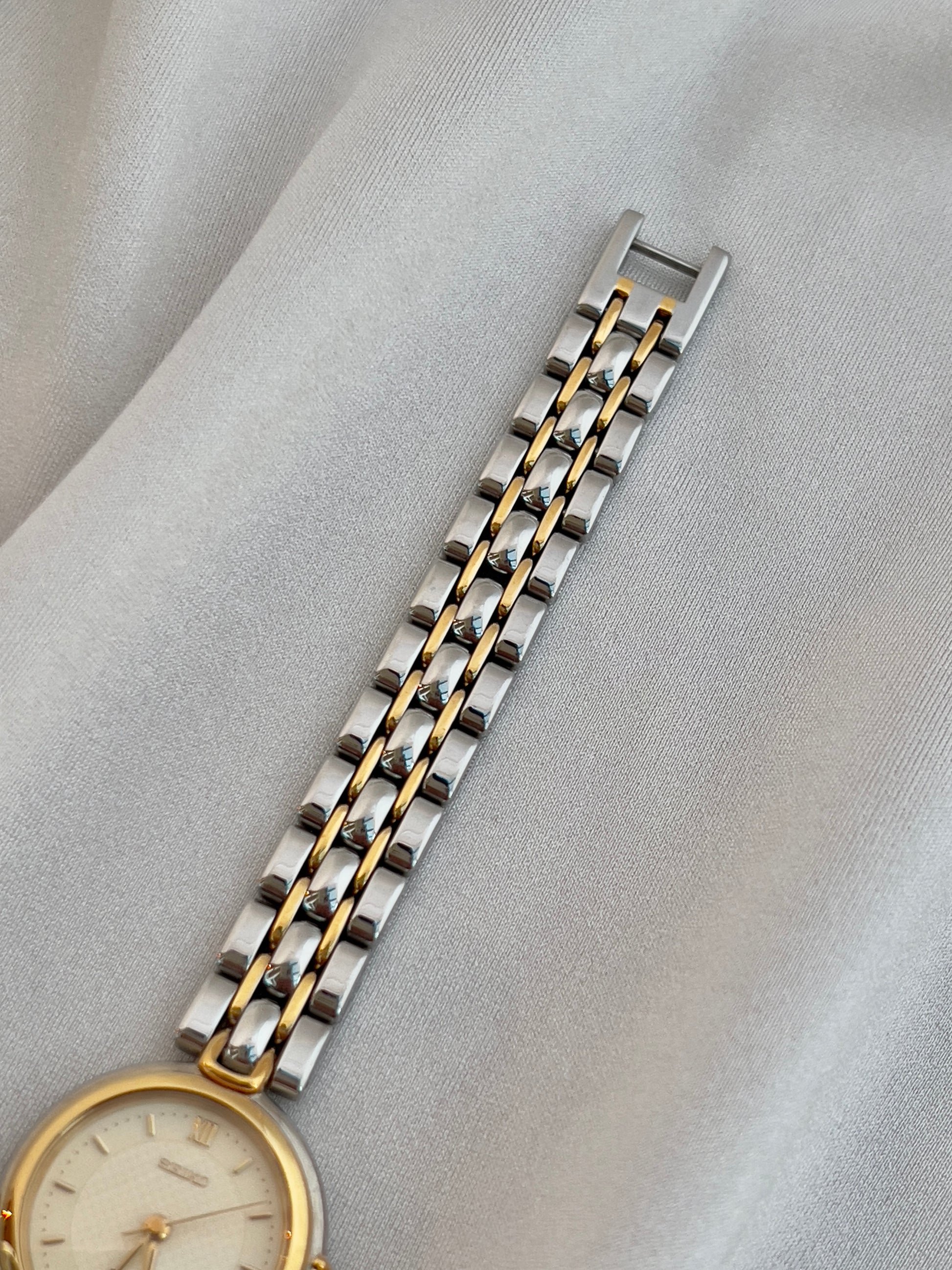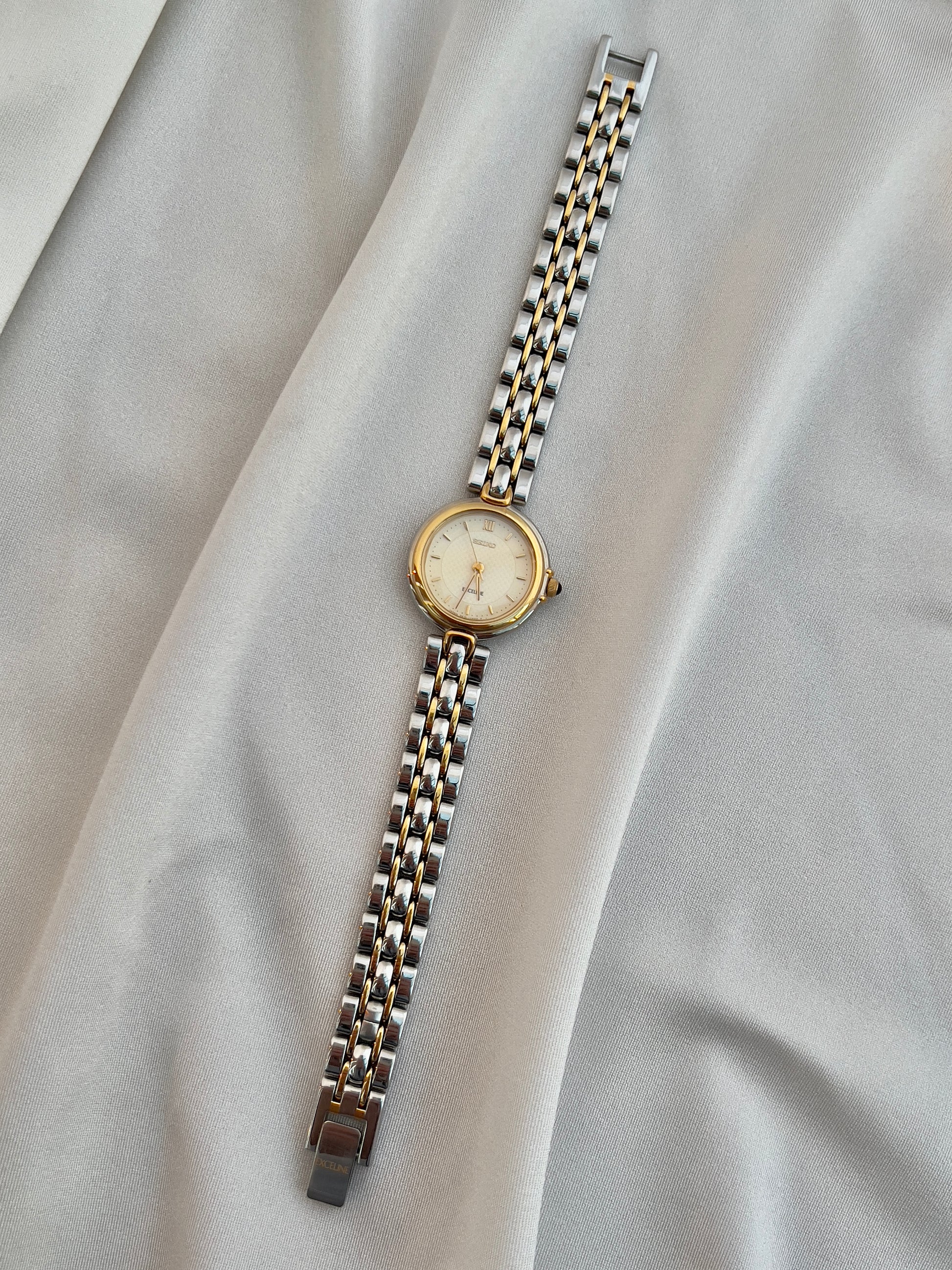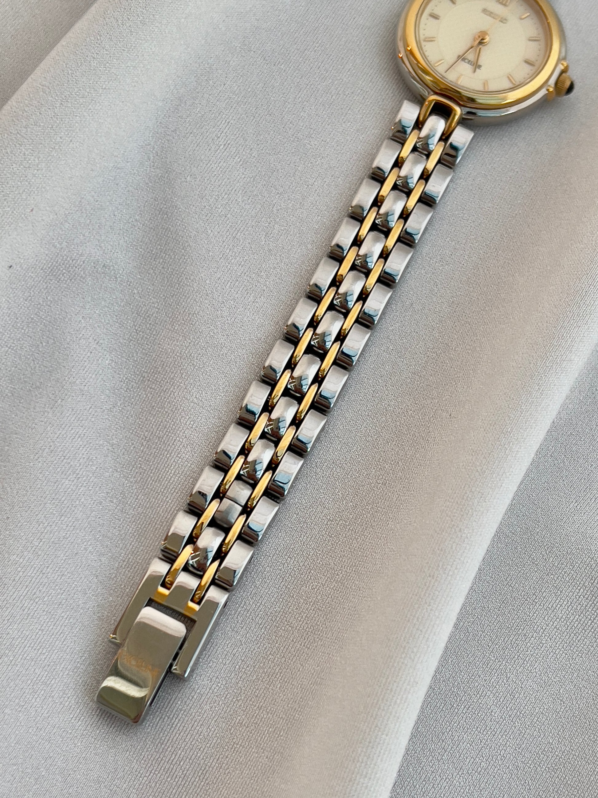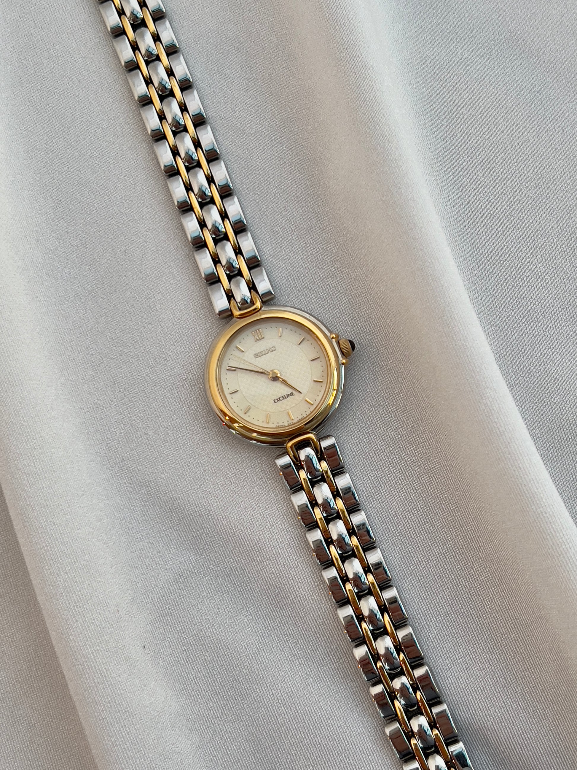 Petite and beautifully refined, this Seiko Exceline reads like fine jewellery. A rounded gold tone bezel frames a soft ivory dial set under a clear domed crystal that gives a gentle glow and a pleasing distortion at the edges. The dial is two tier, with a woven textured centre and a subtle stepped ring carrying pearl like minute dots. Applied gold markers and a single Roman numeral at twelve keep the look elegant, while slender dauphine hands complete the composition. The crown is neatly fluted, the lugs flow into small gold oval connectors, and the whole case sits slim on the wrist.
