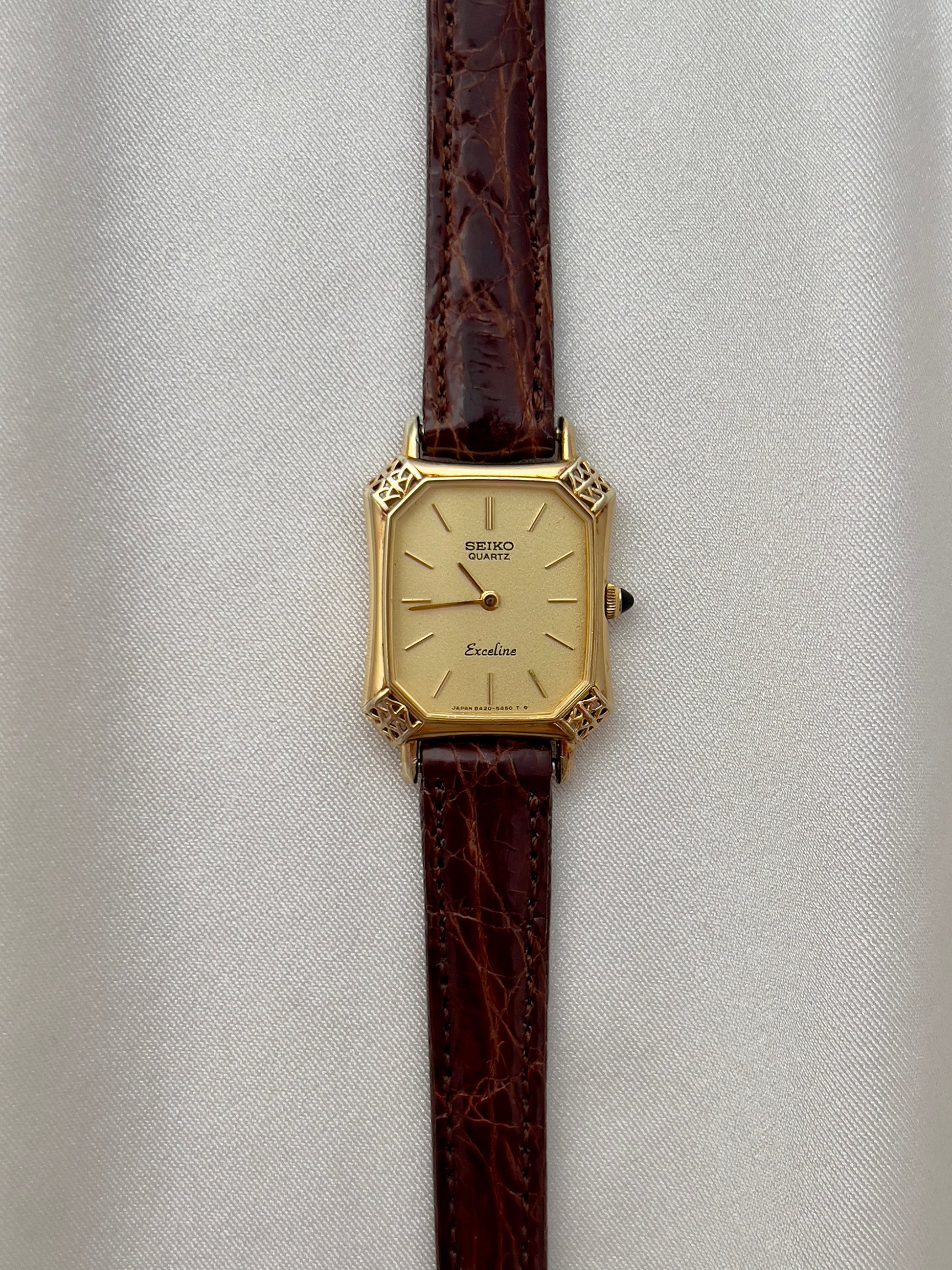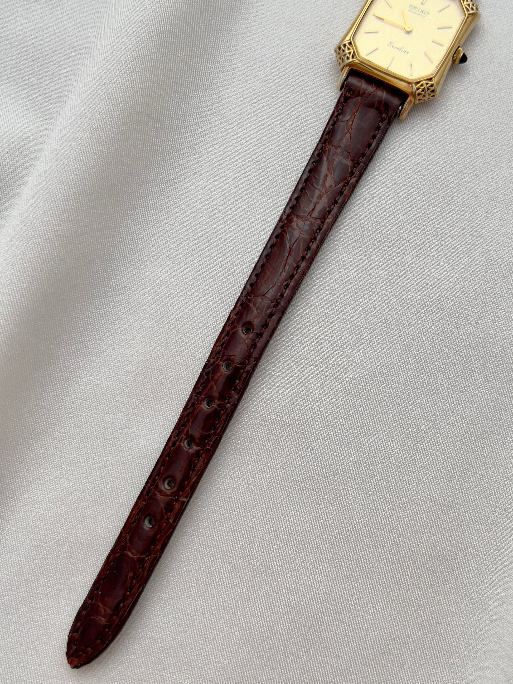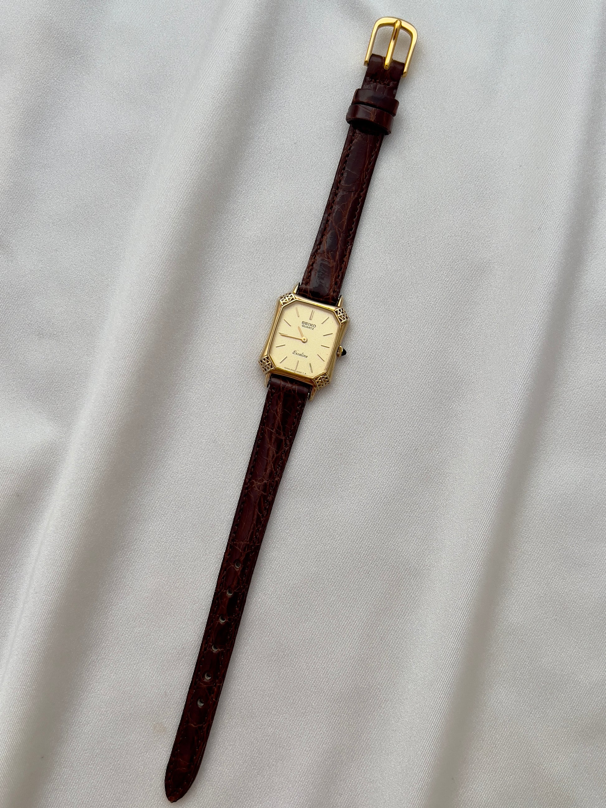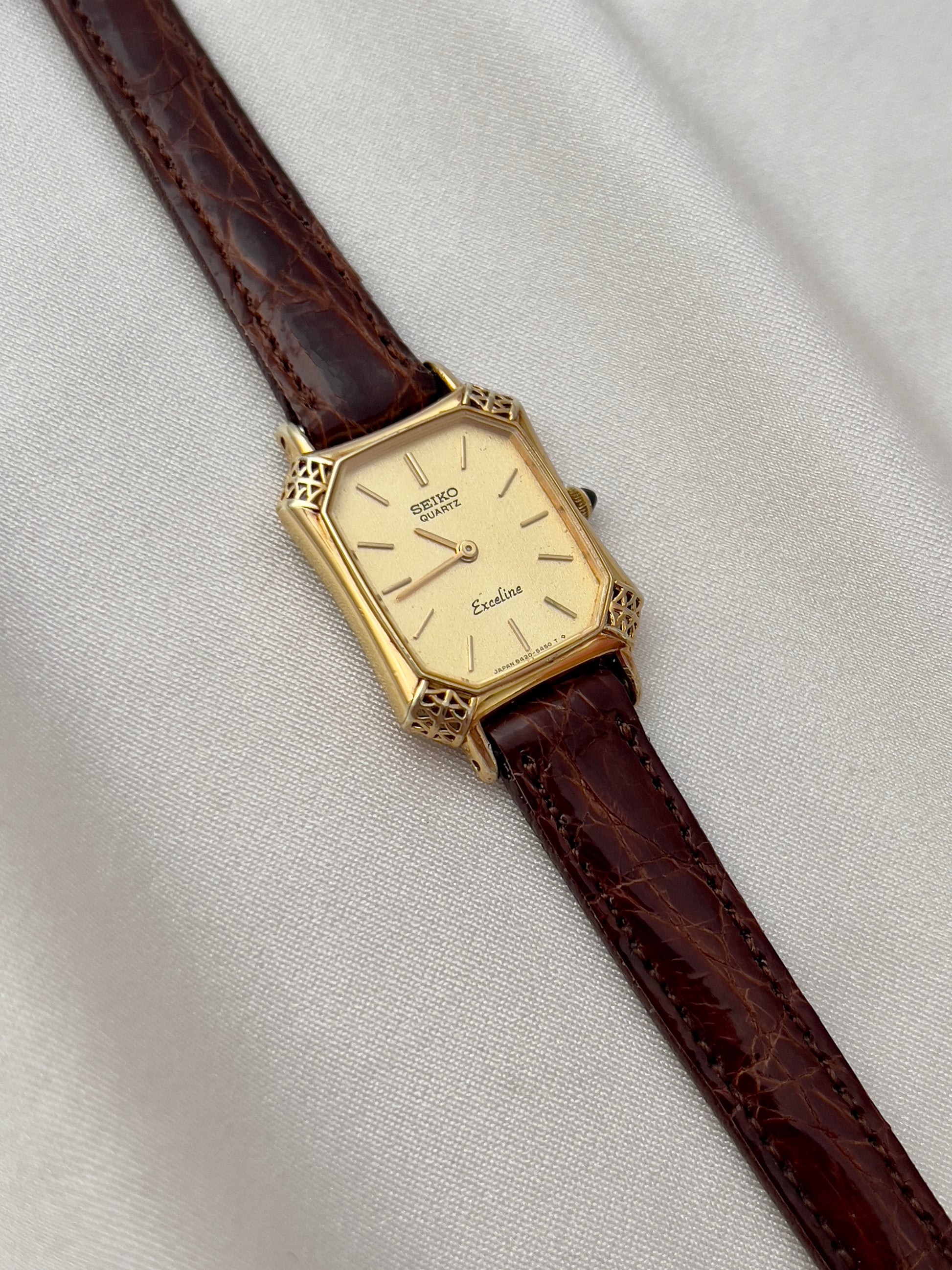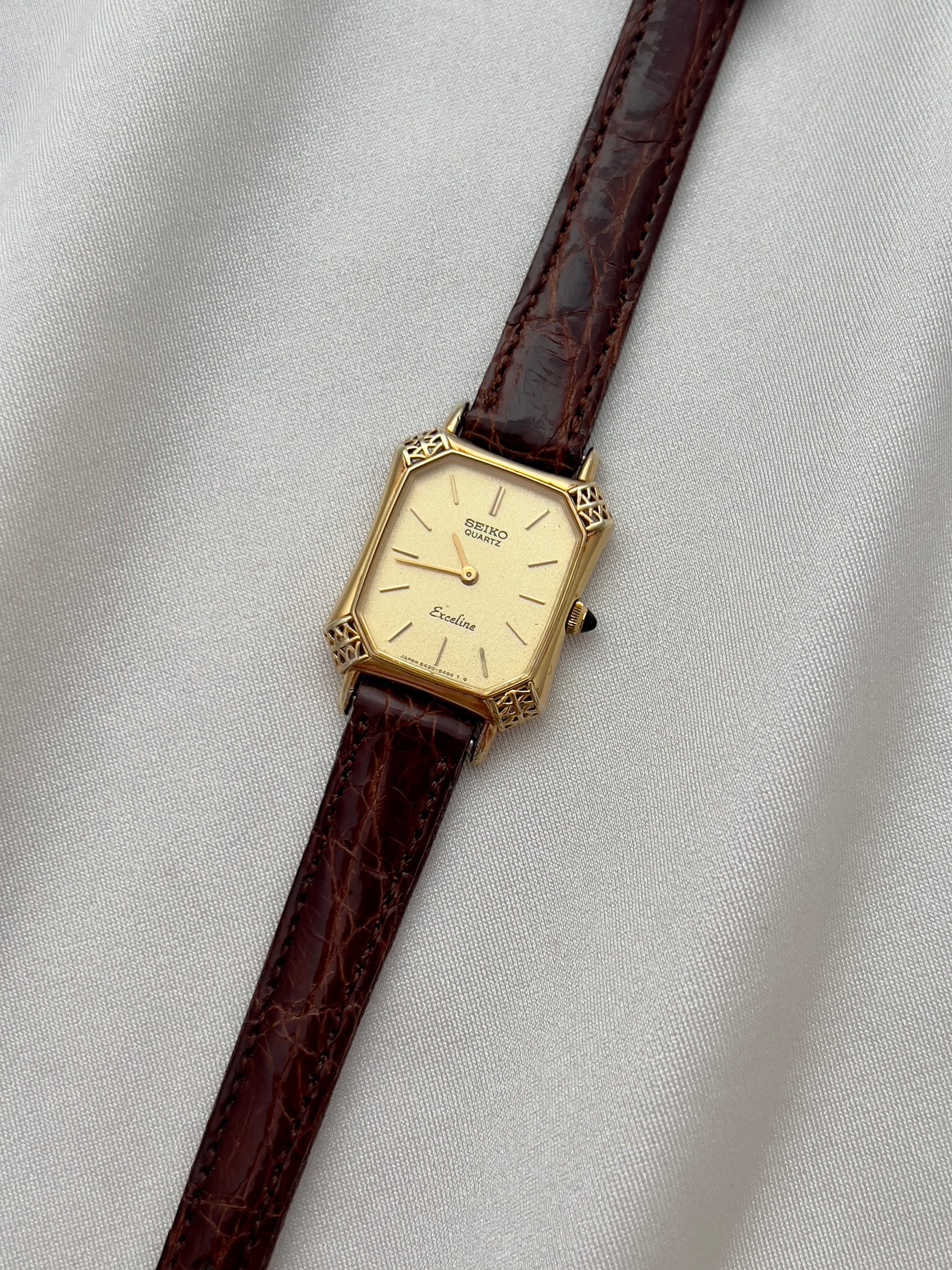 This Seiko Exceline ladies’ watch is a rare example of Japanese craftsmanship meeting European-inspired luxury design. Its gold-tone tank case is elevated with beautifully filigreed, lattice-style corner details that give the watch a jewel-like presence on the wrist. The black cabochon crown adds an extra note of refinement, echoing the elegance of high-fashion Parisian horology.
