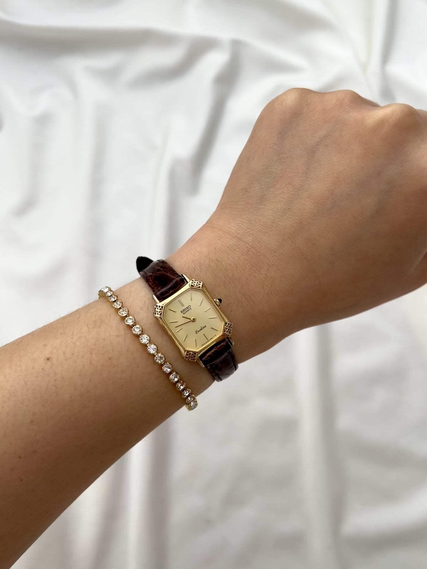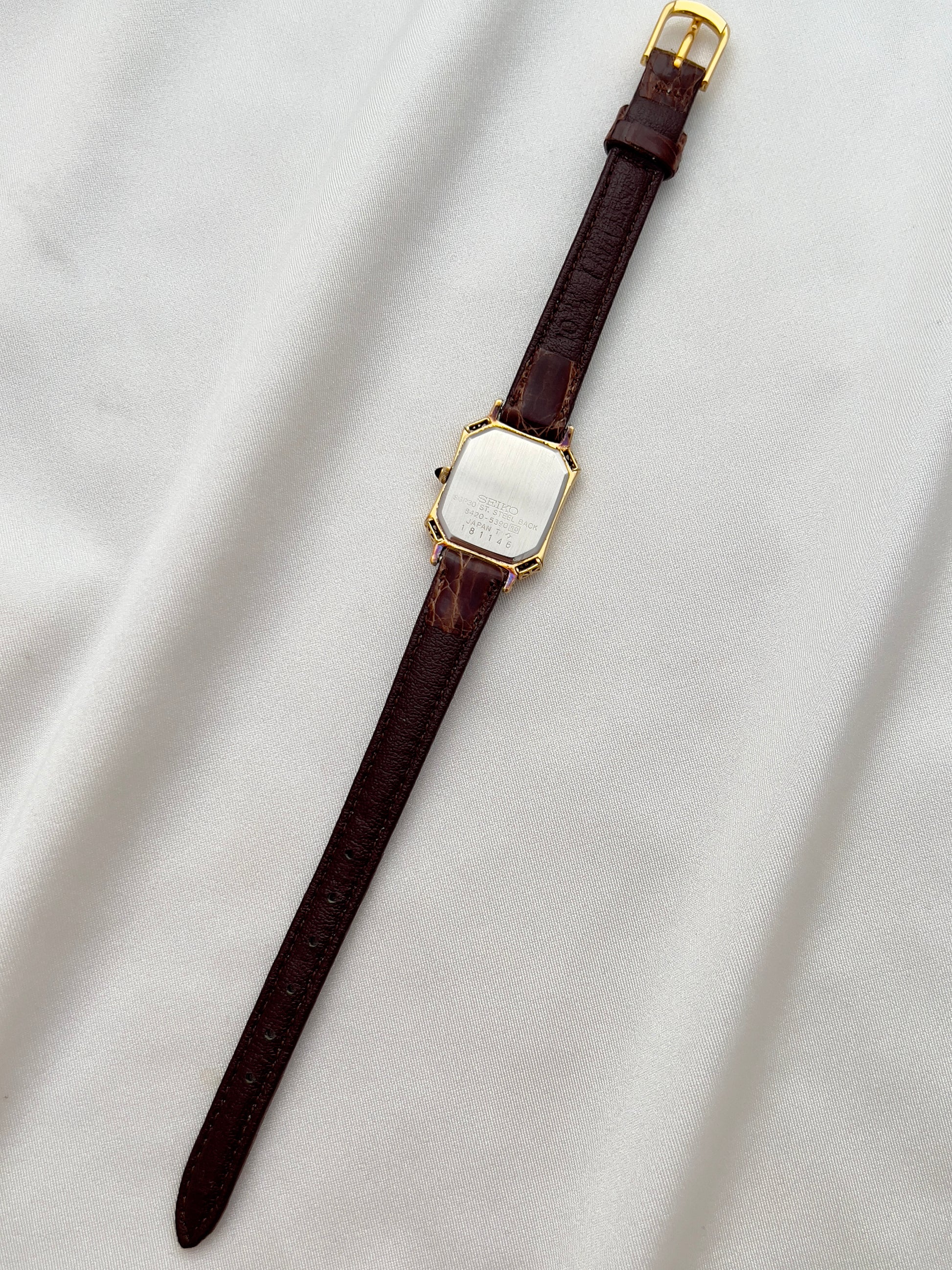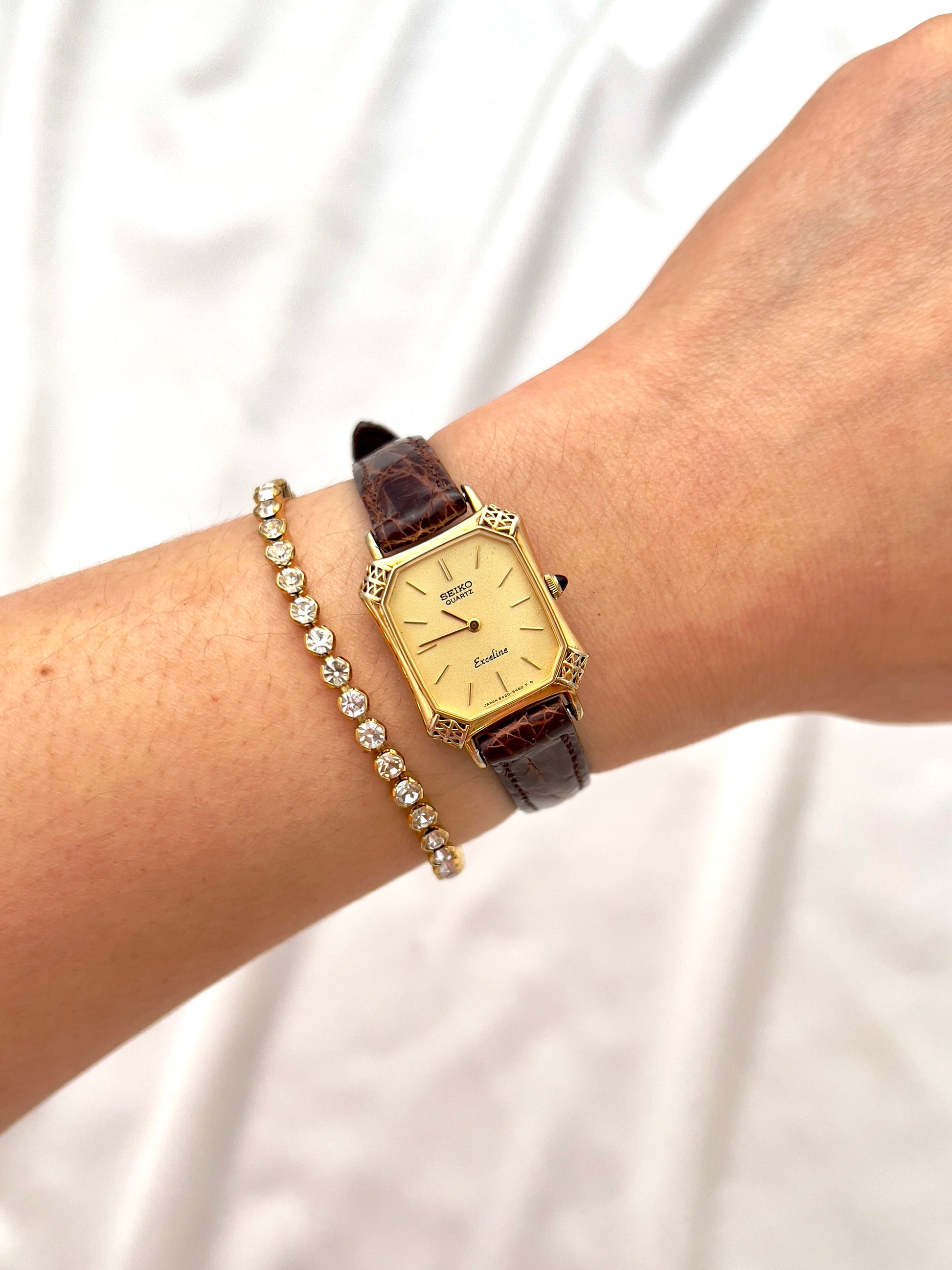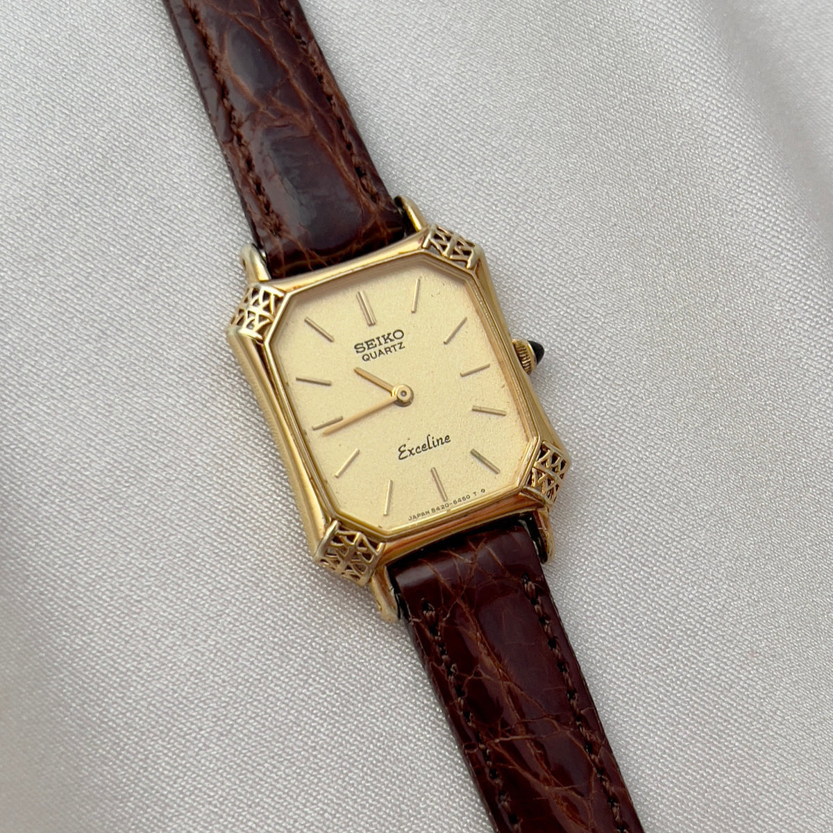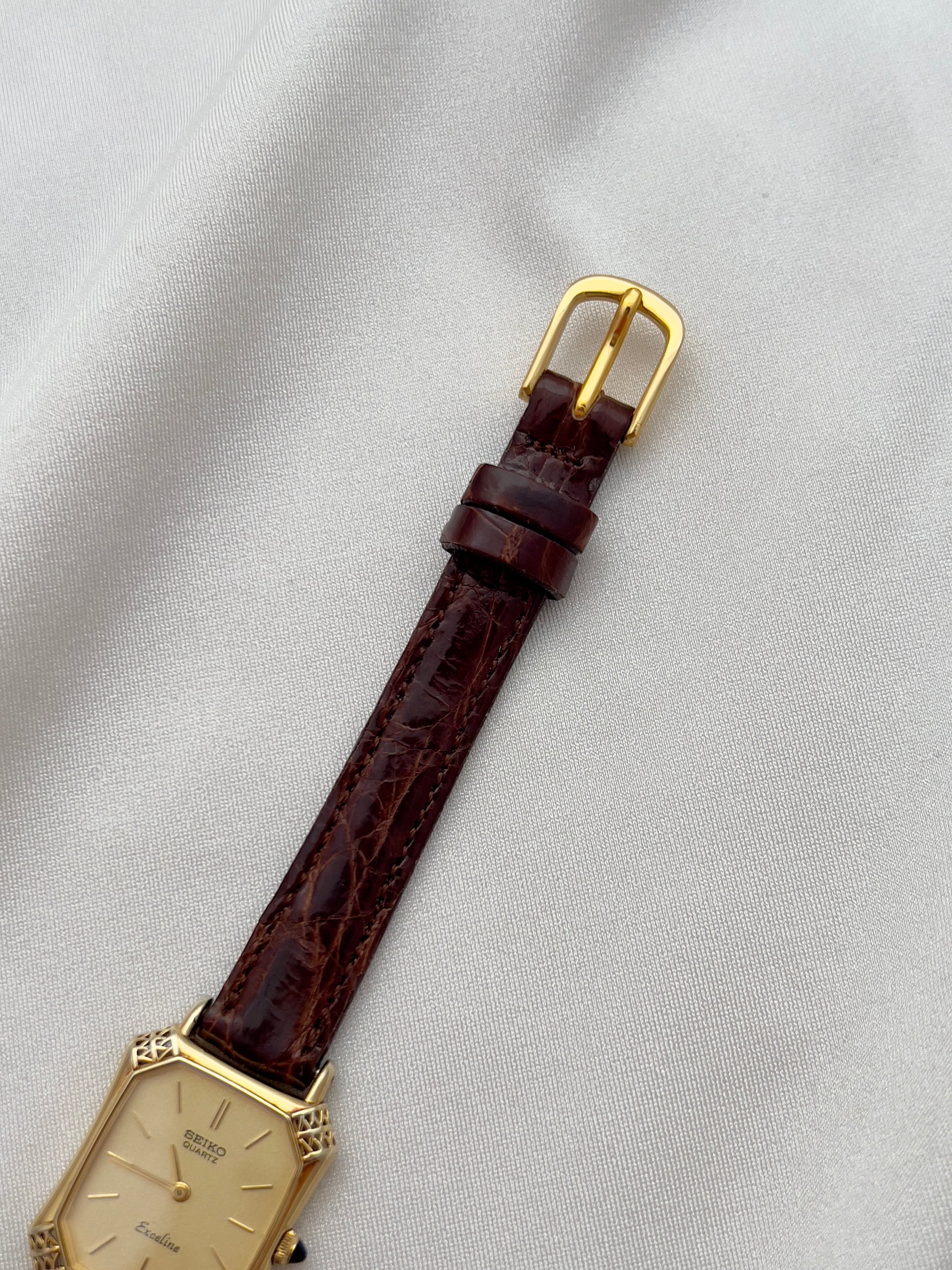 This Seiko Exceline ladies’ watch is a rare example of Japanese craftsmanship meeting European-inspired luxury design. Its gold-tone tank case is elevated with beautifully filigreed, lattice-style corner details that give the watch a jewel-like presence on the wrist. The black cabochon crown adds an extra note of refinement, echoing the elegance of high-fashion Parisian horology.