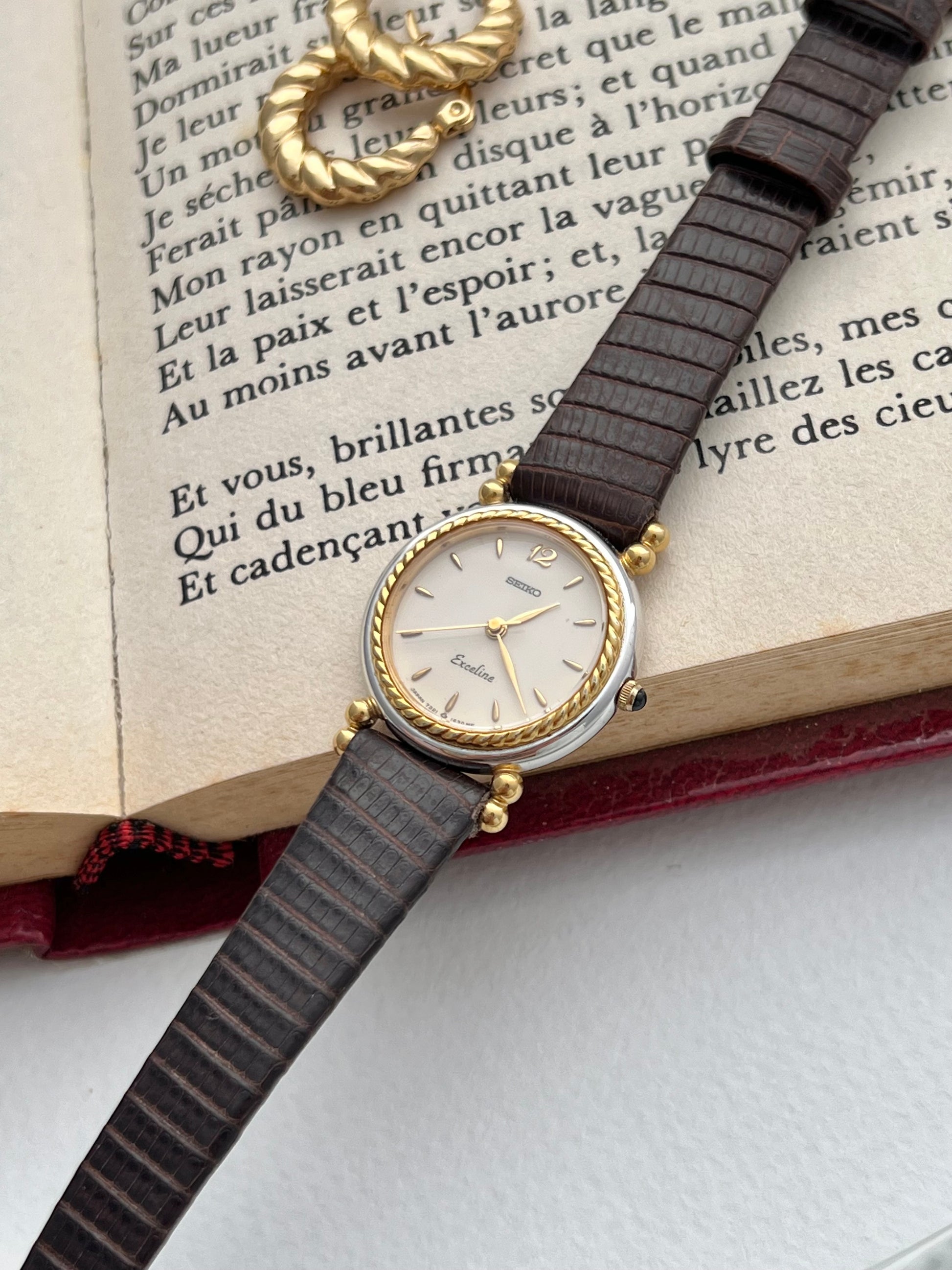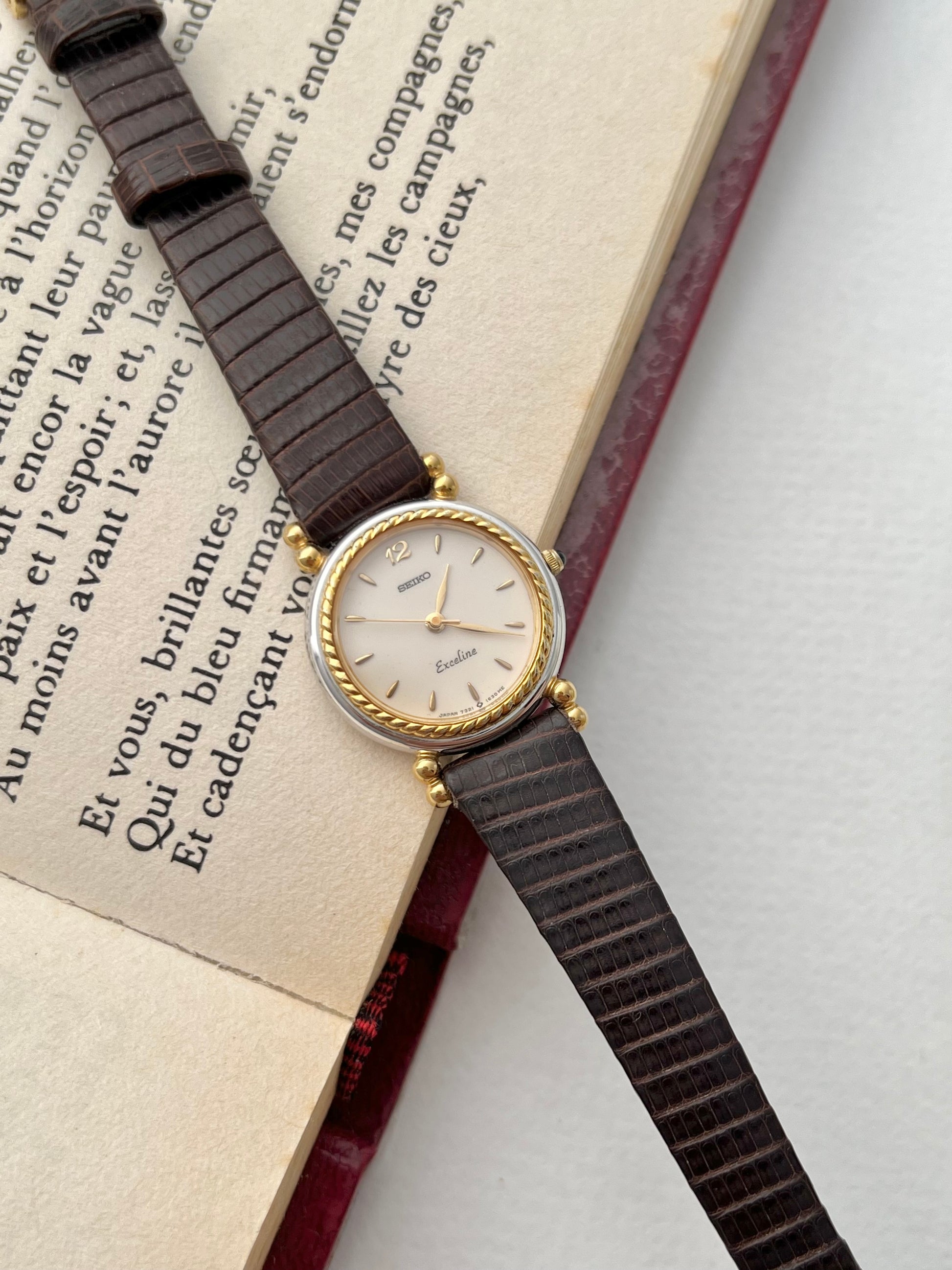 A graceful blend of classic design and subtle opulence, this vintage Seiko Exceline brings an elevated presence to the wrist. Featuring a polished two-tone case with a gold-tone twist-rope bezel and unique gold-accented lugs, the watch is elegantly finished with minimalist gold indices and a distinctive “12” marker on a soft champagne dial.