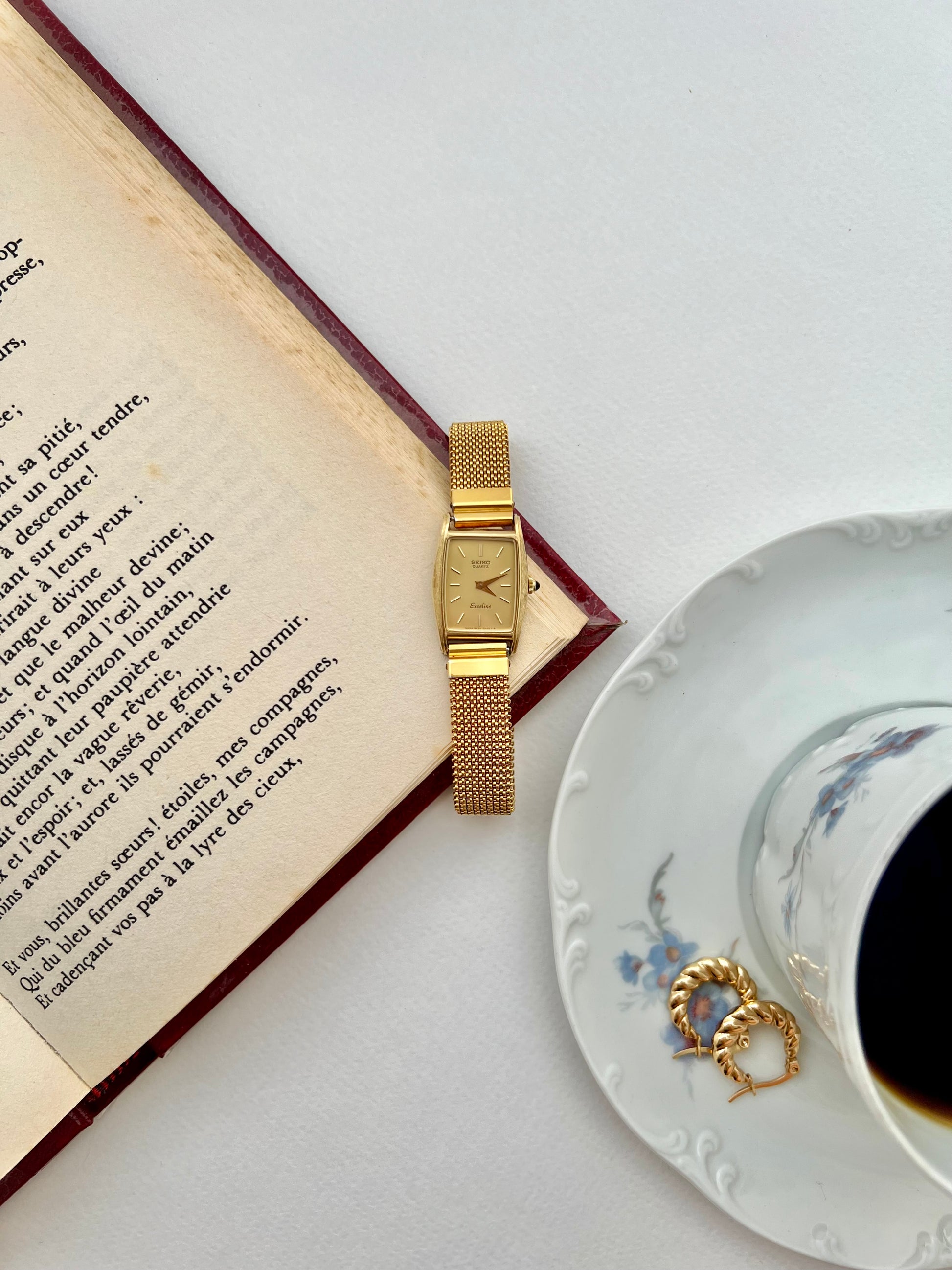 This Seiko Exceline is defined by its sculpted gold tonneau form, a softly elongated case whose textured surface catches light in quiet, deliberate ways. The proportions feel considered and purposeful rather than decorative, giving the watch a sense of presence without ever becoming loud. The dial sits recessed within the case, calm and uncluttered, allowing the warm gold tone to do the talking while slim markers and hands maintain a refined visual rhythm.