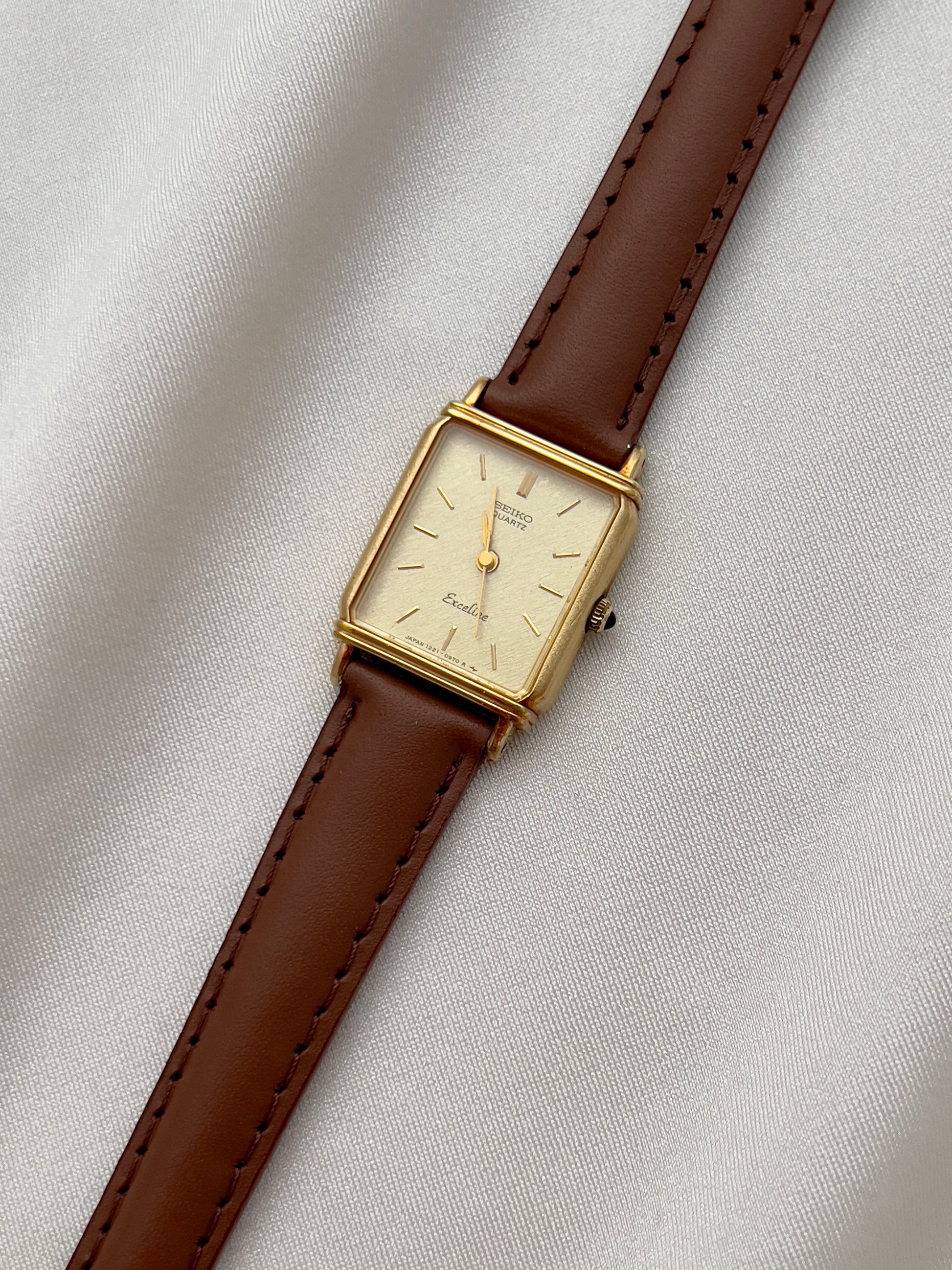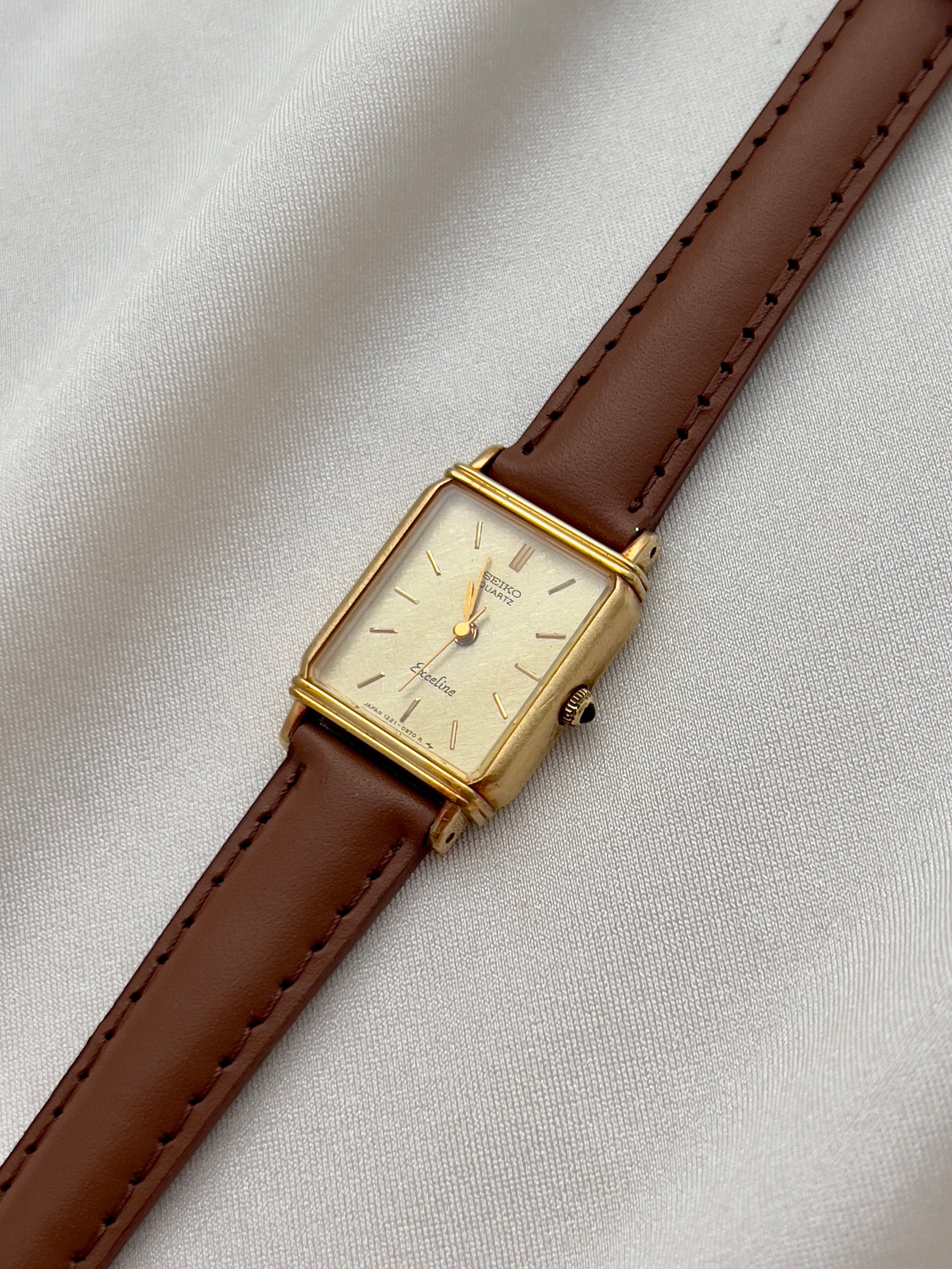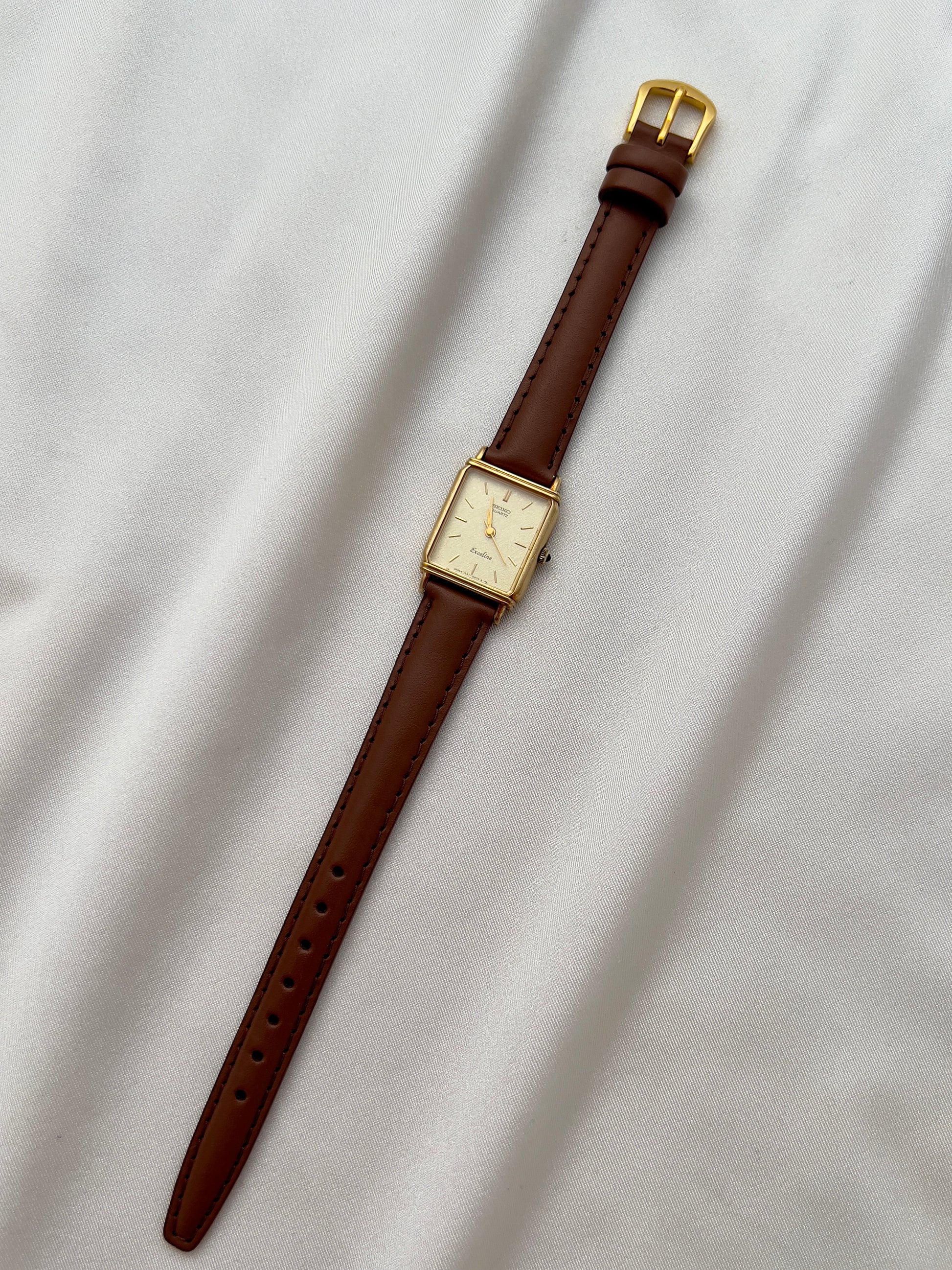 The dial, finished in a soft champagne tone with a textured brushed effect, is accented by minimalist baton markers and slender hands. A hallmark of Seiko’s premium Exceline line, this watch reflects the brand’s dedication to precision and artistry. Paired with a supple brown leather strap, it is the perfect piece for women who appreciate both understated luxury and timeless style.