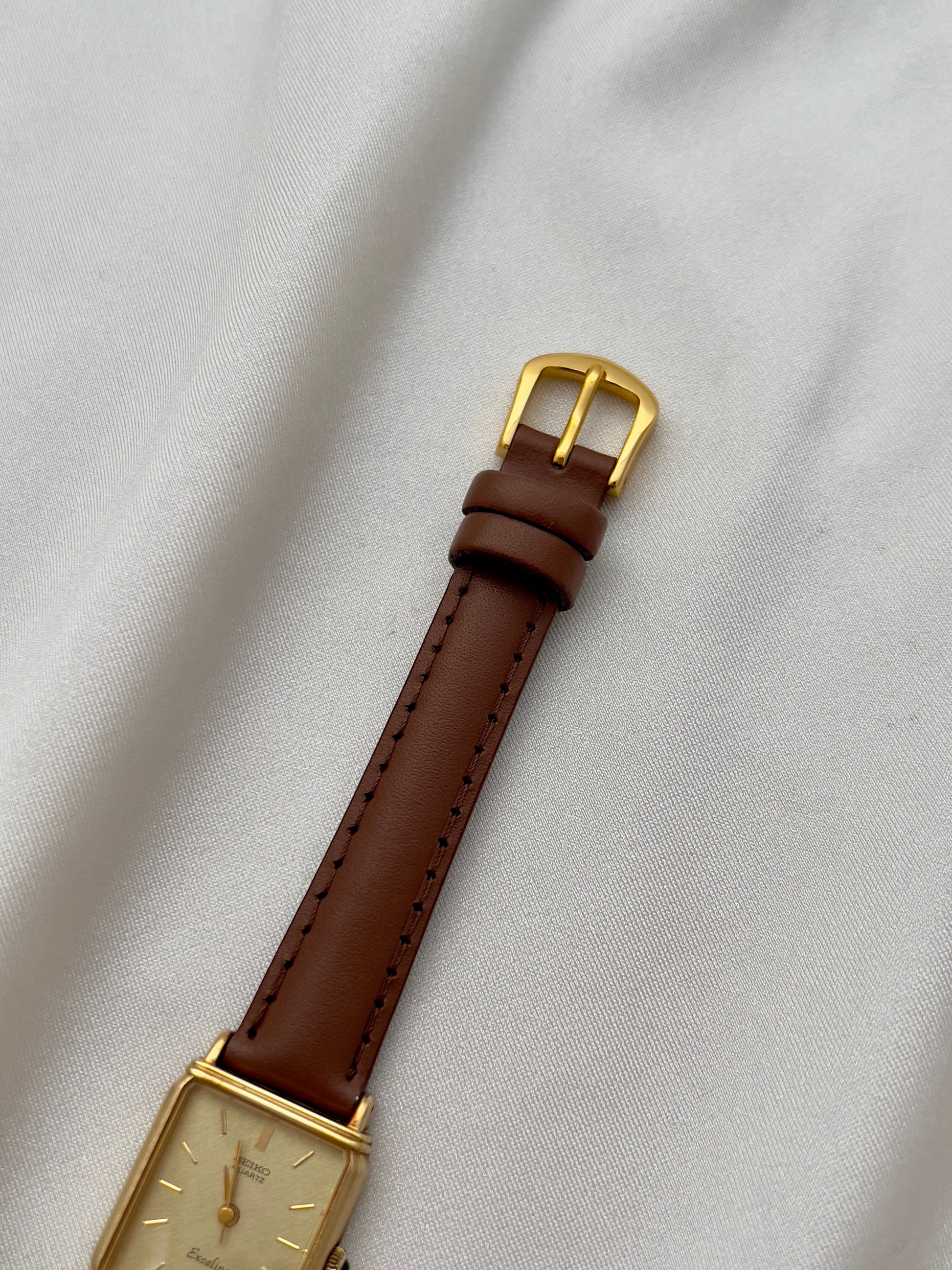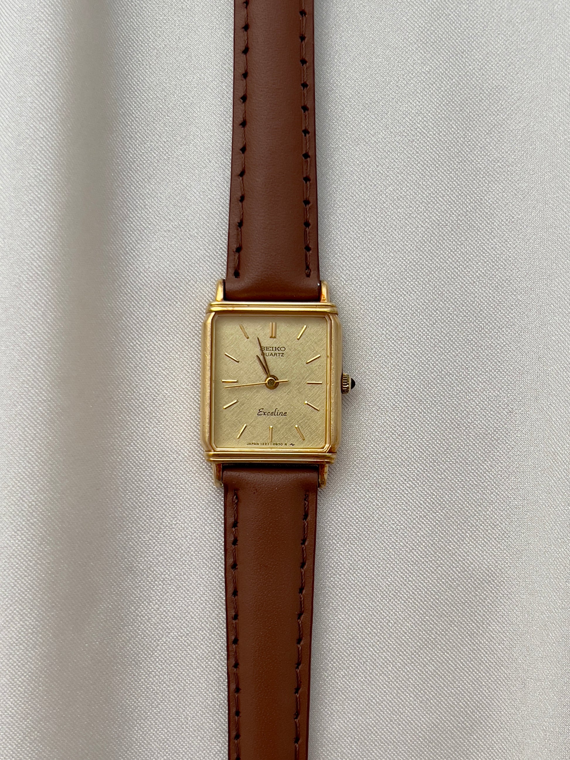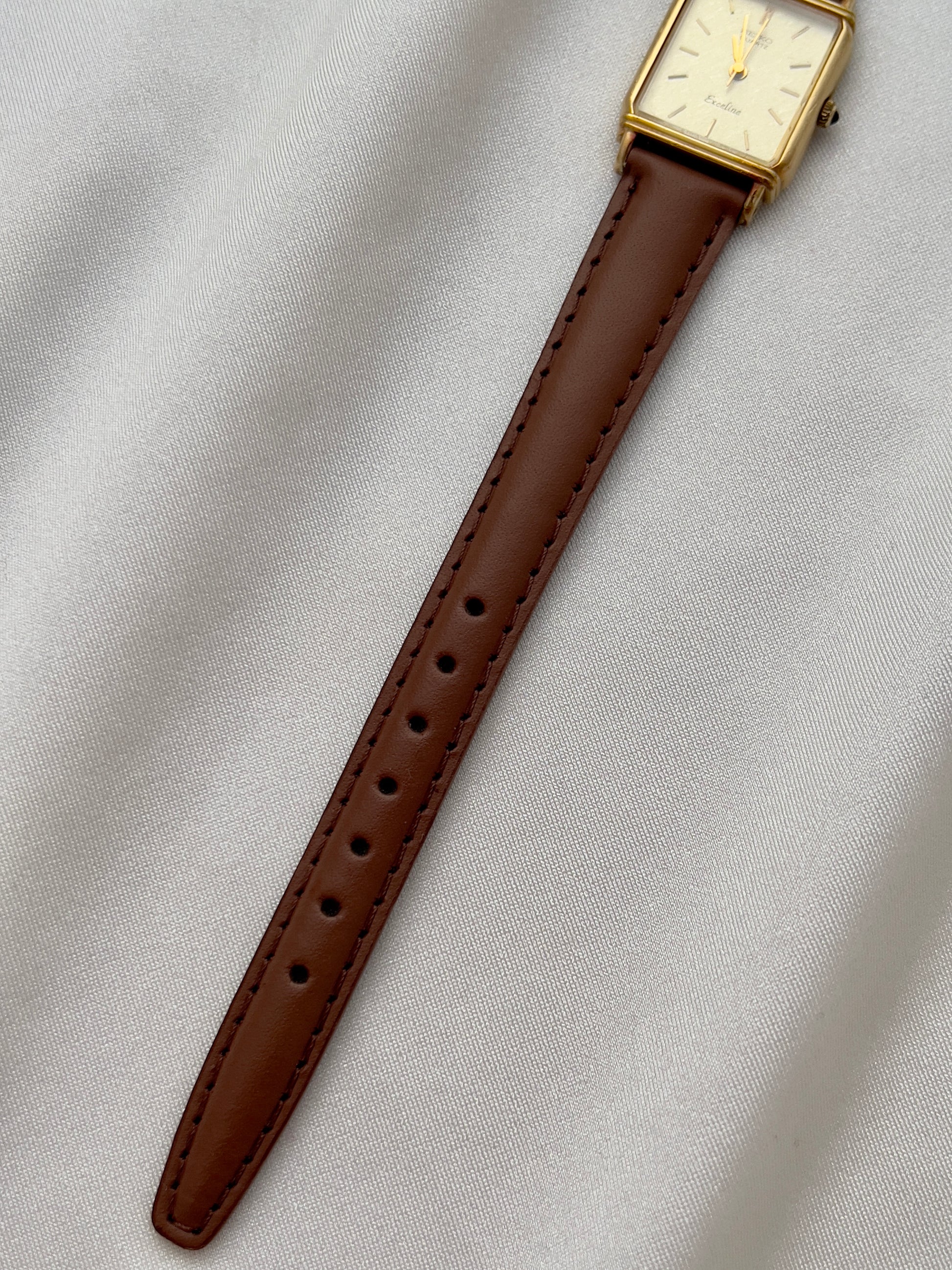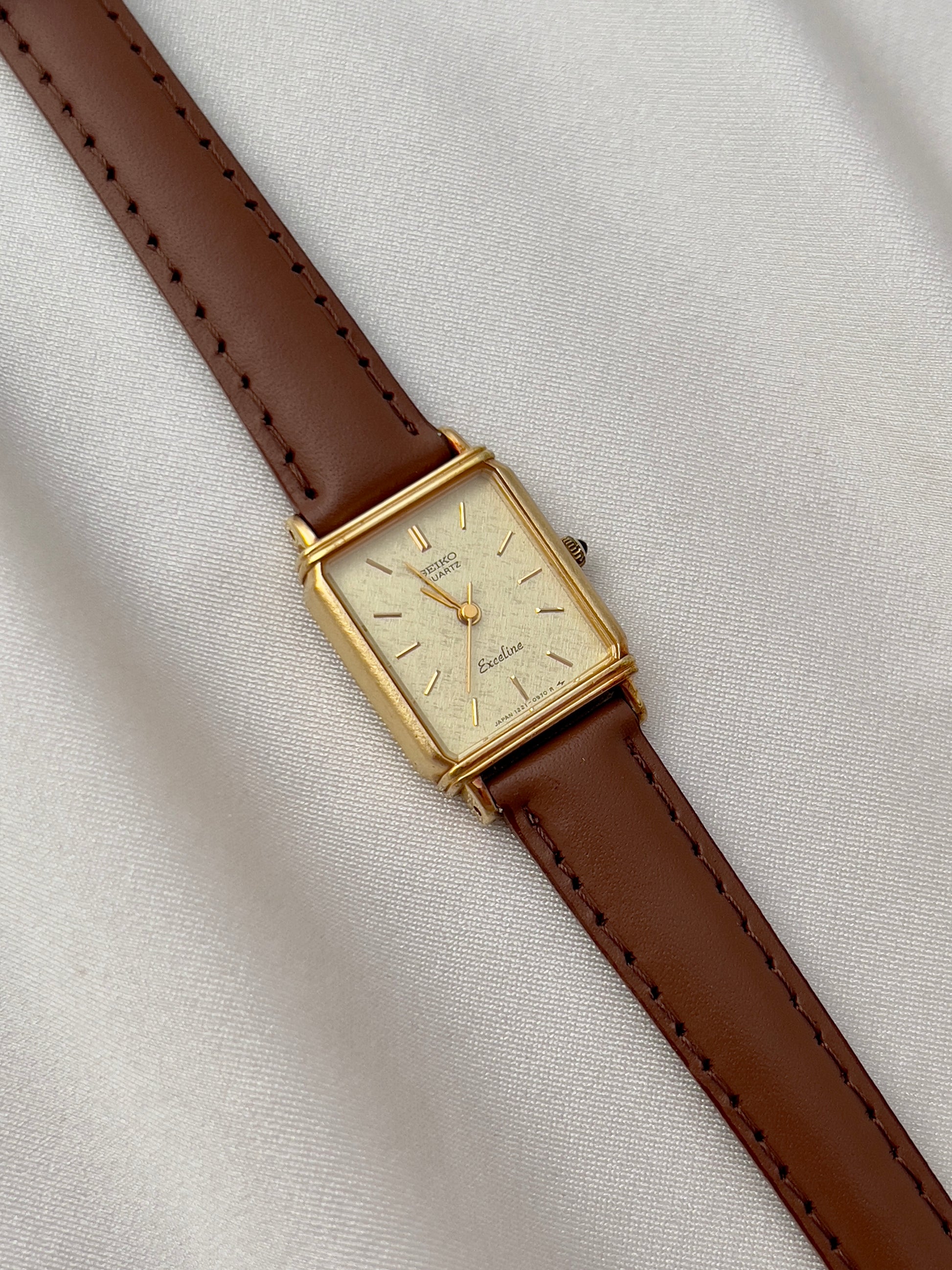 The dial, finished in a soft champagne tone with a textured brushed effect, is accented by minimalist baton markers and slender hands. A hallmark of Seiko’s premium Exceline line, this watch reflects the brand’s dedication to precision and artistry. Paired with a supple brown leather strap, it is the perfect piece for women who appreciate both understated luxury and timeless style.