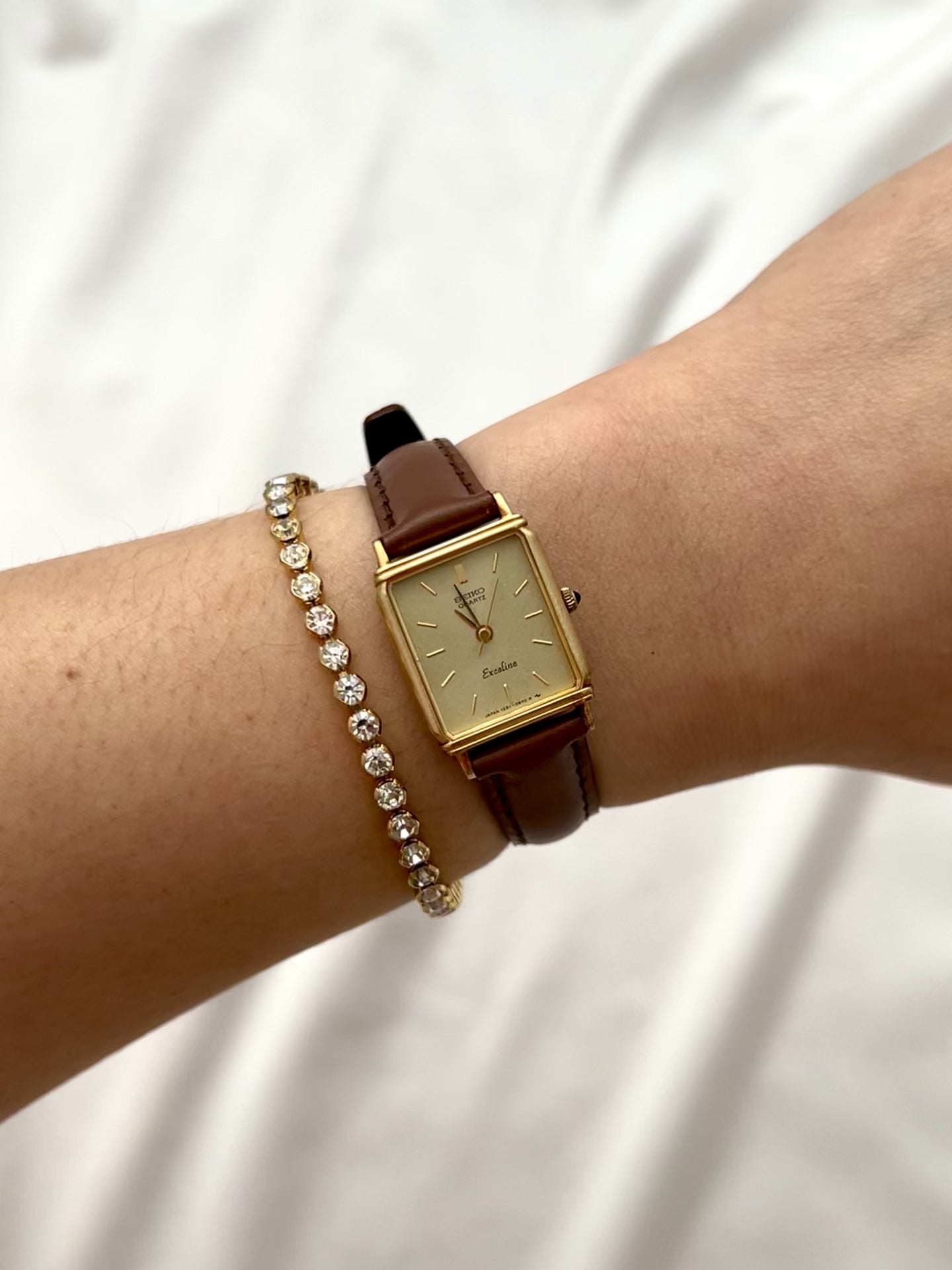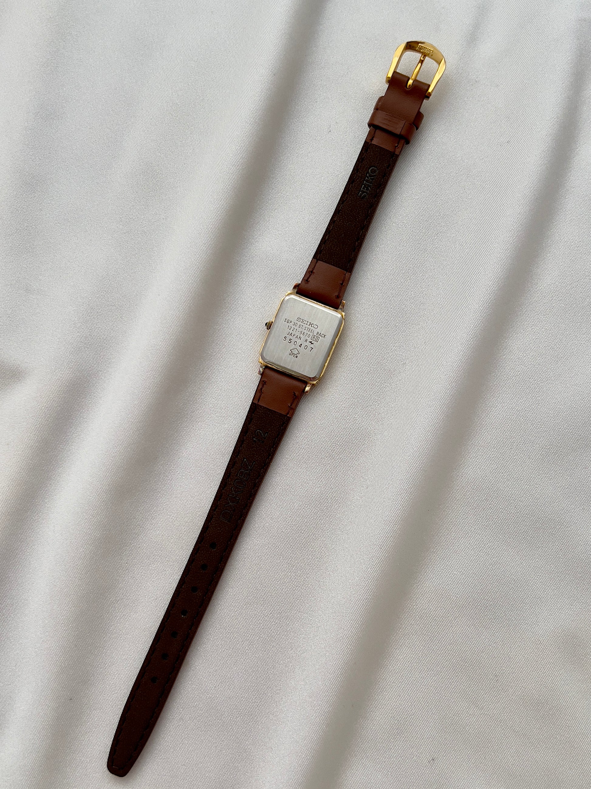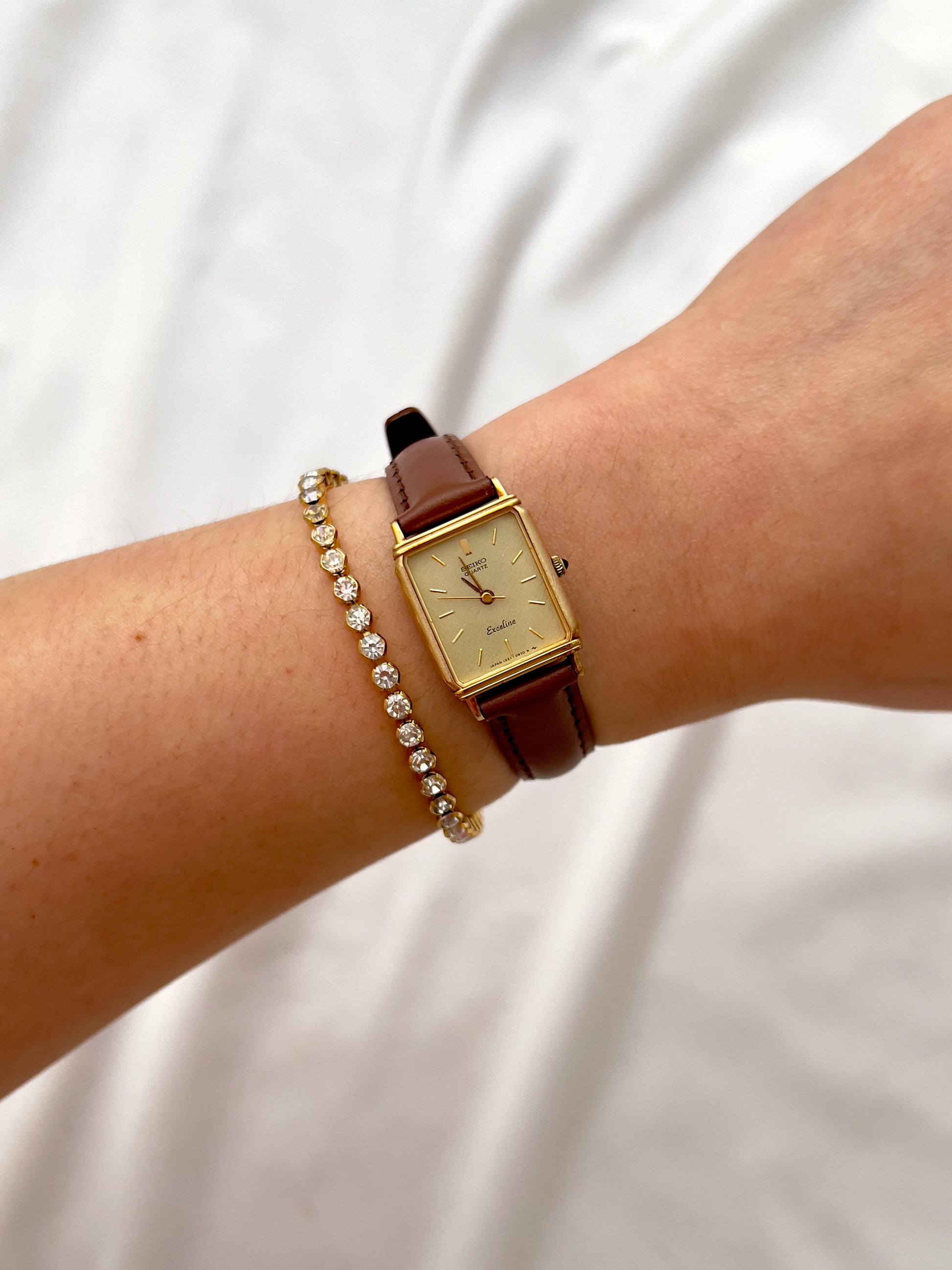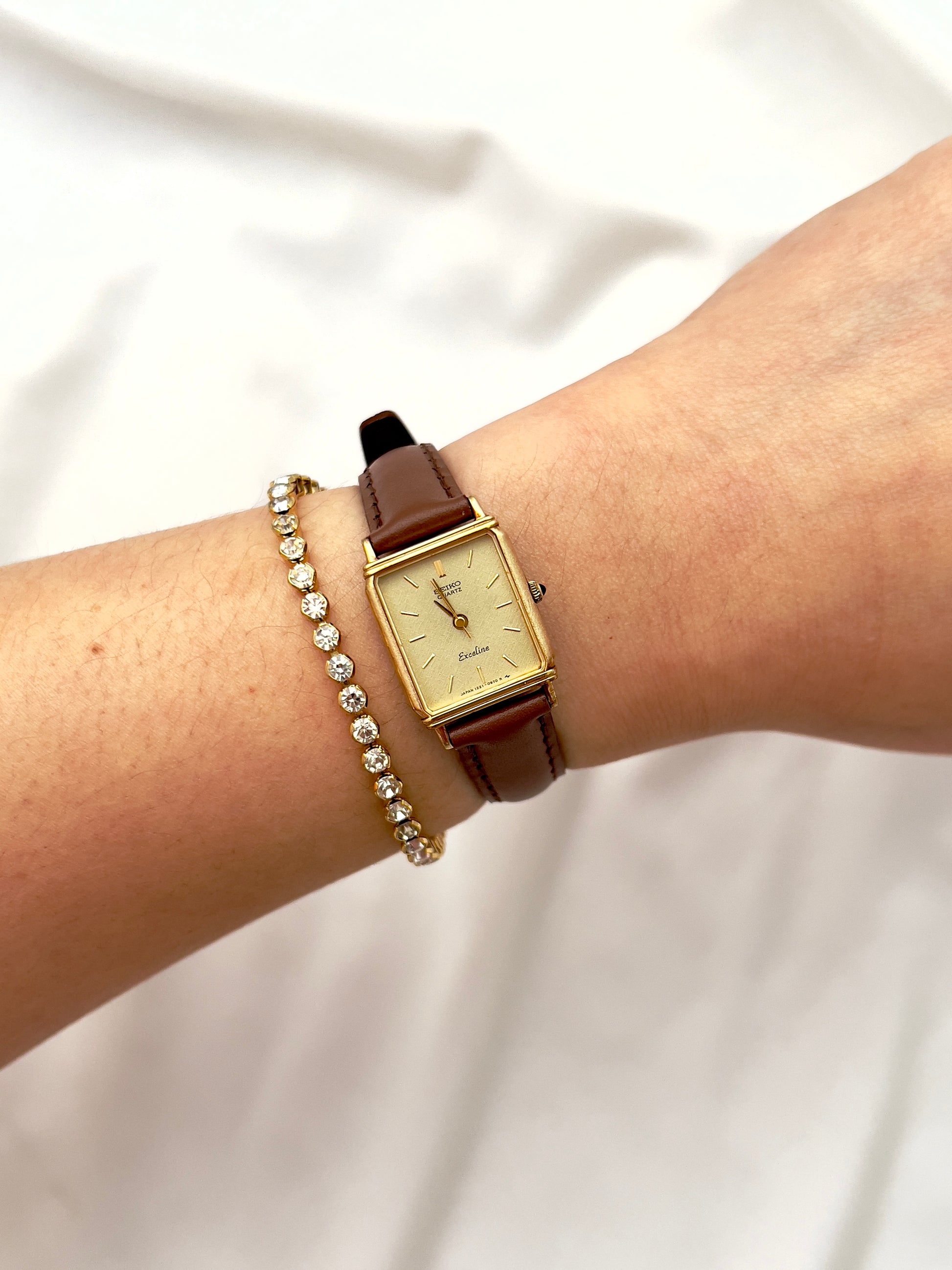 This Seiko Exceline ladies’ tank watch embodies refined vintage elegance with a distinctly feminine charm. Its slim profile ensures comfort, while the structured silhouette gives it a jewel-like presence.