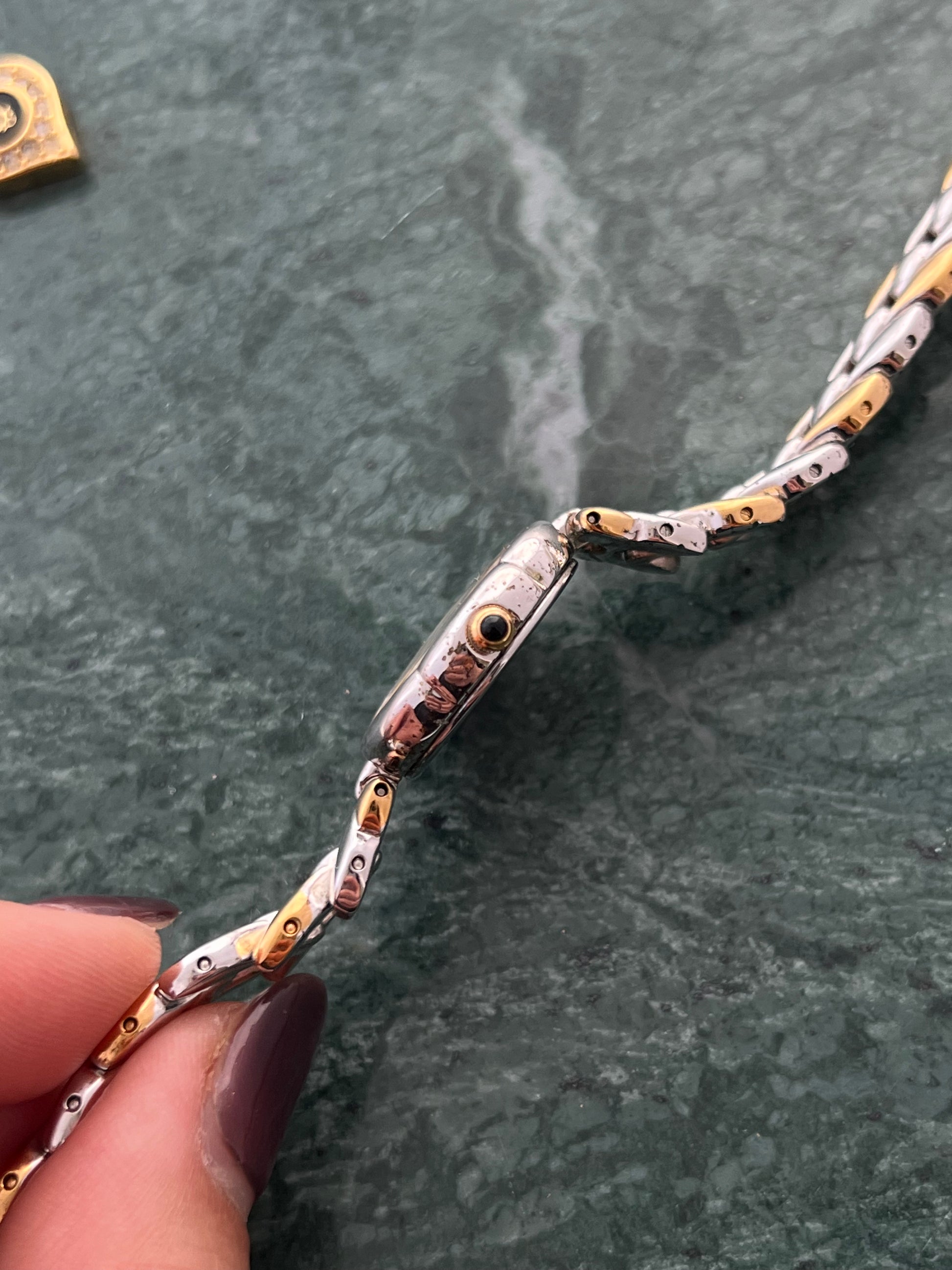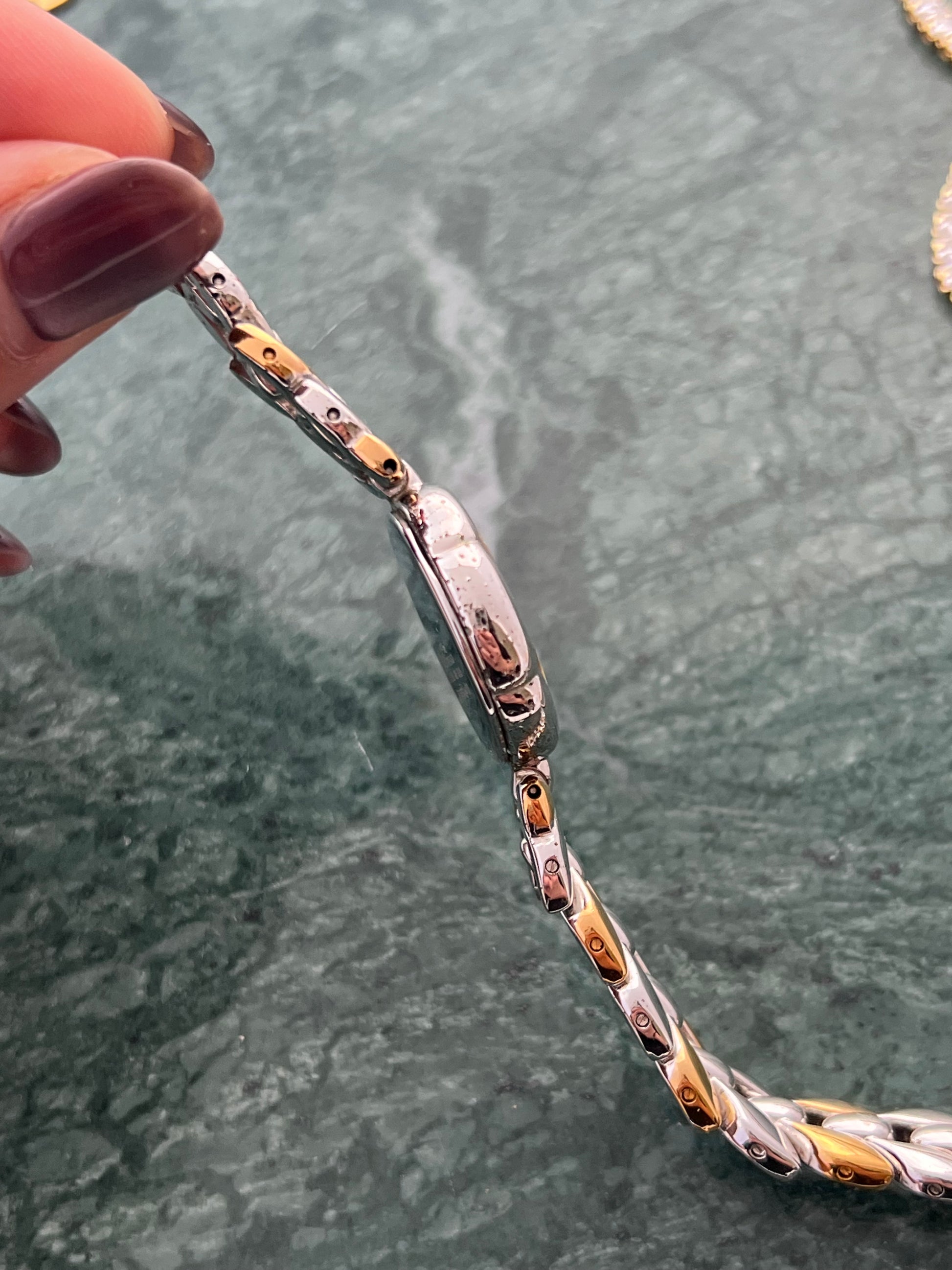 - Two tone scalloped case that mimics a rose petal with a golden bezel